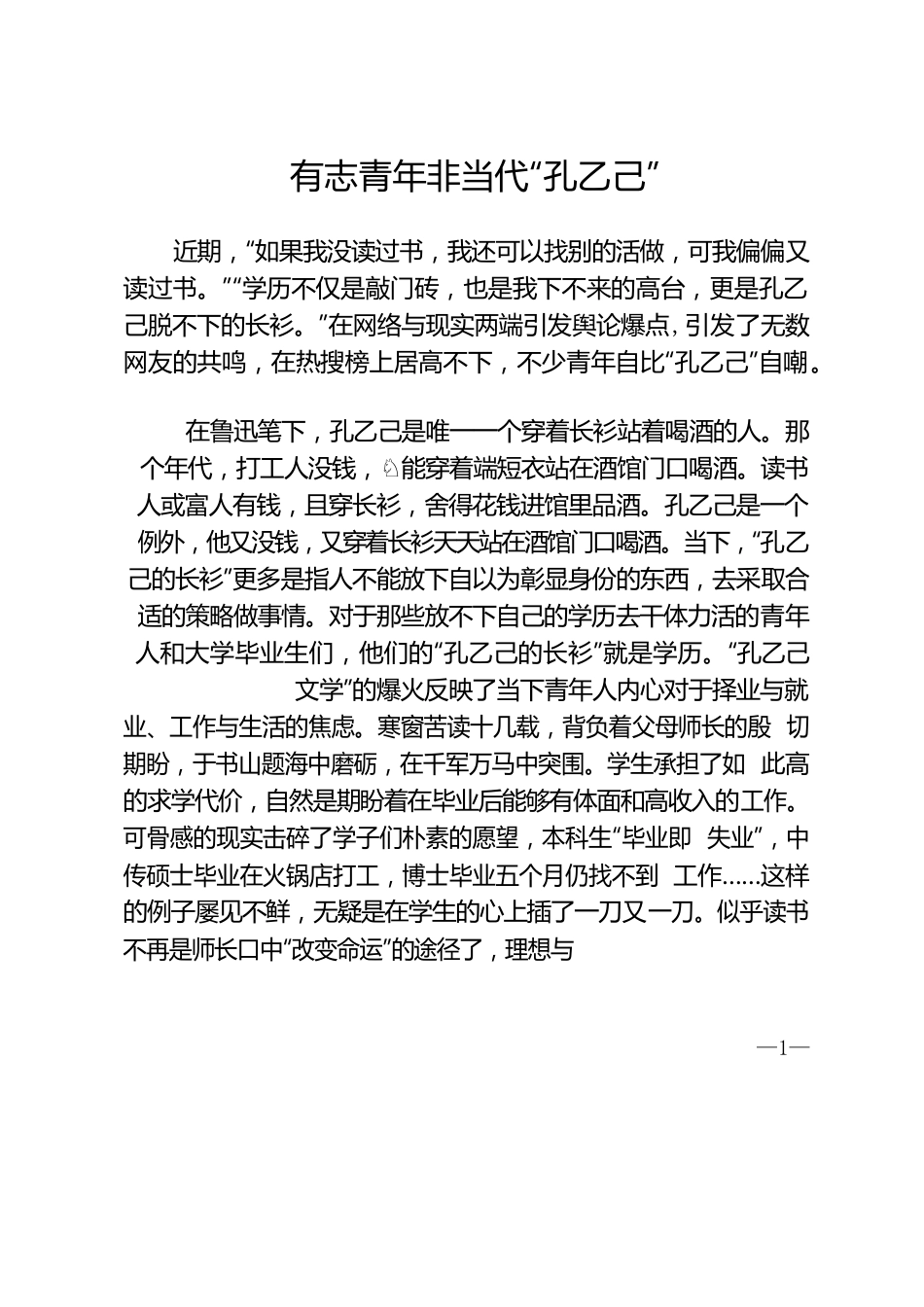 有志青年非当代“孔乙己”近期,“如果我没读过书,我还可以找别的活做,可我偏偏又读过书。”“学历不仅是敲门砖,也是我下不来的高台,更是孔乙己脱不下的长衫。”在网络与现实两端引发舆论爆点,引发了无数网友的共鸣,在热搜榜上居高不下,不少青年自比“孔乙己”自嘲。在鲁迅笔下,孔乙己是唯一一个穿着长衫站着喝酒的人。那个年代,打工人没钱,能穿着端短衣站在酒馆门口喝酒。读书♘人或富人有钱,且穿长衫,舍得花钱进馆里品酒。孔乙己是一个例外,他又没钱,又穿着长衫天天站在酒馆门口喝酒。当下,“孔乙己的长衫”更多是指人不能放下自以为彰显身份的东西,去采取合适的策略做事情。对于那些放不下自己的学历去干体力活的青年人和大学毕业生们,他们的“孔乙己的长衫”就是学历。“孔乙己文学”的爆火反映了当下青年人内心对于择业与就业、工作与生活的焦虑。寒窗苦读十几载,背负着父母师长的殷切期盼,于书山题海中磨砺,在千军万马中突围。学生承担了如此高的求学代价,自然是期盼着在毕业后能够有体面和高收入的工作。可骨感的现实击碎了学子们朴素的愿望,本科生“毕业即失业”,中传硕士毕业在火锅店打工,博士毕业五个月仍找不到工作……这样的例子屡见不鲜,无疑是在学生的心上插了一刀又一刀。似乎读书不再是师长口中“改变命运”的途径了,理想与—1—现实的巨大落差和十几年苦读的沉没成本,让人如何不怨?许多青年自比“孔乙己”也是为了排解心中的不安和对未来的惶恐。一方面,社会上仍普遍将大学教育和精英教育画等号,“万般皆下品,惟有读书高”的思想演化至今形成了“上了大学就有高收入工作”的错误观念,家人的无法理解,社会上对于服务类职业的认同缺失,都成为青年人择业时遇到的阻碍。另一方面,许多处于择业十字路口的大学生没有充分认识到就业形势的变化,自身除一纸学历外一无所长,内心又无法接纳“高开低走”的自己,摆脱不了世俗定义的成功失败。高等教育大众化、国民教育素质的普遍提高,这些都为孔乙己文学的走红奠定基础,但择业思想也需与时俱进,否则青年人势必陷入“孔乙己”般进退两难的境地。感慨之余,青年们不能一味地沉湎于“长衫之叹”。与其陷在孔乙己文学中自怨自艾,不如积蓄力量改变现状,思考如何在空闲时间学习实际的技能,来适应市场环境。努力奋斗依然是这个时代的主旋律。作为青年人,我们应该树立正确的价值观和就业观,摆平心态,平等看待每份职业。早前在网络引起热议的北大博士当城管、高校毕业生送外卖等话题,许多人感叹“大材小用、身段掉价”,认为高学历不该去做基层工作,这其实是在戴着有色眼镜给不同职业划分高低贵贱,无视了当事人的个人选择。我们应该认识到,发挥自身价值比工作的城市、岗位和头衔更加意义深远。比如近期有不少高校毕业生回到家乡开餐馆、经—2—营农场、直播带货,用自己的专业特长助力乡村振兴。这种冲破学历崇拜陈旧观念的做法,更有利于形成开放包容的就业环境。脱下“长衫”并不意味着低人一等,而是对自己前进方向的重新审视。读书可以服务未来的工作,帮助我们更好地生活,但它绝不是用来给人划分等级的标签。人生是曲折向前的,挫折和困难总是与我们相伴,我们不可能一生平步青云,也不可能一路一马平川,更不会一辈子一帆风顺。对于就业和人生的不如意,我们要正确看待劳动才能体现读书的意义,要正确认识自己才能明白人生的真谛。我们在正视就业焦虑的同时,更应该审视自己,学会与自己和解,才能卸下包袱与枷锁轻装向前。孔乙己的长衫,指的本就不是他书生的身份,而是他仰仗书生身份好吃懒作、自以为高人一等的迂腐心态,教育的目的在于给人更多更好的选择。但是好的事物从来都不可能轻松、容易得到。青年兴则国家兴,青年强则国家强。当代有志青年有理想、有本领、有担当,绝不会被困在长衫中,在这个机遇与挑战并存的时代,青年们更应砥砺奋进,肩负起时代使命,何须自诩“孔乙己”。—3—