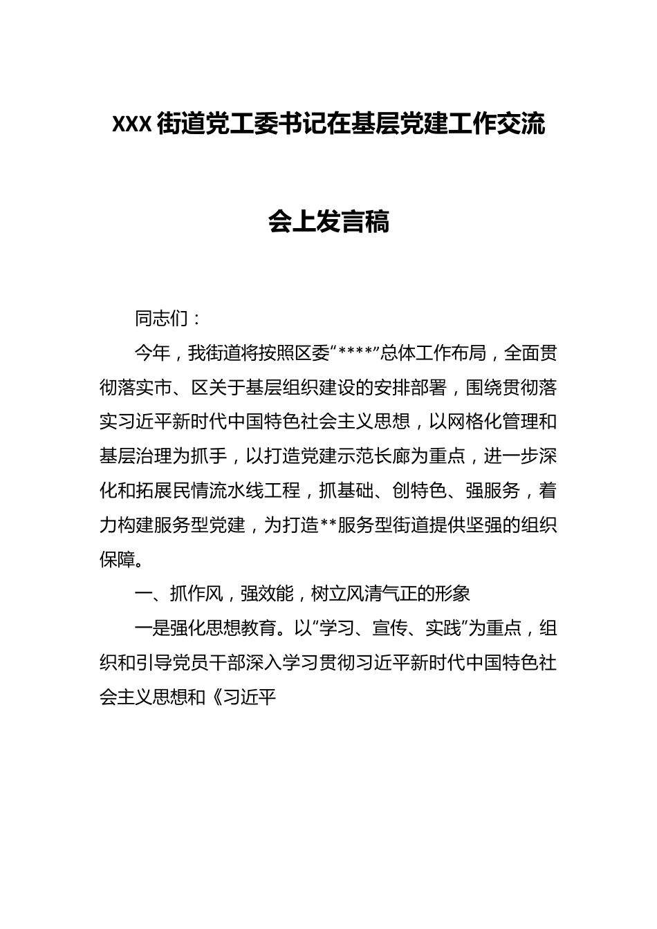 XXX街道党工委书记在基层党建工作交流会上发言稿同志们:今年,我街道将按照区委“****”总体工作布局,全面贯彻落实市、区关于基层组织建设的安排部署,围绕贯彻落实习近平新时代中国特色社会主义思想,以网格化管理和基层治理为抓手,以打造党建示范长廊为重点,进一步深化和拓展民情流水线工程,抓基础、创特色、强服务,着力构建服务型党建,为打造**服务型街道提供坚强的组织保障。一、抓作风,强效能,树立风清气正的形象一是强化思想教育。以“学习、宣传、实践”为重点,组织和引导党员干部深入学习贯彻习近平新时代中国特色社会主义思想和《习近平谈治国理政》的新思想、新观点和新论断,广泛开展“进社区、进企业、进校园”,确保活动有序开展,顺利推进。二是强化效能建设。在干部纪律方面,严格落实干部考勤、值班、请销假、考核、问责等一系列规章制度,规范干部的行为。在工作作风方面,扎实开展作风整改行动,对工作中存在的问题及时进行梳理和归纳,坚持做到一般问题即知即改,突出问题限时整改,特殊问题分阶段整改,着力解决机关干部存在的问题。在工作实效方面,树立“马上办、主动办、上门办、透明办、务实办”服务理念,结合扶贫攻坚行动,积极开展联系帮扶工作。通过宣传政策、解疑答惑、爱心扶助等方式,为帮扶户解决就业、就学、就医等实际困难。三是强化廉政建设。要切实抓牢靠实党的主体责任,认真履行党风廉政建设责任制和省市区委若干规定,强化干部廉洁自律,厉行勤俭节约,反对铺张浪费积极开展廉政教育活动,努力努力打造政治坚定、素质优良、真抓实干、雷厉风行的干部队伍。二、抓特色,创品牌,增强为民服务的本领一是网格化管理再上新台阶。进一步加强网格化管理服务,建立网格化数字管理平台,完善和拓展网络化“六百”服务工作,促进全数字管理系统,实现管理无缝隙,服务全方位。运用网格化管理工作的理念与现代信息技术相结合,建立覆盖基层党建、综治维稳、社会保障、城市管理医疗卫生、环境整治、文化教育等方面的信息网络。同时结合“网格化”管理和联系帮扶工作的进一步开展,排查并帮扶真正困难的家庭,全面提升辖区群众的安全感和满意度二是大工委协调解决新问题。根据“条块结合、资源共享、优势互补、共驻共建”的原则,建立健全街道大工委制,形成资源共享、互通有无、集中力量办大事的良好局面。街道社区党组织和驻辖区单位相互协作,相互提供服务,实现在参与中理解、在参与中双赢。通过社区“兼职委员”制的实施,与驻区单位联合成立志愿者服务队伍,共同解决因协调机制不健全而无力解决的重大问题。三是错时服务构建新平台。从加强和创新社会管理入手,通过建立科学的轮岗串休机制,合理设置和调整社区办公时间,实行错时服务工作制,使服务社区居民实现“无缝隙对接”。同时建立“错时服务”、“代理服务”、“预约服务”、“上门服务”等服务机制,实行“你上班,我在岗;你休息,我还在岗”的工作制度,保证街道社区每天24小时都有人值班,形成“全天候、全方位、全覆盖”的服务新格局。四是品牌化推进党建新路子。按照“一社区一特色一品牌”的工作思路,以创建党建示范长廊为重点,以深化和拓展民情流水线为主线,全力打造党建服务品牌。**社区党建qq群和手机飞信业务,积极搭建党建信息平台;**社区搭建“五线”,拓展“五民”工程,全面推行“**学校”***家政服务;**社区继续*全面推动360为民服务代办点工作,实现全程代办“一路通”。**社区以打造“三会两线”网格化为民体系为目标,进一步整合各类资源,抓管理、强服务、促共建,重帮扶,切实解决居民群众最关心、最直接、最现实的问题。三、强基础,创示范,提升基础建设的能力一是加强阵地建设。按照“便民、利民、为民”的思路,通过向上争取资金和政策扶持,整合利用现有资源,不断加强社区办公阵地建设,实施社区办公和活动场所新建工程。投资*万,拟建框架结构*层,面积*平方米**社区办公阵地,以便满足社区发展的需要。二是创建示范社区。按照“重点倾斜,集中扶持”的思路,积极整合利用各种项目和资金,确定**社区、**社区、**社区为党建工作示范社区。从...