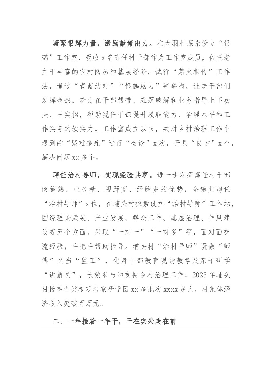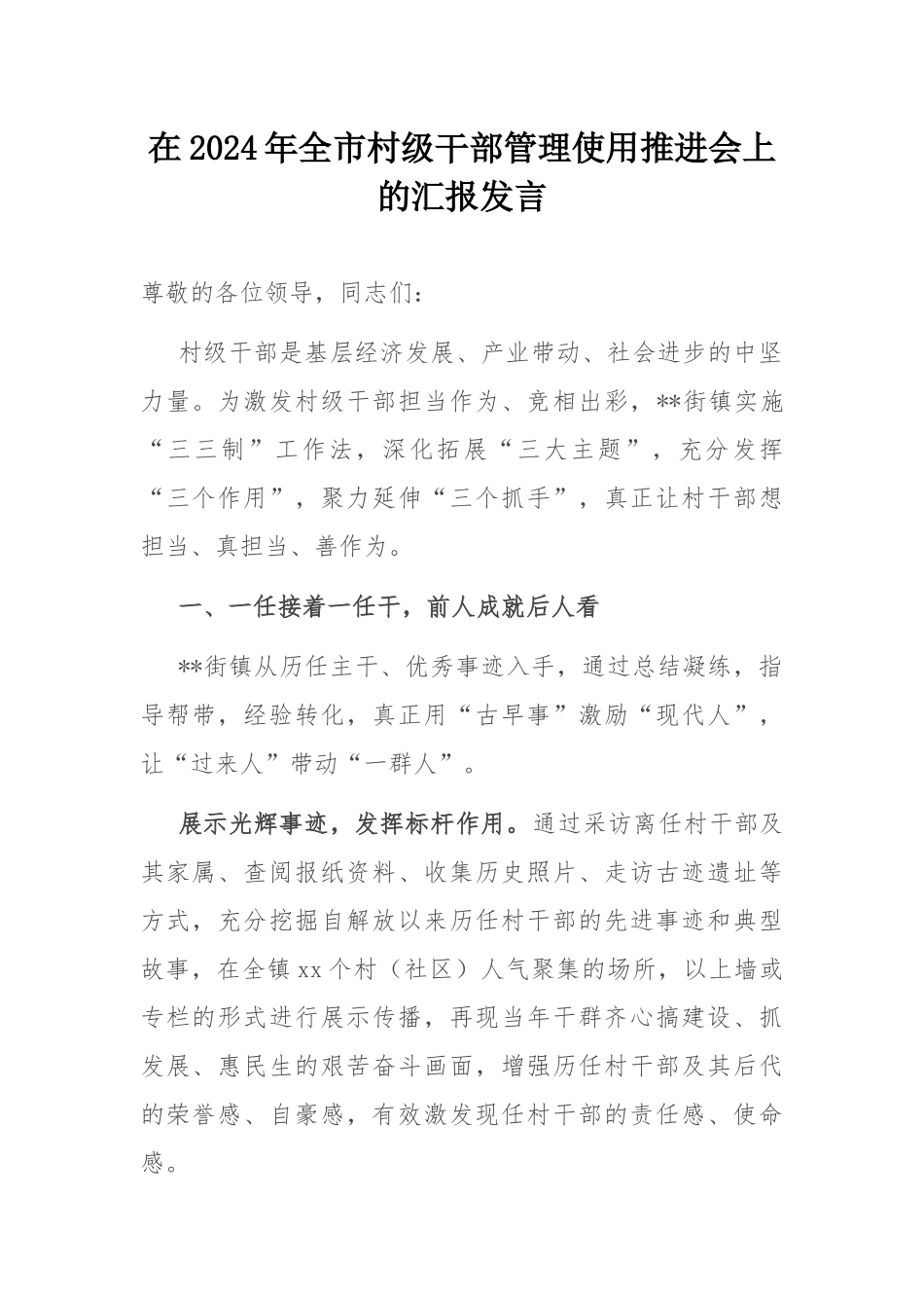 在2024年全市村级干部管理使用推进会上的汇报发言尊敬的各位领导,同志们:村级干部是基层经济发展、产业带动、社会进步的中坚力量。为激发村级干部担当作为、竞相出彩,**街镇实施“三三制”工作法,深化拓展“三大主题”,充分发挥“三个作用”,聚力延伸“三个抓手”,真正让村干部想担当、真担当、善作为。一、一任接着一任干,前人成就后人看**街镇从历任主干、优秀事迹入手,通过总结凝练,指导帮带,经验转化,真正用“古早事”激励“现代人”,让“过来人”带动“一群人”。展示光辉事迹,发挥标杆作用。通过采访离任村干部及其家属、查阅报纸资料、收集历史照片、走访古迹遗址等方式,充分挖掘自解放以来历任村干部的先进事迹和典型故事,在全镇xx个村(社区)人气聚集的场所,以上墙或专栏的形式进行展示传播,再现当年干群齐心搞建设、抓发展、惠民生的艰苦奋斗画面,增强历任村干部及其后代的荣誉感、自豪感,有效激发现任村干部的责任感、使命感。凝聚银辉力量,激励献策出力。在大羽村探索设立“银鹤”工作室,吸收x名离任村干部作为工作室成员,依托老主干丰富的农村阅历和基层经验,试行“薪火相传”工作法,通过“青蓝结对”“银鹤助力”等举措,让老干部们发挥余热,着力在干部帮带、难题破解和业务指导上下功夫、出实招,帮助现任干部提升履职能力、治理水平和工作实务的软实力。工作室成立以来,共对乡村治理工作中遇到的“疑难杂症”进行“会诊”x次,开具“良方”x个,解决问题xx多个。聘任治村导师,实现经验共享。进一步发挥离任村干部政策熟、业务精、视野宽、经验多的优势,全镇共聘任“治村导师”x位,在埔头村探索设立“治村导师”工作站,围绕理论武装、产业发展、群众工作、基层治理、作风建设等五个方面,采取“一对一”“一对多”等,面对面交流经验,手把手帮助指导。埔头村“治村导师”既做“师傅”又当“监工”,化身干部教育现场教学及亲子研学“讲解员”,长效参与和支持乡村治理工作,2023年埔头村接待各类参观考察研学团xx多批次xxxx多人,村集体经济收入突破百万元。二、一年接着一年干,干在实处走在前**街镇引导现任村干部对标前任比作为、比成效,各村(社区)之间对标优秀比担当、比拼劲,全镇上下形成互争互学、比学赶超的浓厚氛围。承诺亮诺表初心。坚持“目标有纲可考”,以五年任期目标为总纲,全面推行年度目标和岗位目标责任制,每年春节后上班第一时间召开全镇村(社区)干部大会,会上各村(社区)书记们对全年工作计划和x件以上“我为群众办实事”项目,立下“军令状”,排出时间表,列出线路图,进行公开承诺表态,敦促村干部真抓实干、争先进位力争实事办到位、好事办出彩。践诺履诺促担当。坚持“工作有手可抓”,紧盯全年工作目标、重点任务清单和民生实事项目,各村(社区)“立言立行、践诺见效”,进一步细化量化。有针对性地分解出“发展争强、党建争先、民生争优、环境争美、管理争效、赶超争位”等6方面内容,每方面内容精选2—3个“切口小、接地气、可落实”的任务事项,将全年压力转化为日常动力,按季度刷新进度、赛马比拼,年终抓闭环落实、总结评星,激励村干部跑起来、抢时间、争一流。评诺晒诺强作为。坚持“绩效有据可查”,扎实开展党组织书记抓基层党建述职评议,并与年度考核、表彰推荐绩效奖励等相结合,按照“开展述职、民主测评、个别谈话、实地核实、确定等次、公示反馈、结果运用”等程序进行全面考评,考核结果与晋升、职级、薪资待遇等挂钩让各村(社区)看清标兵追兵,找准差距不足,进一步鞭策履职尽责;同时,让实绩说话,参照“3+1”实绩公示做法,各村(社区)精选本年度最满意的“发展项目、民生实事、荣誉奖励”等三项内容在公开栏进行晾晒,最不满意的一项工作及原因剖析,各村(社区)书记需在党建述职中作出说明并明确改进措施。三、一届接着一届干,一张蓝图绘到底**街镇实施“雏雁计划”,不断为村级干部队伍充实新鲜血液、积蓄后备力量,推动薪火传承,共绘蓝图。精准选配,构筑“人才库”。坚持聚焦年龄、学历等结构要求,多渠道拓宽选拔路径,采取个人自荐、群众举荐组织推荐的...