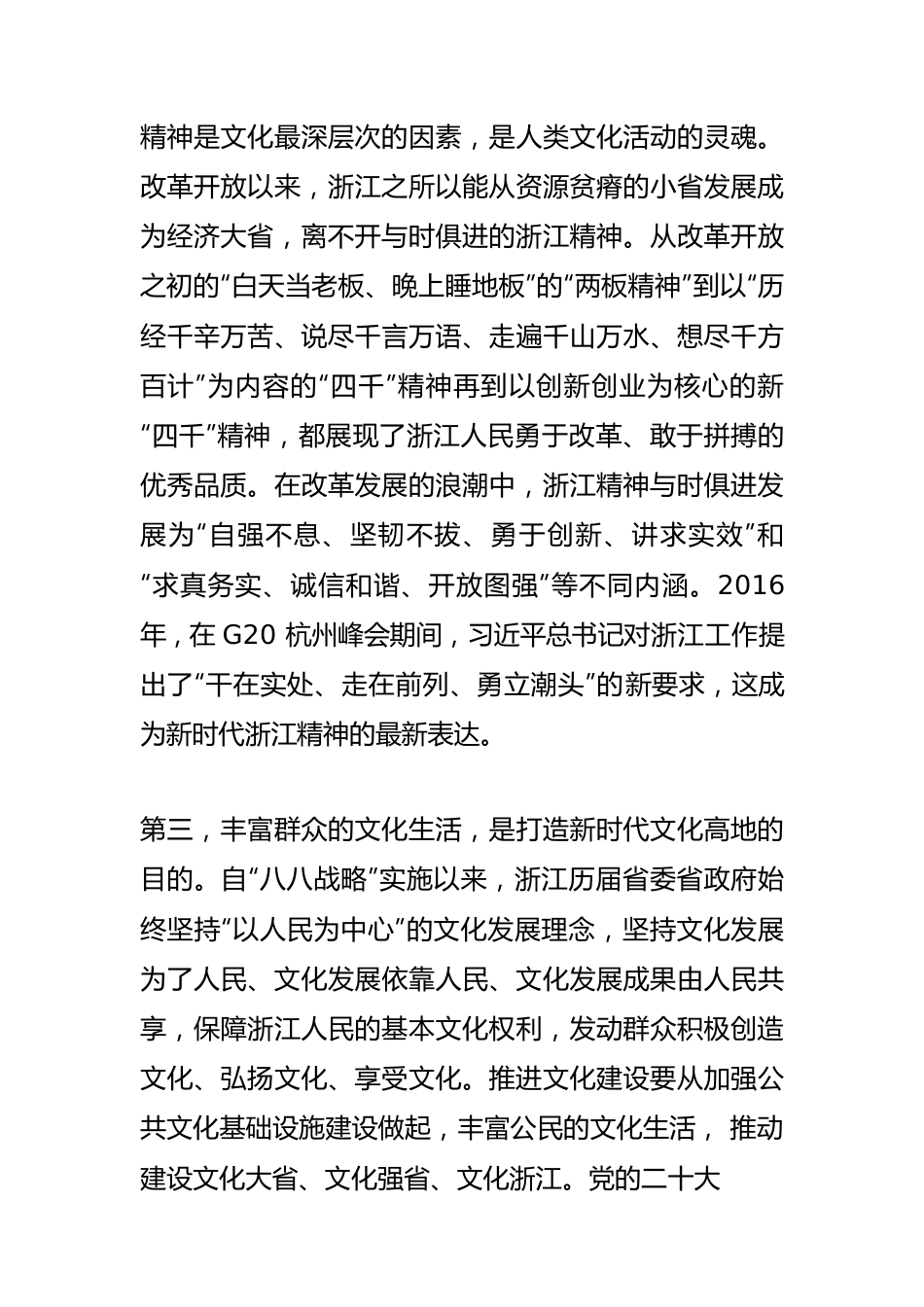 【宣传思想文化工作】奋力打造新时代文化高地“进一步发挥浙江的人文优势,积极推进科教兴省、人才强省,加快建设文化大省”,是“八八战略”关于浙江文化发展的重要表述。习近平总书记关于文化建设的重要观点、重要部署、重要指示,是一贯的、一体的,构建了文化浙江建设的“四梁八柱”,20年来指引浙江深入实施文化建设“八项工程”,浙江文化建设由文化大省递进到文化强省,再升级到文化浙江,取得了丰硕的文化建设成果。在此基础上,2022年,浙江省第十五次党代会将“高水平推进文化强省建设,打造新时代文化高地”作为今后五年的奋斗目标之一,为奋力谱写中国式现代化浙江篇章提供了强劲的文化动力。■深刻理解和把握打造新时代文化高地的科学内涵文化是民族的灵魂,是维系国家统一和民族团结的精神纽带。浙江是文化资源大省,千百年来,浙江人民在奋斗发展中孕育出宝贵的精神财富和文化基因,历久弥新,绵延不绝,始终激励着浙江人民求真务实、开拓创新。党的二十大报告指出:“全面建设社会主义现代化国家,必须坚持中国特色社会主义文化发展道路,增强中国自信,围绕举旗帜、聚民心、育新人、兴文化、展形象建设社会主义文化强国。”这说明“八八战略”中提出的建设文化大省思想对如今推动打造新时代文化高地仍具有重要的指导意义,我们要结合贯彻党的二十大精神,与时俱进,不断丰富和发展“八八战略”中有关文化浙江的思想内涵。首先,深入实施科教兴省、人才强省和创新驱动发展战略,是打造新时代文化高地的关键。党的二十大报告把“实施科教兴国战略,强化现代化建设人才支撑”单列一部分进行强调,对办好人民满意的教育、完善科技创新体系、加快实施创新驱动发展战略、深入实施人才强国战略等作出具体部署,彰显了“八八战略”中关于“科教兴省、人才强省”内涵的科学性。“八八战略”实施20周年,奋力打造新时代文化高地,就是大力推进教育现代化,提高义务教育水平,高水平普及高等教育,加快建成高等教育强省。其次,弘扬浙江精神是打造新时代文化高地的核心内容。精神是文化最深层次的因素,是人类文化活动的灵魂。改革开放以来,浙江之所以能从资源贫瘠的小省发展成为经济大省,离不开与时俱进的浙江精神。从改革开放之初的“白天当老板、晚上睡地板”的“两板精神”到以“历经千辛万苦、说尽千言万语、走遍千山万水、想尽千方百计”为内容的“四千”精神再到以创新创业为核心的新“四千”精神,都展现了浙江人民勇于改革、敢于拼搏的优秀品质。在改革发展的浪潮中,浙江精神与时俱进发展为“自强不息、坚韧不拔、勇于创新、讲求实效”和“求真务实、诚信和谐、开放图强”等不同内涵。2016年,在G20杭州峰会期间,习近平总书记对浙江工作提出了“干在实处、走在前列、勇立潮头”的新要求,这成为新时代浙江精神的最新表达。第三,丰富群众的文化生活,是打造新时代文化高地的目的。自“八八战略”实施以来,浙江历届省委省政府始终坚持“以人民为中心”的文化发展理念,坚持文化发展为了人民、文化发展依靠人民、文化发展成果由人民共享,保障浙江人民的基本文化权利,发动群众积极创造文化、弘扬文化、享受文化。推进文化建设要从加强公共文化基础设施建设做起,丰富公民的文化生活,推动建设文化大省、文化强省、文化浙江。党的二十大报告指出:“中国式现代化是物质文明和精神文明相协调的现代化。物质富足、精神富有是社会主义现代化的根本要求。”这再次凸显了“八八战略”强调加快建设文化大省、丰富人民精神文化生活的重要性。■深刻理解和把握打造新时代文化高地的必要性和重要性发挥浙江的人文优势是根据浙江省情而作出的科学论断,是扬长避短的战略举措。浙江是资源小省,“七山一水二分田”,改革开放初期,浙江人均耕地0.68亩,不足全国人均水平的一半,农作物产量低,几乎没有矿产资源,交通也极不便利。显然,“以地谋发展”的粗放模式不适用于浙江发展。因此,浙江想要成为经济强省,必须依靠浙江人民的人文精神和创新能力,必须把科技创新和人文力量放在重要地位。习近平同志针对浙江这样的省情,提出了指引浙江发展的“八八战略”,强调浙江要...