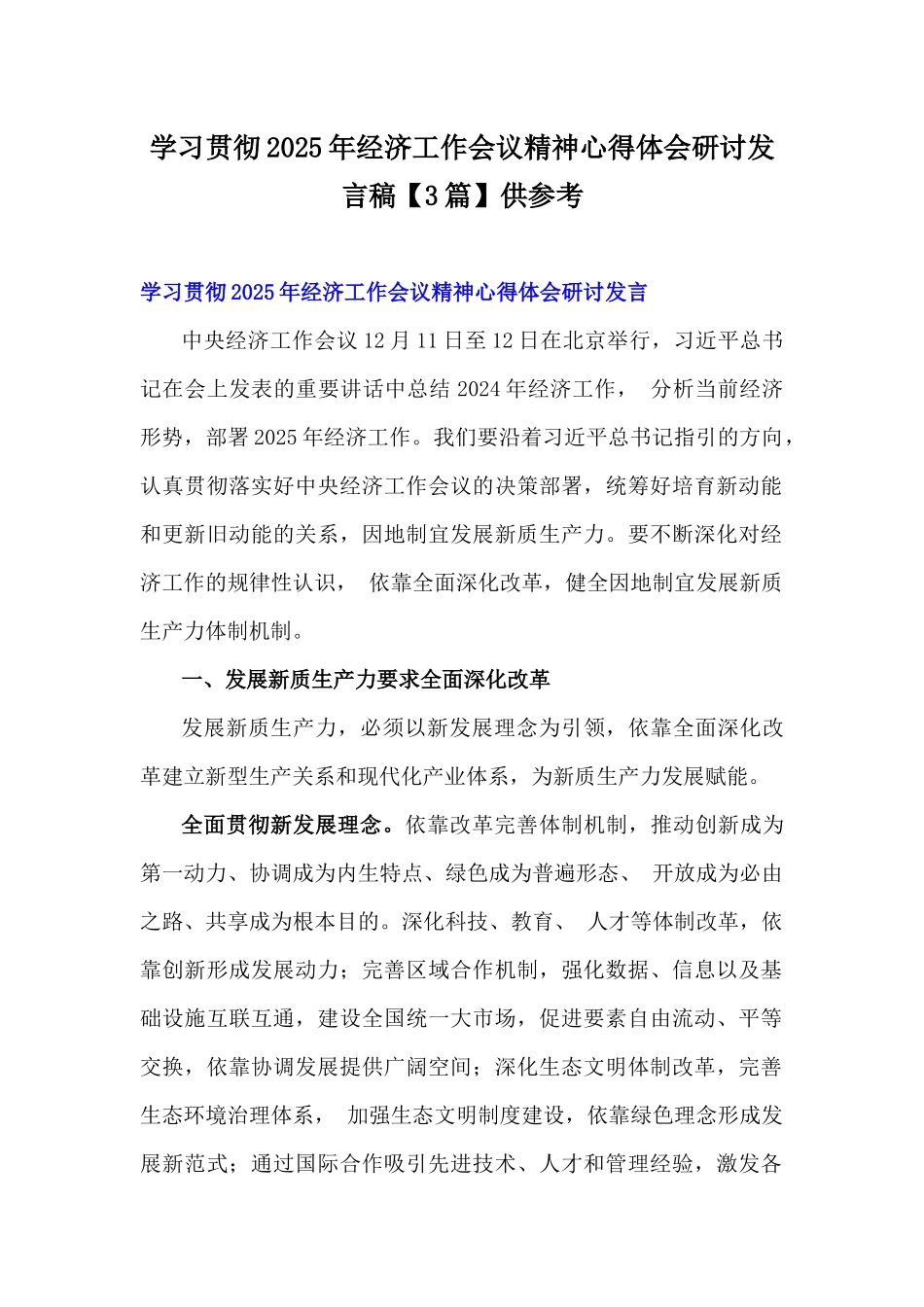学习贯彻2025年经济工作会议精神心得体会研讨发言稿【3篇】供参考学习贯彻2025年经济工作会议精神心得体会研讨发言中央经济工作会议12月11日至12日在北京举行,习近平总书记在会上发表的重要讲话中总结2024年经济工作,分析当前经济形势,部署2025年经济工作。我们要沿着习近平总书记指引的方向,认真贯彻落实好中央经济工作会议的决策部署,统筹好培育新动能和更新旧动能的关系,因地制宜发展新质生产力。要不断深化对经济工作的规律性认识,依靠全面深化改革,健全因地制宜发展新质生产力体制机制。一、发展新质生产力要求全面深化改革发展新质生产力,必须以新发展理念为引领,依靠全面深化改革建立新型生产关系和现代化产业体系,为新质生产力发展赋能。全面贯彻新发展理念。依靠改革完善体制机制,推动创新成为第一动力、协调成为内生特点、绿色成为普遍形态、开放成为必由之路、共享成为根本目的。深化科技、教育、人才等体制改革,依靠创新形成发展动力;完善区域合作机制,强化数据、信息以及基础设施互联互通,建设全国统一大市场,促进要素自由流动、平等交换,依靠协调发展提供广阔空间;深化生态文明体制改革,完善生态环境治理体系,加强生态文明制度建设,依靠绿色理念形成发展新范式;通过国际合作吸引先进技术、人才和管理经验,激发各类经营主体创新创造活力,依靠开放增强内生动力;促进就业创业和收入分配制度改革,加强各项社会事业和社会保障体系建设,提高基本公共服务水平,依靠成果共享提升发展后劲。形成新型生产关系。发展新质生产力必须对既有生产关系进行改革,形成与之相适应的新型生产关系。这是加快新质生产力发展的必然要求。新型生产关系有利于科技创新和培育新动能新优势,有利于产业升级和提质增效,有利于推动新质生产力健康发展。新型生产关系的形成,不能简单否定传统生产关系,也不能通过行政命令或法律法令来实现,必须推动生产、分配、交换和消费等环节的深刻变革。其中的关键是依靠全面深化改革,建成高水平社会主义市场经济体制,建立高标准市场体系,创新要素配置方式,并以经济体制改革为牵引,完善人才培养、引进、使用、合理流动制度,形成各类先进优质生产要素向发展新质生产力顺畅流动的机制。构建现代化产业体系。发展新质生产力必须加快建设现代化产业体系。构建现代化产业体系,新兴产业和未来产业是“主阵地”,传统产业是“基本盘”。新兴产业、未来产业、传统产业各自特点不同,相应的体制机制改革也各有侧重。新兴产业重在完善以科技创新引领产业创新的机制、鼓励和包容产业发展的机制等,加快形成新赛道、新路径、新范式;未来产业重在完善风险投资机制,确保孵化投资可持续增长;传统产业重在完善制度支持转型升级,标准引领很关键。其中的共性是在关键领域、关键环节、关键点位推出有力改革措施,完善“政企联合出题、政府助企答题、企业主导评估”的创新机制,让企业真正成为创新的主导者、引领者,推动创新链、产业链、资金链、人才链全面融通及良性循环,建立与新质生产力相辅相成的现代化产业体系。二、把握发展新质生产力全面深化改革规律从根本上说,发展新质生产力要靠全面深化改革。全面深化改革要更加注重系统集成,更加注重突出重点,更加注重改革实效。更加注重系统集成。与新质生产力相适应的新型生产关系构建不仅涉及产业组织体系与管理方式变革,还涉及交换关系、分配制度、劳动关系等方面的深刻变革,涉及经济、科技、行政、环保、用人等体制改革,以及制度型对外开放等方方面面,是复杂系统工程,许多领域需要历史性变革、系统性重塑、整体性重构,必须统筹设计、一体推行。为实现生产力“新质”和“增量”的有机结合,要加快顶层设计系统集成,形成引领发展制度体系;加快核心引擎系统集成,形成科技创新不竭动力;加快产能结构系统集成,形成供给侧结构性改革主战场;加快支撑载体系统集成,形成产业升级转化器。改革更加注重系统集成,新型生产关系才能更好发挥赋能作用,全要素效率和效益才能随之有效提升。更加注重突出重点。从本质上看,新质生产力是一种由量变引发的质变。深化改革是推进新质...