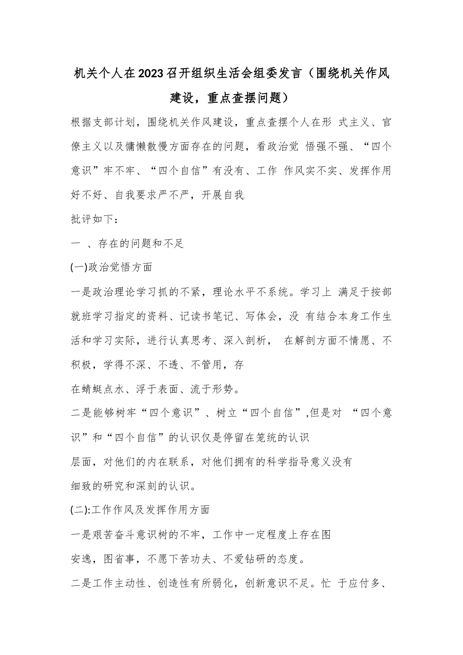 机关个人在2023召开组织生活会组委发言(围绕机关作风建设,重点查摆问题)根据支部计划,围绕机关作风建设,重点查摆个人在形式主义、官僚主义以及慵懒散慢方面存在的问题,看政治觉悟强不强、“四个意识”牢不牢、“四个自信”有没有、工作作风实不实、发挥作用好不好、自我要求严不严,开展自我批评如下:一、存在的问题和不足(一)政治觉悟方面一是政治理论学习抓的不紧,理论水平不系统。学习上满足于按部就班学习指定的资料、记读书笔记、写体会,没有结合本身工作生活和学习实际,进行认真思考、深入剖析,在解剖方面不情愿、不积极,学得不深、不透、不管用,存在蜻蜓点水、浮于表面、流于形势。二是能够树牢“四个意识”、树立“四个自信”,但是对“四个意识”和“四个自信”的认识仅是停留在笼统的认识层面,对他们的内在联系,对他们拥有的科学指导意义没有细致的研究和深刻的认识。(二):工作作风及发挥作用方面一是艰苦奋斗意识树的不牢,工作中一定程度上存在图安逸,图省事,不愿下苦功夫、不爱钻研的态度。二是工作主动性、创造性有所弱化,创新意识不足。忙于应付多、主动落实少,缺乏创造性开展工作,在解放思想,更新观念,创新工作方法和手段方面不积极不主动,被动应付。三是对工作标准要求不高,存有畏难发愁的思想,工作满足于过得去,不求过得硬,缺乏大胆负责的勇气,对碰到的矛盾和问题,好办的就多办,难办的不愿多涉及。四是对提高个人能力素质的认识不够紧迫,工作中干一点学一点,没有系统扎实的通过学习来提高组织人事干部的综合能力素质。五是工作中由急躁情绪,有时出现疏忽大意的错漏。(三)自我要求方面整体来说没有违法乱纪的行为和现象,但是剖析思想上的问题对作风建设认识不高,对待纪律要求时好时坏,时紧时松,被动响应的现象依然存在,也有放松自我要求的表现。二、产生问题的原因上述主要问题和不足的存在,有多方面的原因,通过分析,主要是以下几个方面的原因(一)学习不够深入,创新意识还不强。(二)价值观念偏差,自我约束还不强。(三)进取精神退减,宗旨意识还不强。(四)服务意识滑坡,工作动力还不足。(五)管理有待加强,制度执行还不够严。三、今后改进措施和努力方向(一)要进一步加强理论学习,增强理论功底。提高自己的政治敏锐性和政治鉴别力,树立科学的世界观、人生观和价值观,要以解决思想和工作中存在的实际问题为出发点,以改进自己的工作作风和工作方式、提高工作成效为落脚点,特别要在理论联系实际、指导实践上下真功夫,不断提高理论学习的效果,实现理论与实践相统一。(二)要进一步改进工作作风,增强宗旨意识,树立无私奉献和艰苦奋斗的精神。牢固树立全心全意为人民服务的思想,树立为党为人民无私奉献精神,把个人的追求融入党的事业之中,坚持党的事业第一、人民利益第一。正确对待权力、金钱、名利,在生活上艰苦朴素,勤俭节约,不奢侈浪费,不追求享受。要努力做到善于克服消极思维、模糊认识所造成的各种束缚,破除急躁情绪,迎难而上,积极工作。(三)要进一步保持清正廉洁,增强拒腐防变能力。树立正确的利益观、荣辱观、道德观、人生观,追求积极向上的生活情趣,坚决抵制歪风邪气,始终做到清正廉洁,尽心尽力把工作做好。(四)要进一步务实创新,增强工作实效。要坚持解放思想、实事求是、与时俱进,在科学理论的指导下,通过实现学习方式、工作理念、工作手段和工作机制的创新,最终达到工作成效的不断提高。不断总结和完善工作经验,开创工作新局面。(五)要严格执行各项规章制度,尽职尽责做好各项工作。召开组织生活会组委发言一、存在的问题。(一)在深入理解和系统掌握习近平新时代中国特色社会主义思想,提高思想理论水平、增强规律认识,做到学思用贯通、知信行统一方面的差距:系统的理论学习不够。认为只要跟着党组织学习就足够了,积极干好本职工作就可以了,在学习思想理论水平方面存在囫囵吞枣的现象,没有认真学习、反复学习。(二)在筑牢信仰之基、增强历史定力,坚定“四个自信”、做到“两个维护”方面的差距:存在党章意识、党员身份意识淡化,只知道要忠诚党的事业、埋头干活,没有注意提...