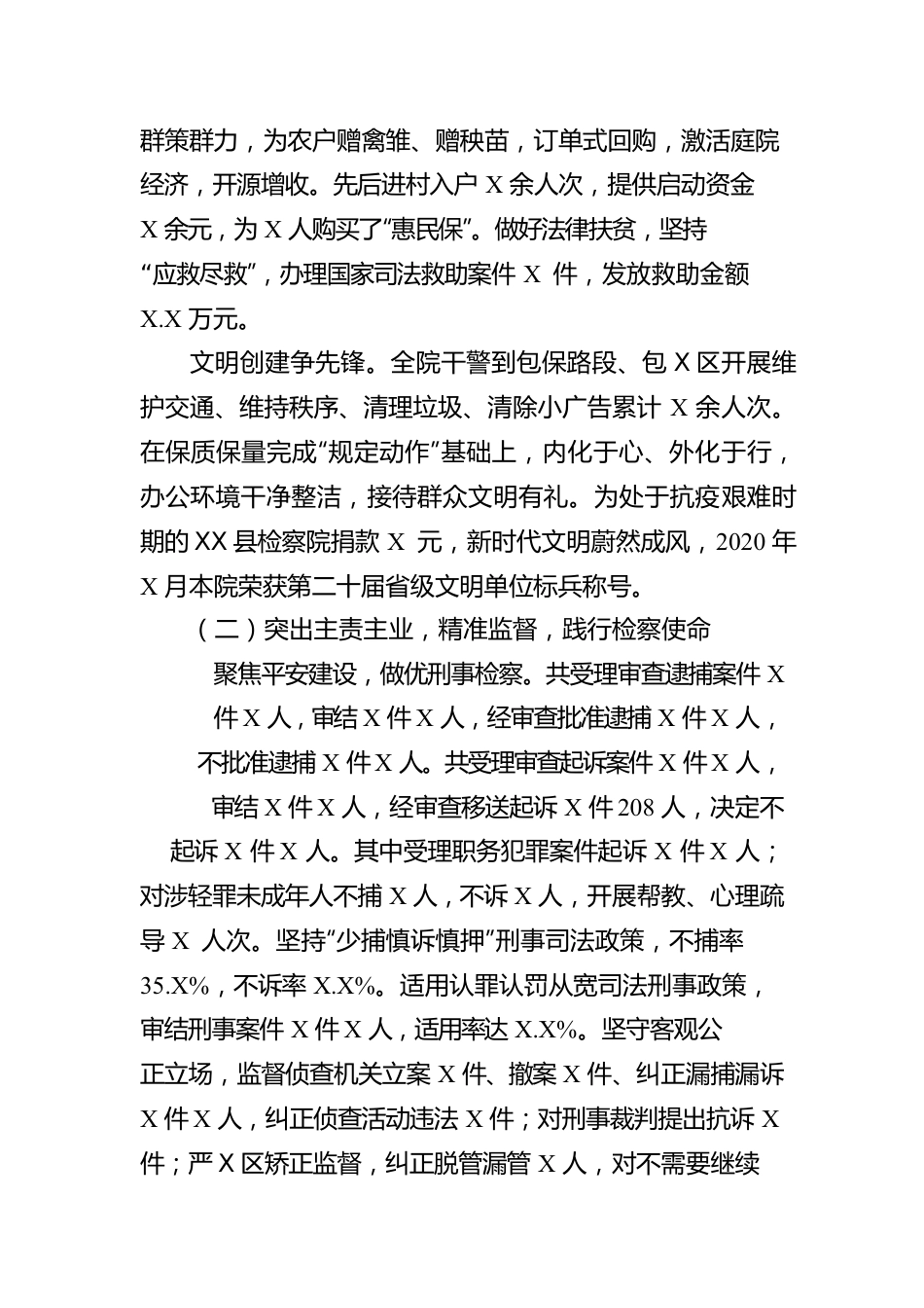 XXX县人民检察院工作报告——在XXX县第十八届人民代表大会第三次会议上各位代表:现在,我代表XXX县人民检察院向大会报告工作,请予审议,请各位政协委员和列席同志提出宝贵意见。一、2022年工作回顾过去的一年,是踔厉奋发建设大美XX的关键之年,在县委和上级院的正确领导下,在县人大及其常委会的有力监督下,在县政府、县政协和社会各界的大力支持下,我院以习近平新时代中国特色社会主义思想为指导,深入贯彻习近平法治思想,以高度的政治自觉、法治自觉、检察自觉锐意进取,各项检察工作稳步提升。(一)牢记国之大者,服务大局,彰显检察担当疫情防控冲在前。坚决XX县委县政府的命令,无论是核酸检测服务,还是X区静默管控,都能做到有序规范、令行禁止。累计核酸检测服务X万余人次、派驻集中隔离酒店X轮X人次、投身“两站一场”值守X余人次。特别是在赴佳某市抗疫中,经过X天艰苦奋战,实现了世水花♘一期由“乱”向“治”到“稳”的跨越式转变,实现病例零新增、人员零感染,展示了攻坚克难、战无不胜的XX精神。乡村振兴稳推进。驻村队员兢兢业业,凝聚合力,共同奋进。积极改善村两委办公条件,提高工作效率。帮扶干警群策群力,为农户赠禽雏、赠秧苗,订单式回购,激活庭院经济,开源增收。先后进村入户X余人次,提供启动资金X余元,为X人购买了“惠民保”。做好法律扶贫,坚持“应救尽救”,办理国家司法救助案件X件,发放救助金额X.X万元。文明创建争先锋。全院干警到包保路段、包X区开展维护交通、维持秩序、清理垃圾、清除小广告累计X余人次。在保质保量完成“规定动作”基础上,内化于心、外化于行,办公环境干净整洁,接待群众文明有礼。为处于抗疫艰难时期的XX县检察院捐款X元,新时代文明蔚然成风,2020年X月本院荣获第二十届省级文明单位标兵称号。(二)突出主责主业,精准监督,践行检察使命聚焦平安建设,做优刑事检察。共受理审查逮捕案件X件X人,审结X件X人,经审查批准逮捕X件X人,不批准逮捕X件X人。共受理审查起诉案件X件X人,审结X件X人,经审查移送起诉X件208人,决定不起诉X件X人。其中受理职务犯罪案件起诉X件X人;对涉轻罪未成年人不捕X人,不诉X人,开展帮教、心理疏导X人次。坚持“少捕慎诉慎押”刑事司法政策,不捕率35.X%,不诉率X.X%。适用认罪认罚从宽司法刑事政策,审结刑事案件X件X人,适用率达X.X%。坚守客观公正立场,监督侦查机关立案X件、撤案X件、纠正漏捕漏诉X件X人,纠正侦查活动违法X件;对刑事裁判提出抗诉X件;严X区矫正监督,纠正脱管漏管X人,对不需要继续羁押的X名犯罪嫌疑人变更强制措施。突出保障民生福祉,办理危害食品药品安全犯罪案件X件X人,全力守护“舌尖上安全”;办理电信网络诈骗等新型违法犯罪案件X件X人、审查起诉案件X件X人,全力守护“钱袋子”安全。聚焦平等主体,做强民事检察。用心用情落实“群众来信件件有回复”制度,共办理来信来访X件X人,全部落实X日内程序性回复,X个月内办理过程和结果答复,始终保持涉检赴省进京访零记录。以贯彻实施《民法典》为契机,坚持精准监督,努力让公平正义看得见、摸得着。受理审查民事执行活动监督案件X件,民事生效裁判监督案件X件,其中不支持监督申请案件X件,提请抗诉案件X件;民事支持起诉案件X件,民事审判活动违法行为监督案件X件,类案监督X件,引导当事人服判息诉,共同维护司法权威。依法为弱势群体遮风挡雨,积极帮助农民工追讨欠薪,帮助12名农民工讨回辛苦钱X万余元。聚焦法治建设,做实行政检察。争当普法教育践行者,在全县中小学,推出“开学第一课”,受教育师生数千人次,为建设“法治校”提供检察助力。践行双赢多赢共赢理念,♘促进依法行政,推动实现案结事了政和。办理行政违法监督案件X件;行政争议化解案件X件;行政非诉执行案件X件;行政审判违法监督案件X件;结合办案提出社会治理类检察建议X件,采纳率X%。聚焦公共利益,做好公益诉讼检察。牢记检察官是公共利益代表的神圣职责,立案审查公益诉讼案件X件,提起刑事附带民事公益诉讼X件,提出诉前检察建议X件。黑土地专项立案X件。生态环境、资源保护和食品药品领域立案X件。收缴赔偿野生...