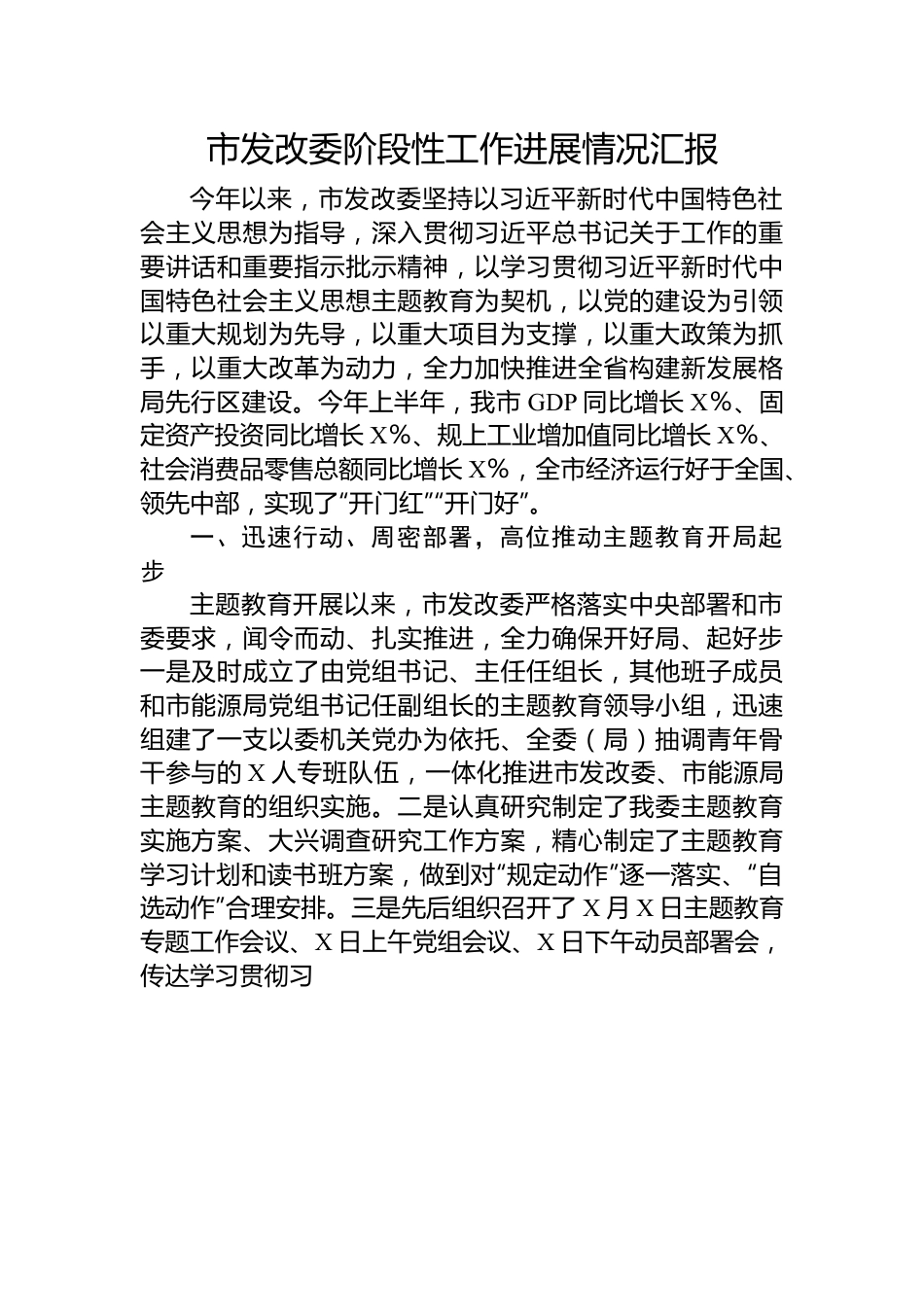 市发改委阶段性工作进展情况汇报今年以来,市发改委坚持以习近平新时代中国特色社会主义思想为指导,深入贯彻习近平总书记关于工作的重要讲话和重要指示批示精神,以学习贯彻习近平新时代中国特色社会主义思想主题教育为契机,以党的建设为引领以重大规划为先导,以重大项目为支撑,以重大政策为抓手,以重大改革为动力,全力加快推进全省构建新发展格局先行区建设。今年上半年,我市GDP同比增长X%、固定资产投资同比增长X%、规上工业增加值同比增长X%、社会消费品零售总额同比增长X%,全市经济运行好于全国、领先中部,实现了“开门红”“开门好”。一、迅速行动、周密部署,高位推动主题教育开局起步主题教育开展以来,市发改委严格落实中央部署和市委要求,闻令而动、扎实推进,全力确保开好局、起好步一是及时成立了由党组书记、主任任组长,其他班子成员和市能源局党组书记任副组长的主题教育领导小组,迅速组建了一支以委机关党办为依托、全委(局)抽调青年骨干参与的X人专班队伍,一体化推进市发改委、市能源局主题教育的组织实施。二是认真研究制定了我委主题教育实施方案、大兴调查研究工作方案,精心制定了主题教育学习计划和读书班方案,做到对“规定动作”逐一落实、“自选动作”合理安排。三是先后组织召开了X月X日主题教育专题工作会议、X日上午党组会议、X日下午动员部署会,传达学习贯彻习近平总书记重要讲话和市主题教育工作会议精神,对全委(局)主题教育进行动员部署。四是在X发改党建“两群一号”平台上开设了主题教育专栏,加载学习资料,展示工作动态,积极营造良好氛围。二、突出重点、把握关键,谋深做实主题教育下步工作(一)全面强化理论学习。一是举办读书班,通过专家导学、领导讲学、参观见学、交流研学、个人自学等方式,组织全委(局)党员、干部统一学。读书班为期一周计划在X月下旬或X月上旬举办。二是结合每月党组理论学习中心组学习,聚焦发改主责主业,围绕中国式现代化新发展格局、区域协调发展、现代化产业体系、科技自立自强等重点内容开展专题研讨交流,充分发挥理论学习中心组示范引领作用。三是各党支部依托主题党日、“三会一课”等活动常态化开展集中学习,原原本本、原汁原味研读“一报告一章三书”。四是讲好专题党课,重点围绕学习体会、思想感悟、理论运用等内容,每位班子成员带头讲X次专题党课,各党支部书记在所在党支部讲X次专题党课。(二)深入开展调查研究。一是选准调研主题。按照中央、市委明确的X个方面调研内容,聚焦中心工作、经济社会发展重大问题、干部群众热切关注,将国家所需、X所能、发改所长、群众所想、未来所向有机结合起来,以打造全省科技创新与制造业基地、打造国土安全服务保障基地、X地区绿色低碳发展、项目全生命周期管理服务体系建设等内容为重点,确定若干调研课题,计划由我委处级以上领导干部每人牵头负责X个。二是下沉一线调研。根据我委大兴调查研究工作方案安排,采取“四不两直”方式,深入基层一线到群众、企业和市场主体之中开展蹲点式、沉浸式调研,了解掌握群众盼在何处、企业难在何处、基层忧在何处、工作卡在何处,真正把情况摸清、把问题找准,坚决杜绝作秀式、盆景式、蜻蜓点水式和嫌贫爱富式调研,课题调研计划在X月底前完成。三是形成高质量调研成果。坚持从实际出发在调研中发现真问题、研究真问题,召开调研情况交流会集思广益研究对策措施,着力形成解决问题、指导实践、推动工作的思路办法和政策举措,调研成果计划在X月底前形成。同时,对调研中反映和发现的问题,逐一梳理形成委党组问题清单、责任清单、任务清单,于X月底前集中解决一批,后续就未解决的持续开展调研并着力推动解决。(三)坚持边学边查边改。从一开始就改起来,把“改”字贯穿始终,一是与贯彻落实中央、省委、市委重大战略相结合,聚焦解决理解上有偏差、落实上有折扣等问题,确保中央决策部署和市委工作要求不折不扣贯彻落实。二是与解决问题相结合,系统梳理县(市、区)和企业反映问题特别是营商环境中存在的问题、项目推进中遇到的问题、民生领域反映强烈的问题,组织开展专项整治,明确具体措...