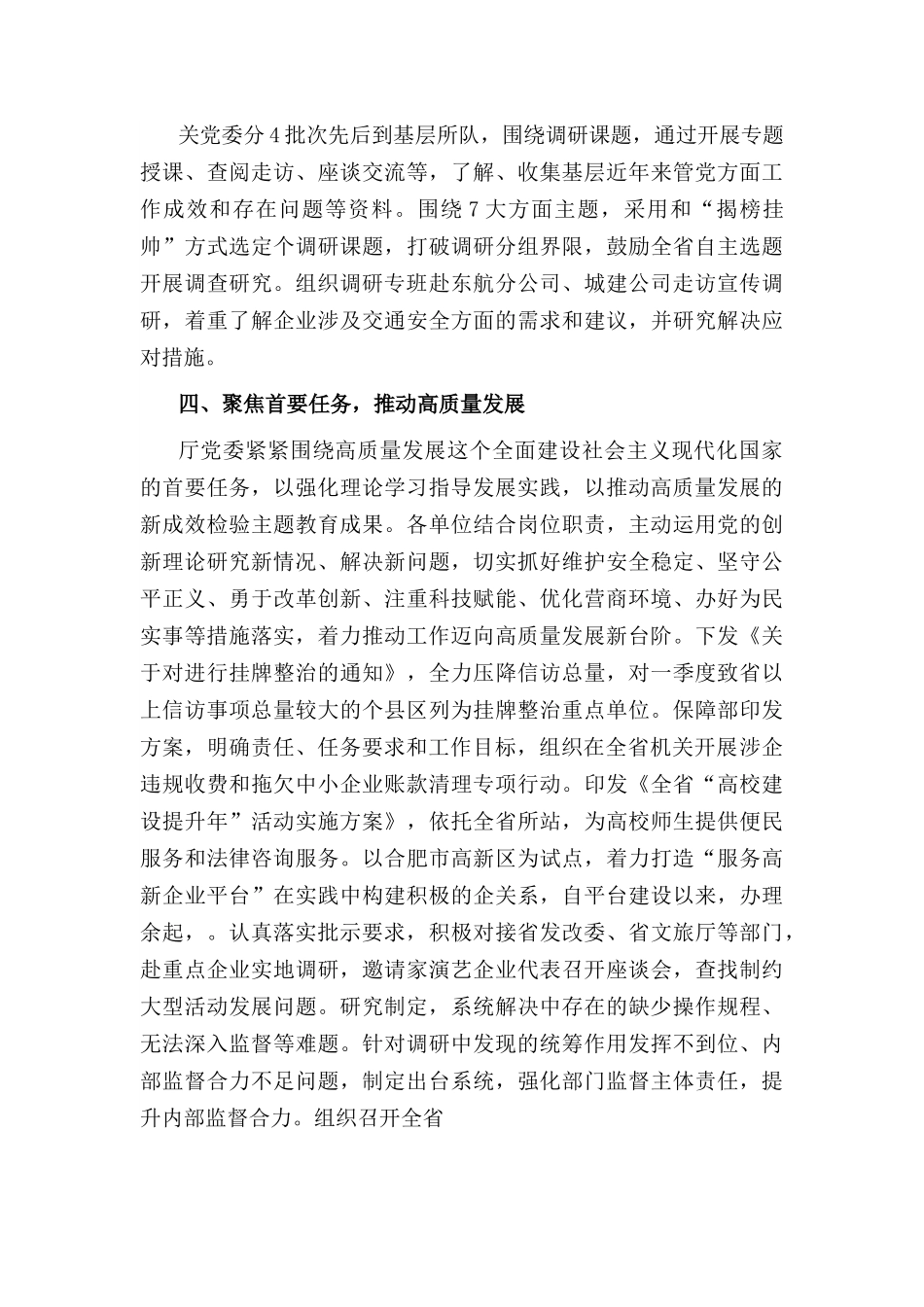 根据党中央关于在全党深入开展学习贯彻新时代中国特色社会主义思想主题教育的部署要求和省委部署安排,在第巡回指导组的具体指导下,省厅党委高度重视、认真谋划、精心部署,组织全厅上下认真学习上级精神,牢牢把握主题教育的总要求和根本任务,紧紧锚定具体目标和重点措施,坚持高质量高标准,有力有序有效推动主题教育各项工作开展。现将整体工作进展情况汇报如下。一、提高政治站位,全面动员部署4月19日,厅党委召开主题教育动员大会,作动员讲话,强调要认真学习贯彻重要讲话精神,自觉遵循、对标对表、全面落实,全力推动主题教育取得扎实成效。厅党委认真制定主题教育实施方案和工作安排,以及理论学习安排、调查研究方案等,把理论学习、调查研究、推动发展、检视整改贯穿始终,做到全覆盖、不遗漏。厅直个单位党组织坚决扛起政治责任,广泛动员发动,严格落实主题教育各项要求。经统计,省厅参加第一批主题教育党员共计人,其中,处级以上领导干部人,离退休党员人。党支部专门召开动员大会,对厅机关离退休党员学习贯彻新时代中国特色社会主义思想主题教育工作进行动员部署。机关党委组织广大青年党团员开展学习新时代中国特色社会主义思想“学思汇”活动。职业学院组织全体教职工、离退休党支部党员代表、学生党员代表参加学院主题教育动员大会,切实将主题教育工作延伸到组织末梢。厅协会等6个功能型党支部对照厅主题教育安排,结合厅属协会实际,制定工作计划,确保完成各项规定动作。二、突出重中之重,抓实理论学习厅党委围绕委明确的“五学”重点和个方面重点内容,以读书班和党委理论学习中心组为示范,制定了理论学习计划和分专题研讨方案。月日至日,厅党委举办专题读书班,党委班子成员带头参加、带头领学、带头研讨。读书班以集中自学为主,邀请省委党校教授作专题辅导讲座,并立足职责任务,开展3次、所有人员全覆盖的交流研讨。厅直各级党组织以“三会一课”和主题党日为载体,加强学习交流、深化认识、启发思路,推动党的创新理论学习不断引向深入。在五四青年节来临之际,月日,省厅隆重举行事分享会;同时,牵头组织厅机关名功模赴开展为期天的学习教育活动,开展革命传统教育。驻厅纪检监察组组织全体纪检干部学习领会对纪检监察干部队伍建设作出的重要部署,观看警示教育片,各纪检部门负责同志及年轻党员干部代表交流发言。开展主题团日活动,通过召开青年干部职工座谈会,组织青年干部赴纪念馆参观学习等,不断弘扬五四精神。对照主题教育部署要求和规定学习内容,通过制作学习小册、随机抽测、专题党课、开设“主题教育每日小课堂”等,确保理论学习实效。分别到社区和纪念园开展主题党日活动,围绕乡村振兴谈感受、重温入党誓词等,丰富主题教育形式。三、坚持求真务实,深入调查研究厅党委将2023年作为全省“调查研究年”,制定印发全省系统大兴调查研究工作实施方案和厅党委细化工作安排,全面谋划全省系统大兴调查研究工作。各级领导班子成员率先垂范,真正扑下身子、沉到一线,带头开展调研。深入局,抽查验收2021年度方面存在问题整改情况。主要负责同志采取“四不两直”方式,当天往返等地,直接到,与基层单位等问题座谈交流、了解情况。围绕调研课题,由处领导带队分别前往等地开展调查研究,为下一步形成书面调研报告和问题整改做好准备。处组成4个调研组分赴全省个地市个县(区、市),以情况为重点,深入开展拉网式调查研究。机关党委分4批次先后到基层所队,围绕调研课题,通过开展专题授课、查阅走访、座谈交流等,了解、收集基层近年来管党方面工作成效和存在问题等资料。围绕7大方面主题,采用和“揭榜挂帅”方式选定个调研课题,打破调研分组界限,鼓励全省自主选题开展调查研究。组织调研专班赴东航分公司、城建公司走访宣传调研,着重了解企业涉及交通安全方面的需求和建议,并研究解决应对措施。四、聚焦首要任务,推动高质量发展厅党委紧紧围绕高质量发展这个全面建设社会主义现代化国家的首要任务,以强化理论学习指导发展实践,以推动高质量发展的新成效检验主题教育成果。各单位结合岗位职责,主动运用党的创新理论研究新...