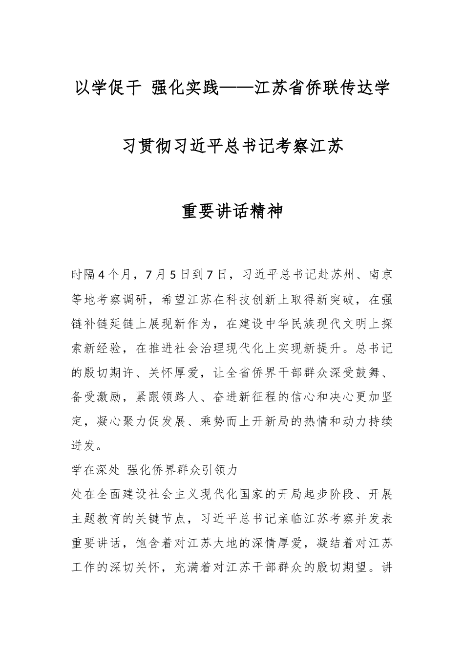 以学促干强化实践——江苏省侨联传达学习贯彻习近平总书记考察江苏重要讲话精神时隔4个月,7月5日到7日,习近平总书记赴苏州、南京等地考察调研,希望江苏在科技创新上取得新突破,在强链补链延链上展现新作为,在建设中华民族现代文明上探索新经验,在推进社会治理现代化上实现新提升。总书记的殷切期许、关怀厚爱,让全省侨界干部群众深受鼓舞、备受激励,紧跟领路人、奋进新征程的信心和决心更加坚定,凝心聚力促发展、乘势而上开新局的热情和动力持续迸发。学在深处强化侨界群众引领力处在全面建设社会主义现代化国家的开局起步阶段、开展主题教育的关键节点,习近平总书记亲临江苏考察并发表重要讲话,饱含着对江苏大地的深情厚爱,凝结着对江苏工作的深切关怀,充满着对江苏干部群众的殷切期望。讲话内容引发了侨界的热烈反响,各级侨联组织纷纷召开专题会议,分享感悟,凝聚共识。按照省委部署要求,7月11日,省侨联党组召开专题会议,深入学习习近平总书记考察江苏重要讲话精神,传达学习省委常委会会议精神,研究贯彻落实意见。党组书记、主席刘标表示,要把深入学习贯彻习近平总书记在江苏考察时的重要讲话重要指示精神作为当前和今后一个时期的重大政治任务,这对凝聚侨界群众思想共识、汇集侨界智慧力量具有重大意义,是侨联组织继续践行走在前列的重要精神坐标和行动指南。7月14日,省侨联以线上线下相结合的方式,召开全省侨联系统学习贯彻习近平总书记考察江苏重要讲话精神部署会,就深刻领会习近平总书记赋予江苏“四个新”的重大任务进行学习解读,组织南京、苏州、扬州、连云港等市侨联交流学习体会,省侨联副主席艾卉围绕深入学习贯彻习近平总书记考察江苏重要讲话精神作具体部署,省、市、县(区、市)三级侨联机关干部及侨界群众代表参加会议,切实做到统一思想、领会要点、学深悟透,保证学习效果,在全省侨联系统全面兴起学习宣传贯彻热潮。谋在新处增强侨联组织贡献度围绕习近平总书记赋予江苏“四个新”的重大任务,省侨联机关要求各级侨联组织要自觉对标对表,逐项研究谋划结合总书记对群团工作、侨务工作的重要指示批示精神,紧扣中心大局,创新形式载体,进一步找准侨联工作的聚焦点、结合点、切入点。在服务科技创新方面,聚焦江苏16个先进制造业集群和50条重点产业链中的海外高层次人才需求,围绕江苏高质量发展总要求,积极搭建引才引智平台,加强与海外侨界人士的联络联系和宣传引导,大力推进人才引荐,让更多侨界人才走进江苏、扎根江苏、建设江苏、奉献江苏。在强链补链延链方面,持续加大为侨服务力度,提高为侨服务针对性,努力帮助企业解决科技创新和产业创新困难问题,促进侨企牢牢占据产业链、价值链高端,为高质量发展努力开辟新领域新赛道、塑造新动能新优势。在建设中华民族现代文明方面,进一步丰富“亲情中华·魅力江苏”“追梦中华·情系江苏”品牌活动的内容和形式,积极推动中餐中医海外推广,网上网下联动办好海外华裔青少年夏令营,持续开展海外华文媒体江苏行活动,在海外讲好中国故事、江苏故事,努力塑造可信、可爱、可敬的中国形象。在推进社会治理现代化方面,探索推行“一线工作法”,以“十年磨一剑”的韧劲,以“一辈子办成一件事”的执着,把党政机关对侨联工作的具体要求摸清楚,把基层侨联组织建设中的短板弱项摸清楚,把侨界群众期盼解决的现实困难摸清楚,知侨情、解侨意、排侨忧,努力把具体问题发现在一线、解决在一线。干在实处提升为侨服务精准性从“牢记‘两个率先’光荣使命”到“建设‘强富美高’新江苏”,从“争当表率、争做示范、走在前列”到“有能力也有责任在推进中国式现代化中走在前、做示范”,从提出“四个走在前”重大任务到这次提出“四个新”,总书记对江苏发展的要求,需要一步步踏踏实实干出来。在此次考察中,总书记关于“以学促干”的最新指示强调了树牢造福人民的政绩观,对于侨联组织而言,更需要不断提升为侨服务的精准度和实效性,切实提高侨界群众获得感幸福感。为此,结合年度工作任务,省侨联明确各级侨联组织要在完善困难老归侨托底服务机制、扶助新侨创新创业和侨商在苏发展、拓展...