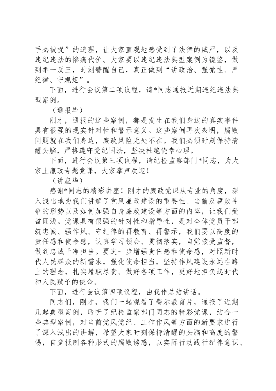 2025年廉政警示教育大会主持词及讲话同志们:廉政警示教育是全面从严治党的基础性工作,是一体推进不敢腐、不能腐、不想腐的重要一环。今天,我们在这里召开2025年廉政警示教育大会,主要目的是通过典型案例的剖析和警示,将警示教育常态化、长效化、全覆盖,不断推进以案明纪、以案促改工作走深走实,进一步增强全体干部职工的廉洁自律意识,筑牢拒腐防变的思想防线,弘扬清廉之风,养成俭朴之风,营造风清气正的工作环境。参加今天会议的有:局领导班子成员,下属事业单位主要负责认、各部门负责人、全体党员以及重点岗位工作人员。今天的会议共有四项议程,一是观看警示教育片《反腐为了人民》;二是通报近期违纪违法典型案例;三是邀请纪检监察部门同志进行廉政专题讲座;四是由我进行总结讲话。下面,会议依次进行。首先,进行会议第一项议程,观看警示教育片《反腐为了人民》(播放警示教育片,观看毕)刚才,我们观看了警示教育片,片中的案例触目惊心,令人警醒。专题片展现了在全国开展群众身边不正之风和腐败问题集中整治,集中解决一批群众反映强烈的突出问题,深入推进风腐同查同治,持续深化纠治“四风”,紧盯新型腐败和隐性腐败,不断丰富防治的有效办法,深化以案促改、以案促治,着力铲除腐败滋生的土壤和条件的明显成效。警示教育片深入剖析了近年来查处的多起典型腐败案例,通过真实的画面、详尽的资料和涉案人员的深刻忏悔,生动展现了腐败行为给党和国家、个人与家庭带来的严重危害,深刻揭示了“莫伸手,伸手必被捉”的道理,让大家直观地感受到了法律的威严,以及违纪违法的惨痛代价。大家要以违纪违法典型案例为镜鉴,做到举一反三,时刻警醒自己,真正做到“讲政治、强党性、严纪律、守规矩”。下面,进行会议第二项议程,请*同志通报近期违纪违法典型案例。(通报毕)刚才,通报的这些案例,都是发生在我们身边的真实事件具有很强的现实针对性和警示意义。这些案例再次表明,腐败问题就在我们身边,廉政风险无处不在。我们必须时刻保持清醒头脑,严格遵守党纪国法,坚决杜绝侥幸心理。下面,进行会议第三项议程,请纪检监察部门*同志,为大家上廉政专题党课,大家掌声欢迎!(讲座毕)感谢*同志的精彩讲座!刚才的廉政党课从专业的角度,深入浅出地为我们讲解了党风廉政建设的重要性、当前反腐败斗争的形势以及如何加强自身廉政建设等方面的内容,让我们受益匪浅。党课具有很强的针对性和指导性,是对全体党员干部筑忠诚、强作风、守纪律的再教育、再警示,我们要以高度的责任感和使命感,认真学习领会、贯彻落实,自觉接受监督,做到忠诚干净担当。要进一步增强责任感和使命感,对照新时代人民群众的新需求,强化使命担当,坚持作风建设永远在路上的理念,扎实履职尽责、做好各项工作,更好地担负起时代和人民赋予的使命。下面,进行会议第四项议程,由我作总结讲话。同志们,刚才,我们一起观看了警示教育片,通报了近期几起典型案例,聆听了纪检监察部门同志的精彩党课,结合一些典型案例,对当前党风党纪、工作作风等方面的新要求进行了深入浅出的讲解,希望大家时刻保持清醒的头脑和高度的警惕,自觉抵制各种形式的腐败诱惑,以实际行动践行纪律意识、规矩意识和底线意识,营造更加风清气正的政治生态。下面,结合刚才的内容,我强调几点意见,也是一次集体廉政谈话。第一,深化思想认识、筑牢政治忠诚。对党忠诚是共产党人首要的政治品质。党员干部作为国家政策的执行者、社会发展的攻坚力量,必须旗帜鲜明讲政治,以政治上的绝对过硬,确保对党绝对忠诚。面对大是大非问题,旗帜鲜明、立场坚定,做政治上的“明白人”。把牢正确政治方向,将讲政治贯穿履职尽责全过程,争做“两个维护”的排头兵。党员干部要坚持把政治纪律、政治规矩摆在首位,把党章党规党纪作为理论学习、党性教育、干部培训的必修课,把能干什么、不能干什么讲清楚,使党员干部增强纪律意识,将党章党规党纪刻印在心上,凝心铸魂,形成尊崇党章、遵守党纪的良好习惯。强化自我修炼、自我约束、自我改造,坚定理想信念,不断增强忠诚核心、拥戴核心、维护核心、捍卫核心的政治...