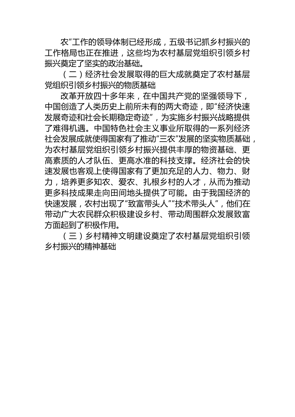 关于以基层党建引领新时代的乡村振兴的调研与思考党的二十大报告指出:“全面建设社会主义现代化国家,最艰巨最繁重的任务仍然在农村。”实践经验表明,要实现乡村全面振兴离不开党的集中统一领导,乡村发展、乡村建设、乡村治理等各项工作都离不开党建引领。为了全面深入了解农村基层党建引领乡村振兴的现状,我从2020年10月至今,在村担任驻村帮扶干部。将村作为“麻雀”进行细致解剖,主要采用半结构式访谈法、参与观察法等质性研究方法,对村“两委”干部、村老党员、群众代表、镇组织委员等进行了深度个案访谈,收集了大量一手资料,并在现场和集体讨论中获得了丰富的学术滋养,以期提出更有针对性的对策建设。一、新时代农村基层党组织引领乡村振兴面临的机遇党的十八大以来,我国经济社会发展取得了成就,乡村精神文明得到繁荣发展,这些都为农村基层党组织引领乡村振兴提供了良好的机遇和条件。(一)党对“三农”工作的重视奠定了农村基层党组织引领乡村振兴的政治基础面对全面建设社会主义现代化的强国目标,为了更好地解决“三农”问题,党中央不断作出重大战略部署。目前,党委统一领导、政府负责、农业农村工作部门统筹协调“三农”工作的领导体制已经形成,五级书记抓乡村振兴的工作格局也正在推进,这些均为农村基层党组织引领乡村振兴奠定了坚实的政治基础。(二)经济社会发展取得的巨大成就奠定了农村基层党组织引领乡村振兴的物质基础改革开放四十多年来,在中国共产党的坚强领导下,中国创造了人类历史上前所未有的两大奇迹,即“经济快速发展奇迹和社会长期稳定奇迹”,为实施乡村振兴战略提供了难得机遇。中国特色社会主义事业所取得的一系列经济社会发展成就使得国家有了推动“三农”发展的坚实物质基础,为农村基层党组织引领乡村振兴提供丰厚的物资基础、更高素质的人才队伍、更高水准的科技支撑。经济社会的快速发展也客观上使得国家有了更加充足的人力、物力、财力,培养更多知农、爱农、扎根乡村的人才,从而为推动更多科技成果走向田间地头提供了可能。由于我国经济的快速发展,农村出现了“致富带头人”“技术带头人”,他们在带动广大农民群众积极建设乡村、带动周围群众发展致富方面起到了积极作用。(三)乡村精神文明建设奠定了农村基层党组织引领乡村振兴的精神基础建设社会主义文化强国,农村是不可或缺的一环。党的十八大以来,农村精神文明建设取得了较大的成就,通过新时代文明实践中心(所、站)、农民夜校等载体,大力宣传党的路线、方针、政策,深入开展群众思想教育活动。在这一过程中,农民的理论素养得到提升,增进了农民对党的了解和党的路线方针政策的理解。农村思想道德建设改变了农民群众的精神面貌。此外,各地结合自身实际修订完善了乡规民约,依托“农村道德评议会”“红白喜事理事会”等,组织开展道德规范和行为引导活动;广泛开展各类评选表彰活动,诸如“时代楷模”“道德模范”“最美人物”“身边好人”等表彰活动,“好公婆”“好儿女”“好媳妇”“最美家庭”等评选活动,“文明户”“五好家庭”“文明信用户”“文明一条街”“文明示范村”“小康文明村”等创建活动,发挥好模范人物和典型做法的示范引领作用;积极开展移风易俗、反对封建迷信活动,旗帜鲜明地反对各种错误观点和封建思想,筑牢乡村意识形态阵地,努力营造睦邻友好、乐于奉献、积极进取的乡风和村风。这些举措为乡村振兴战略的顺利实施营造了良好的社会文化氛围。二、新时代农村基层党组织引领乡村振兴的困境当前,农村基层党建形势总体向好,但是也面临不少难题,影响了农村基层党组织功能的发挥。(一)农村基层党组织弱化问题由于改革的深化和社会大环境的变化,人们的思想认识和生活水平也有了不同程度的变化。随着土地、资金等资源向城市的单向流动,对农村经济发展造成了一定程度的影响,从而导致党员的分散性和流动性,使党员的组织性有所弱化,一部分农村党组织的正常活动难以开展,出现了村里有党组织但没有党员参加组织生活,而进城党员又无法参加组织生活的现象。农村进城务工人口的日益增多及农村流动党员的出现,成为新时期农村党组织建...