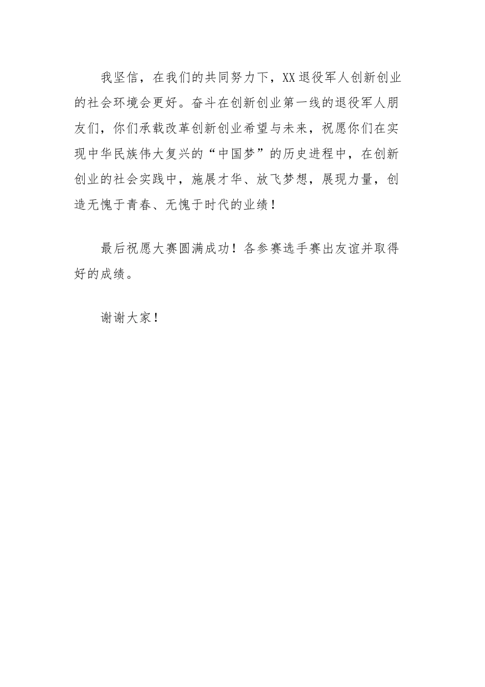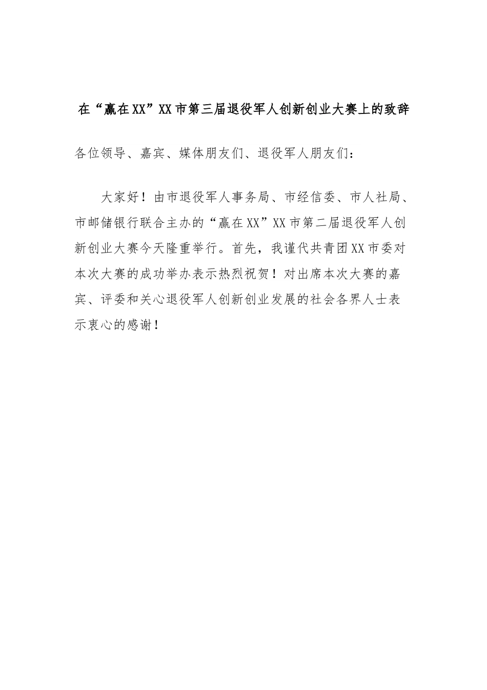 在“赢在XX”XX市第三届退役军人创新创业大赛上的致辞各位领导、嘉宾、媒体朋友们、退役军人朋友们:大家好!由市退役军人事务局、市经信委、市人社局、市邮储银行联合主办的“赢在XX”XX市第二届退役军人创新创业大赛今天隆重举行。首先,我谨代共青团XX市委对本次大赛的成功举办表示热烈祝贺!对出席本次大赛的嘉宾、评委和关心退役军人创新创业发展的社会各界人士表示衷心的感谢!创新是动力之源,当代退役军人要勇于创新创造,始终走在时代发展的前列,在实现中国梦的伟大实践中勇做奋进者、开拓者、奉献者。创业就业问题一直是党政关切、社会关注、退役军人关心的热点问题,是国家发展、社会进步的永恒动力。退役军人人充满活力、怀揣梦想、富有进取精神,是创新创业的生力军。近年来,市退役军人事务局紧紧围绕党和政府的中心工作,牢牢把握退役军人实际需求,通过实施项目带动、品牌带动、创新带动、服务带动的发展战略,以促进退役军人成长成才为目标。通过设立退役军人创业基金、开展退役军人创业培训、提供退役军人创业辅导、举办退役军人创业大赛、营造创业氛围等系列措施,不断优化XX退役军人创业就业环境,鼓励退役军人积极创业,帮助退役军人创业成功,为推动我市“奋力打造XX发展升级版”贡献了青春力量。“赢在XX”XX市第二届退役军人创新创业大赛是我市“戎退创业季”系列活动的重要组成部分。本次大赛自9月启动以来,受到了新闻媒体的广泛关注,退役军人热情参赛,参赛者来源广泛多样、水平较高、实施性强。今天,各位参赛者将以更崭新的面貌迎接大赛的挑战。我坚信,在我们的共同努力下,XX退役军人创新创业的社会环境会更好。奋斗在创新创业第一线的退役军人朋友们,你们承载改革创新创业希望与未来,祝愿你们在实现中华民族伟大复兴的“中国梦”的历史进程中,在创新创业的社会实践中,施展才华、放飞梦想,展现力量,创造无愧于青春、无愧于时代的业绩!最后祝愿大赛圆满成功!各参赛选手赛出友谊并取得好的成绩。谢谢大家!