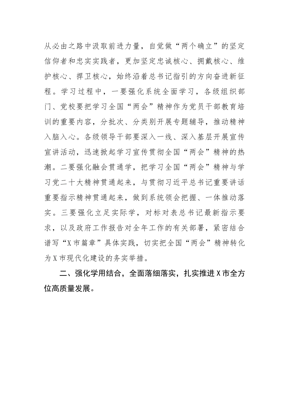 在市委常委会(扩大)会议上传达学习全国“两会”时的讲话同志们:3月4日至13日,十四届全国人大一次会议和全国政协十四届一次会议在北京胜利召开。今天的市委常委会(扩大)会议,主要任务是传达学习贯彻全国“两会”精神和省委常委会(扩大)会议精神,研究我市贯彻意见。近段时间以来,大家通过各类新闻媒体,对全国“两会”精神都已经作了学习,这里再简要传达下。这次全国“两会”,是在全国上下深入学习贯彻党的二十大精神开局之年、“十四五”规划承上启下的关键之年,召开的一次重要会议。大会期间,习近平总书记三次下团组参加审议讨论,分别是江苏代表团审议、政协会议的民建工商联界委员、解放军和武警部队代表团,并发表了系列重要讲话。习近平总书记的重要讲话,高屋建瓴、思想深刻、内涵丰富,具有很强的政治性、思想性、理论性,为我们学习贯彻全国“两会”精神,扎扎实实办好X市的事、做好X市工作,提供了重要遵循、注入了强大动力。大会的各份报告特别是李克强总理所作的政府工作报告,总结成绩客观务实,分析形势精准深刻,部署工作指向明确,对于做好今年经济社会发展各项工作具有重要指导作用。全市各级各部门要把思想和行动统一到习近平总书记重要讲话和全国“两会”精神,准确把握其中的丰富内涵,认真按照省委工作要求,不折不扣抓好贯彻落实,努力以谱写“X市篇章”的新进展、新成效,为全国全省大局作出更大贡献。这里,我强调几点贯彻意见:一、强化政治意识,把握精神实质,更加坚定自觉捍卫“两个确立”、做到“两个维护”。学习宣传贯彻全国“两会”精神,是当前和今后一个时期的重要政治任务。特别要把学习贯彻习近平总书记在全国“两会”期间的重要讲话精神作为重中之重,坚持不懈用习近平新时代中国特色社会主义思想武装头脑、指导实践、推动工作,不断从必由之路中汲取前进力量,自觉做“两个确立”的坚定信仰者和忠实实践者,更加坚定忠诚核心、拥戴核心、维护核心、捍卫核心,始终沿着总书记指引的方向奋进新征程。学习过程中,一要强化系统全面学习,各级组织部门、党校要把学习全国“两会”精神作为党员干部教育培训的重要内容,分批次、分类别开展专题辅导,推动精神入脑入心。各级领导干部要深入一线、深入基层开展宣传宣讲活动,迅速掀起学习宣传贯彻全国“两会”精神的热潮。二要强化融会贯通学,把学习全国“两会”精神与学习党二十大精神贯通起来,与贯彻习近平总书记重要讲话重要指示精神贯通起来,做到系统领会把握、一体推动落实。三要强化立足实际学,对标对表总书记最新指示要求,以及政府工作报告对全年工作的有关部署,紧密结合谱写“X市篇章”具体实践,切实把全国“两会”精神转化为X市现代化建设的务实举措。二、强化学用结合,全面落细落实,扎实推进X市全方位高质量发展。学习贯彻全国“两会”和省委常委会(扩大)会议精神,关键在于对标对表抓落实,推动X市经济社会发展。我们要认真按照中央和省委的部署要求,坚持完整、准确、全面贯彻新发展理念,努力在全方位推进高质量发展上迈出新步伐。一要着力实现经济稳定。今年经济社会发展任务重、挑战多,全国确定5%的增速目标,凸显了稳字当头、稳中求进的主基调。市委、市政府围绕“稳定保持良好发展态势、稳定保持全省领跑势头”,提出了全年经济增长X%以上的目标,增速分别比全国全省高了X和X个百分点。我们要坚持把X市放在全国全省发展的大背景下去思考谋划,统筹局部与全局、当前与长远、外部与内部、对上与对下的关系,找准各领域的短板差距在哪里、堵点痛点在哪里、潜力空间在哪里,进一步明确“时间表”、划定“路线图”、完善“任务书”,确保经济平稳健康发展,继续创造令人刮目相看的“X市精彩”。二要着力强化政策对接。政府工作报告从8个方面,对全年工作作了全面部署,并在扩大内需、产业体系、助企纾困、乡村振兴、绿色低碳、改善民生等方面出台系列真金白银的政策措施,包括“安排地方政府专项债券3.8万亿元”“有效防范化解优质头部房企风险”“实施新一轮千亿斤粮食产能提升行动”等,都与X市发展息息相关,而且政策一插到底、直接惠企利民。各级各部门要...