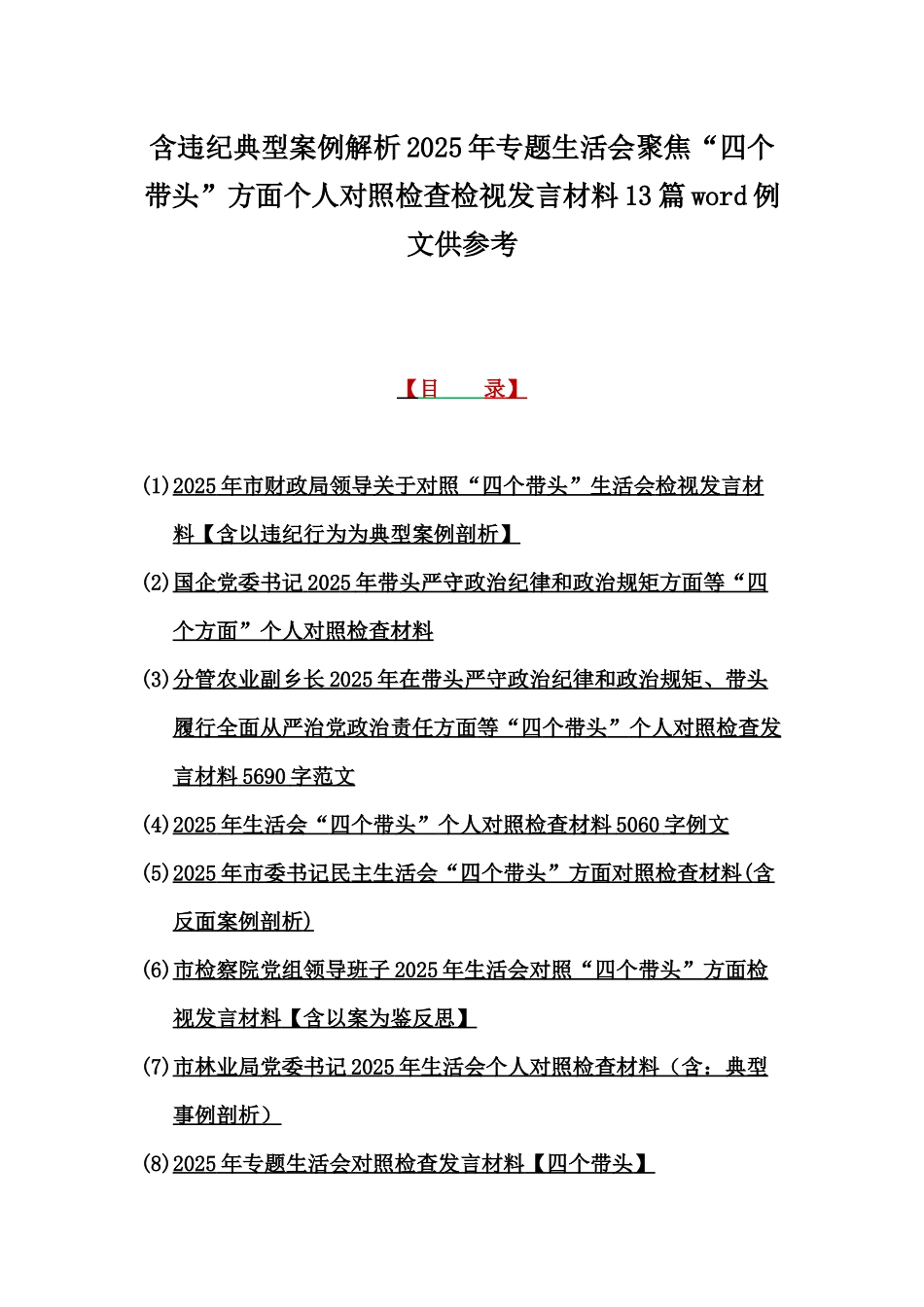 含违纪典型案例解析2025年专题生活会聚焦“四个带头”方面个人对照检查检视发言材料13篇word例文供参考【目录】(1)2025年市财政局领导关于对照“四个带头”生活会检视发言材料【含以违纪行为为典型案例剖析】(2)国企党委书记2025年带头严守政治纪律和政治规矩方面等“四个方面”个人对照检查材料(3)分管农业副乡长2025年在带头严守政治纪律和政治规矩、带头履行全面从严治党政治责任方面等“四个带头”个人对照检查发言材料5690字范文(4)2025年生活会“四个带头”个人对照检查材料5060字例文(5)2025年市委书记民主生活会“四个带头”方面对照检查材料(含反面案例剖析)(6)市检察院党组领导班子2025年生活会对照“四个带头”方面检视发言材料【含以案为鉴反思】(7)市林业局党委书记2025年生活会个人对照检查材料(含:典型事例剖析)(8)2025年专题生活会对照检查发言材料【四个带头】(9)市委书记2025年紧紧围绕带头增强党性、严守纪律、砥砺作风方面等“四个带头”个人对照检查材料4170字范文稿(10)2025年领导班子民主生活会“四个带头”方面对照检查材料(上年度整改+准备情况)(11)2025年市财政局党组书记、局长对照“四个带头”方面生活会个人对照检视发言材料(含以案为鉴、以案促改促治方面)(12)镇长2024年对照带头严守政治纪律和政治规矩,维护党的团结统一等“四个方面”对照检查材料(反面典型案例剖析)(13)税务局领导班子2025年围绕带头增强党性、严守纪律、砥砺作风方面等“四个带头”生活会对照检查材料2025年市财政局领导关于对照“四个带头”生活会检视发言材料【含以违纪行为为典型案例剖析】按照市委关于召开2024年度党员领导干部民主生活会工作要求,通过深入学习习近平新时代中国特色社会主义思想,对照党中央和省委的要求,结合财政工作实际,全面检视问题,深刻剖析原因,明确努力方向和改进措施,以确保财政工作更好地服务于XX市经济社会发展大局。现将领导班子对照检查情况报告如下。一、学习贯彻习近平新时代中国特色社会主义思想主题教育专题民主生活会整改措施落实情况(一)强化理论学习,提高政治站位。通过组织专题学习研讨、邀请专家讲座等方式,深入学习习近平新时代中国特色社会主义思想。今年共开展集中学习20次,专题研讨10次,邀请专家讲座5次,班子成员撰写学习心得30余篇,切实增强了“四个意识”、坚定了“四个自信”、做到了“两个维护”。在财政工作中,积极贯彻落实党中央关于财政工作的方针政策,如在制定全市财税发展规划时,充分结合习近平总书记关于经济工作的重要论述,确保规划符合国家战略导向。(二)聚焦财政改革,提升工作效能。积极推进财政体制改革,如深化预算管理制度改革,全面实施预算绩效管理。今年对市级100个重点项目进行了绩效评价,涉及资金50亿元,评价结果作为预算安排的重要依据,提高了财政资金使用效益。同时,优化政府采购流程,降低政府采购成本,今年政府采购节约资金率达到10%,有效提升了财政工作效能。(三)加强作风建设,树立良好形象。严格落实中央八项规定及其实施细则精神,加强对干部职工的日常监督管理。今年开展作风纪律检查12次,对发现的5起违规问题进行了及时纠正和处理。积极开展廉政教育活动,组织观看警示教育片3次,参观廉政教育基地2次,增强了干部职工的廉洁自律意识,树立了财政部门的良好形象。二、存在的突出问题(一)在带头严守政治纪律和政治规矩,维护党的团结统一方面。一是政治理论学习深度不够。虽然积极组织各类政治学习活动,但部分班子成员在学习过程中存在一知半解、浅尝辄止的情况。例如,在学习习近平总书记关于财政工作的重要指示精神时,未能深入领会其内涵和实质,导致在实际工作中对一些政策的把握不够精准。二是贯彻落实上级决策部署存在差距。在贯彻落实党中央、省委关于财政工作的决策部署时,有时存在打折扣、搞变通的现象。如在推进减税降费政策落实过程中,个别县区财政部门未能及时足额兑现政策,影响了政策的实施效果。三是党内政治生活不够严肃。民主生活会、组织生活会等党内政治生活的质量有待提高。部分班子成员在开展批评与自我批评时,存在避重就轻、辣味不足的...
