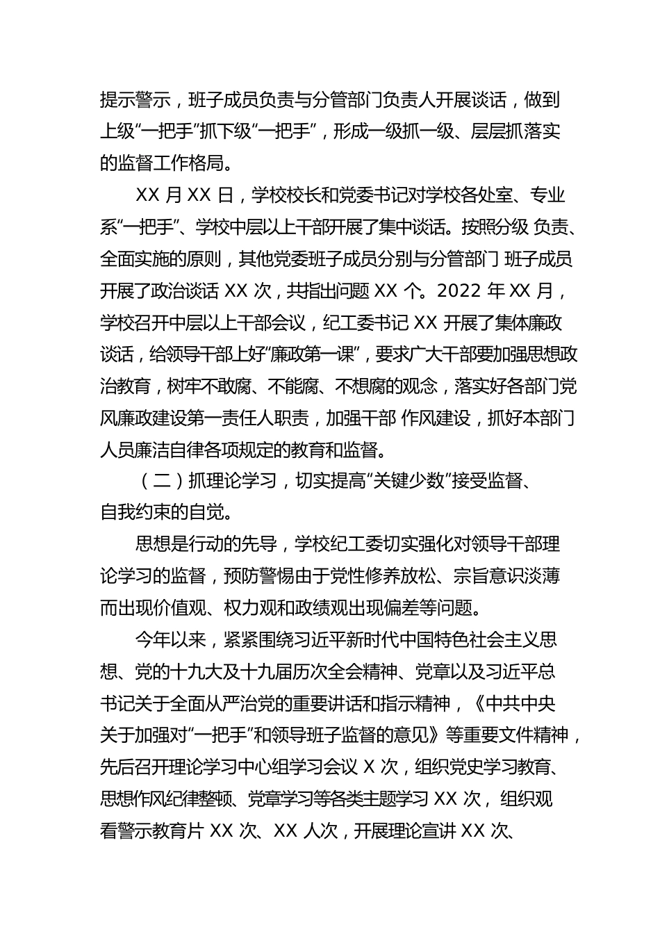 关于学校落实《关于加强对“一把手”和领导班子监督的意见》监督检查情况报告根据省纪委《关于对<中共中央关于加强对“一把手”和领导班子监督的意见>贯彻落实情况开展专项监督检查的工作方案》要求,学校纪工委牢牢抓住监督这一基本职责、第一职责,紧盯领导干部特别是“一把手”这一关键少数,不断改进监督方式,加大监督力度,推动“一把手”和领导班子监督工作走深走实,取得实效。现将监督检查情况报告如下:一、监督检查情况(一)抓责任履行,压实管党治党政治责任。纪工委督促学校党委会第一时间传达学习了《中共中央关于加强对“一把手”和领导班子监督的意见》文件精神,要求党委领导班子和党员领导干部深刻学习领会,自觉履行监督职责,主动接受监督约束。学校党委建立完善了全面从严治党“三个清单”,逐一明确党委党组主体责任、党委书记第一责任人责任、班子成员“一岗双责”和纪工委监督责任内容,进一步压实管党治党政治责任。纪工委督促学校党委制定并印发了《中共XX市XX学校委员会关于开展政治谈话的工作方案》,明确党委书记作为第一责任人,要定期与班子成员和下级“一把手”谈心谈话、提示警示,班子成员负责与分管部门负责人开展谈话,做到上级“一把手”抓下级“一把手”,形成一级抓一级、层层抓落实的监督工作格局。XX月XX日,学校校长和党委书记对学校各处室、专业系“一把手”、学校中层以上干部开展了集中谈话。按照分级负责、全面实施的原则,其他党委班子成员分别与分管部门班子成员开展了政治谈话XX次,共指出问题XX个。2022年XX月,学校召开中层以上干部会议,纪工委书记XX开展了集体廉政谈话,给领导干部上好“廉政第一课”,要求广大干部要加强思想政治教育,树牢不敢腐、不能腐、不想腐的观念,落实好各部门党风廉政建设第一责任人职责,加强干部作风建设,抓好本部门人员廉洁自律各项规定的教育和监督。(二)抓理论学习,切实提高“关键少数”接受监督、自我约束的自觉。思想是行动的先导,学校纪工委切实强化对领导干部理论学习的监督,预防警惕由于党性修养放松、宗旨意识淡薄而出现价值观、权力观和政绩观出现偏差等问题。今年以来,紧紧围绕习近平新时代中国特色社会主义思想、党的十九大及十九届历次全会精神、党章以及习近平总书记关于全面从严治党的重要讲话和指示精神,《中共中央关于加强对“一把手”和领导班子监督的意见》等重要文件精神,先后召开理论学习中心组学习会议X次,组织党史学习教育、思想作风纪律整顿、党章学习等各类主题学习XX次,组织观看警示教育片XX次、XX人次,开展理论宣讲XX次、XX人次,督促领导干部增进政治认同、理论认同,不断筑牢践行“两个维护”的思想根基。(三)抓制度执行,构建常态化监督体系。《中共中央关于加强对“一把手”和领导班子监督的意见》对贯彻执行全面从严治党责任制度、民主集中制、“三重一大”决策监督机制、巡视巡察、述责述廉等制度机制提出明确要求。学校纪工委督促党委认真贯彻落实《意见》,将实践中行之有效的做法和经验,上升为制度规范。一是制定了《中共XXXX市XX学校委员会关于政治谈话的方案》、《XXXX市XX学校纪工委强化政治监督推动高质量发展工作清单》、《市XX学校纪工委关于深化专项治理严防吃喝送礼歪风变异回潮的监督工作方案》、《规范廉洁意见的通知》、《关于“三重一大”事项集体决策实施细则》、《深入推进廉洁学校建设的实施意见》等一系列规范性文件,印发了《XXXX市XX学校各类津贴、补贴、补助、劳务费等项目清单》,扎牢制度笼子,拧紧廉政发条,把纪律和规矩挺在前面,为防范廉政风险筑牢了拒腐防变对坚固防线。二是严格执行党委会议事规则,规范“关键少数”权力运行。XXXX学校严格落实了《党委会议事规则》、“三重一大”事项集体决策、“一把手”末位表态等制度,实行了全程纪实制度。学校纪工委加强了事前、事中、事后监督,做到监督贯穿事前酝酿、事中商量和事后执行全过程,准时觉察问题、精准纠正偏差,切实做到“一把手”权力运行风险可防可控。纪工委围绕贯彻重大决策部署、教育收费工作、教师招聘、绩效工资考核发放等重点工作和关键环节开...
