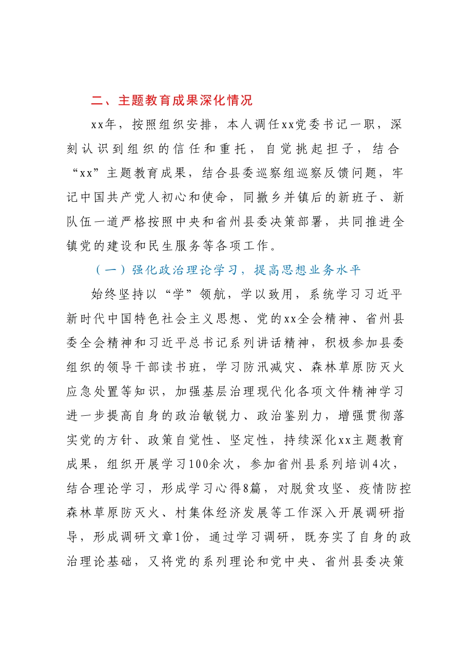 党员领导个人查摆问题整改情况报告自开展“xx”主题教育以来,本人始终坚持问题导向正视问题,刀刃向内,将整改贯穿始终主题教育始终,而自己不论在xx还是xx任职,都将学习教育、调查研究、检视问题、整改落实作为自身工作水平和执政能力提升的重要途径,主题教育成果不断深化和固化。一、问题检视和整改情况xx年从“18个是否”方面检视主要存在理论学习有差距,带动群众发展经济上有差距,从群众中来、到群众中去有差距,意识形态工作学以致用有差距,党要管党、从严治党落实有差距,存在一定的形式主义和官僚主义,家风家教有所松懈以及从上级党组织反出烟果矛盾日益凸显等问题。对于自身检视出的xx个方面的问题,深入剖析症结,深刻反思原因,逐条逐项制定整改措施。认真按照省、州县委要求,坚持边学边改、立查立改,以整改落实成果检验主题教育实效。召开专项整治工作推进会议,对调研发现的问题、群众反映的问题、自身查找的问题、上级点出的问题列出清单、建立台账,从理论学习加强、党性修养强化、责任担当落实、工作作风转变、业务工作不断抓实等方面着手,逐条研究制定具体的解决办法和整改措施,能够当下改的,立行立改、即知即改,截至xx年12月底,已全部整改完成。二、主题教育成果深化情况xx年,按照组织安排,本人调任xx党委书记一职,深刻认识到组织的信任和重托,自觉挑起担子,结合“xx”主题教育成果,结合县委巡察组巡察反馈问题,牢记中国共产党人初心和使命,同撤乡并镇后的新班子、新队伍一道严格按照中央和省州县委决策部署,共同推进全镇党的建设和民生服务等各项工作。(一)强化政治理论学习,提高思想业务水平始终坚持以“学”领航,学以致用,系统学习习近平新时代中国特色社会主义思想、党的xx全会精神、省州县委全会精神和习近平总书记系列讲话精神,积极参加县委组织的领导干部读书班,学习防汛减灾、森林草原防灭火应急处置等知识,加强基层治理现代化各项文件精神学习进一步提高自身的政治敏锐力、政治鉴别力,增强贯彻落实党的方针、政策自觉性、坚定性,持续深化xx主题教育成果,组织开展学习100余次,参加省州县系列培训4次,结合理论学习,形成学习心得8篇,对脱贫攻坚、疫情防控森林草原防灭火、村集体经济发展等工作深入开展调研指导,形成调研文章1份,通过学习调研,既夯实了自身的政治理论基础,又将党的系列理论和党中央、省州县委决策部署实化为推动指导实际工作的不竭动力。(二)主动担当作为,全面推进从严治党一是始终坚持主动作为,强化干部廉洁意识。严格执行规定,认真履职尽责,敢于担当负责、敢于逗硬较真,坚决防止“四风”反弹回潮,不断加强党风廉政建设工作,持续推进正风肃纪,同时一如既往教育好子女,管好家人及亲属。二是严格落实“一岗双责”,层层签订责任书,健全完善“两个责任”清单,讲廉政党课3次,同班子成员、镇、村干部开展谈心谈话,既加强了思想教育、又加强了严格管理。三是积极动员全镇人民群众参与党风廉政建设工作,按照干部包片,党员包户,加大宣传满意度评价工作力度取得xx的良好成绩。四是做好县委巡察整改“后半篇文章”。对于xx反馈的3方面8个问题,镇党委班子研究整改方案,召开专题民主生活会,深刻剖析思想层面的问题,提出整改措施,邀请组织和纪检部门列席指导,进一步严肃工作纪律,切实加强干部队伍建设。五是切实转变工作作风,在狠抓落实上下功夫,对上级交办的工作,不拖沓不过夜、不敷衍,养成雷厉风行的工作作风;进一步提升工作落实的质量标准,不凑合、不自我放松,以落实工作的成效促进经济社会发展实效。六是坚决执行民主集中制原则,充分听取和尊重不同意见,不搞“一言堂”、个人说了算,坚持凡是人事安排、重大项目建设和资金使用等都由班子集体研究决定、民主决策,切实把权力关进制度的笼子。(三)久久为功,攻占意识形态工作新高地牢牢掌握意识形态这个“牛鼻子”,一是强化组织领导,严格责任落实,成立意识形态工作责任领导小组,制定签订意识形态工作目标责任书、网络意识形态安全责任书xx份,严格落实党管意识形态工作制度,建立完善意识形态领域分析研判机制、...
