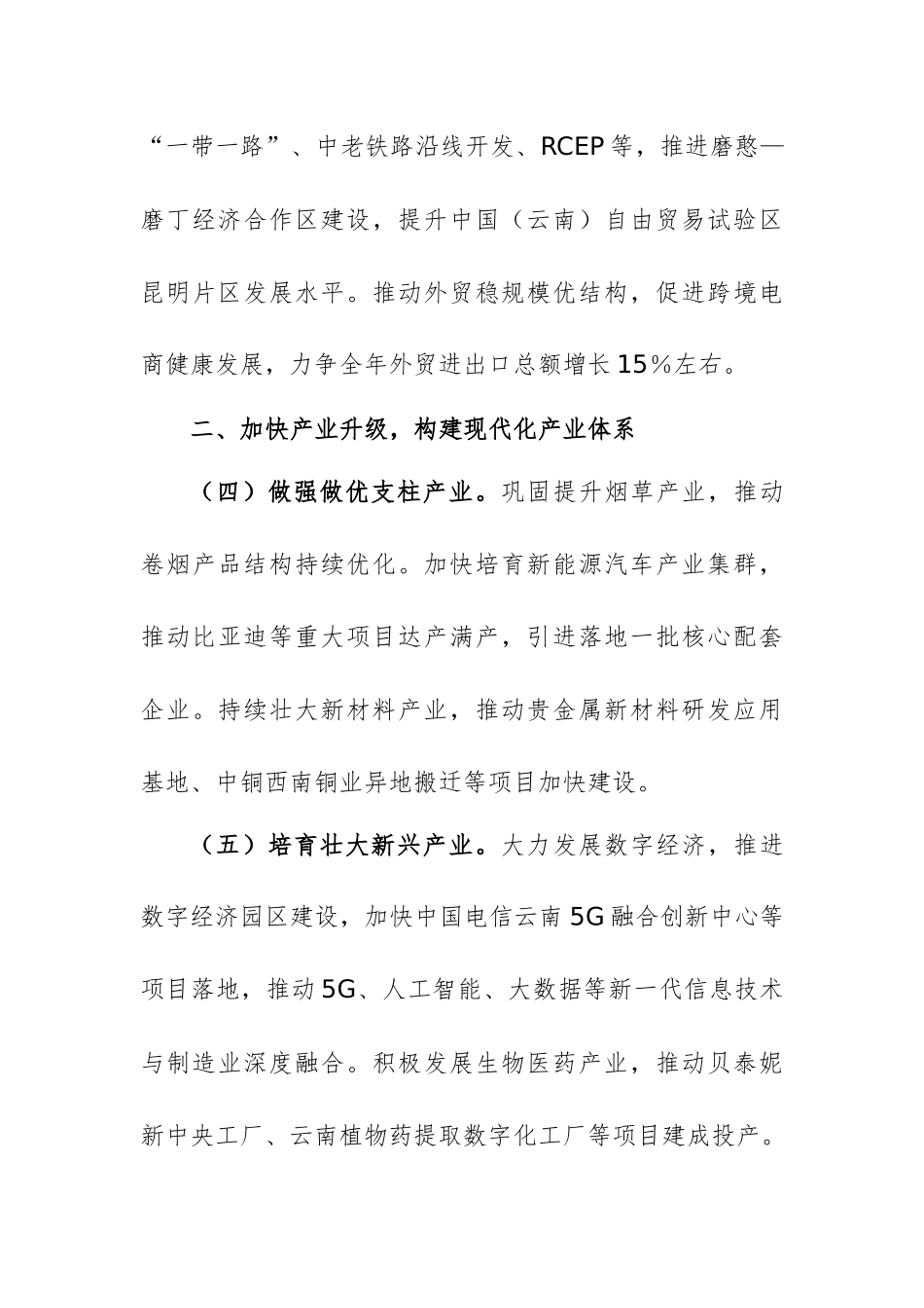发展改革局2025年度工作要点范文2025年是“十四五”规划的收官之年,是“十五五”规划的开启之年,更是全面贯彻落实党的二师姐三中全会精神的关键一年。xx市发展改革局将坚持以习近平新时代中国特色社会主义思想为指导,全面贯彻落实党的二十大和二十届历次全会精神,深入贯彻习近平总书记考察云南重要讲话和重要指示批示精神,认真落实党中央、国务院决策部署和省委、省政府工作要求,按照市委、市政府工作安排,坚持稳中求进工作总基调,完整、准确、全面贯彻新发展理念,服务和融入新发展格局,着力推动高质量发展,更好统筹疫情防控和经济社会发展,更好统筹发展和安全,突出做好稳增长、稳就业、稳物价工作,推动经济运行整体好转,实现质的有效提升和量的合理增长,为xx市经济社会持续健康发展作出积极贡献。一、着力扩大内需,增强经济发展内生动力(一)全力推动投资持续增长。坚持项目为王,完善重大项目储备、开工、在建、竣工“四张清单”,实施“骏马”“蜗牛”项目常态化管理,持续掀起项目建设热潮。强化要素保障创新,完善“一项目一方案”推进机制提升项目审批、用地、用能、环评等要素保障效率。力争全年固定资产投资增长10%以上,产业投资占比提高到50%以上,民间投资占比保持在50%左右。(二)积极促进消费复苏升级。大力实施“彩云昆明消费券”促销活动,鼓励汽车、家电等大宗消费,促进餐饮、住宿、文旅等服务业消费加快恢复。推动一刻钟便民生活圈建设,培育一批夜间经济示范街区,促进电商直播在线文娱等新业态健康发展。力争全年社会消费品零售总额增长8%以上。(三)全面提升对外开放水平。主动服务和融入共建“一带一路”、中老铁路沿线开发、RCEP等,推进磨憨—磨丁经济合作区建设,提升中国(云南)自由贸易试验区昆明片区发展水平。推动外贸稳规模优结构,促进跨境电商健康发展,力争全年外贸进出口总额增长15%左右。二、加快产业升级,构建现代化产业体系(四)做强做优支柱产业。巩固提升烟草产业,推动卷烟产品结构持续优化。加快培育新能源汽车产业集群,推动比亚迪等重大项目达产满产,引进落地一批核心配套企业。持续壮大新材料产业,推动贵金属新材料研发应用基地、中铜西南铜业异地搬迁等项目加快建设。(五)培育壮大新兴产业。大力发展数字经济,推进数字经济园区建设,加快中国电信云南5G融合创新中心等项目落地,推动5G、人工智能、大数据等新一代信息技术与制造业深度融合。积极发展生物医药产业,推动贝泰妮新中央工厂、云南植物药提取数字化工厂等项目建成投产。(六)改造提升传统产业。推动钢铁、有色、化工等传统产业绿色化、智能化改造,加快云南磷化集团氟硅酸制氢氟酸等转型升级项目建设。实施先进装备制造业倍增计划,推动昆船智能物流装备产业化基地、云内动力国六发动机关键零部件生产线扩能等项目加快建设。三、深化改革创新,激发经济发展活力(七)深入推进重点领域改革。深化“放管服”改革,推动更多政务服务事项“一网通办”“跨省通办”。持续推进要素市场化配置改革,完善土地二级市场建设,扩大工业用地长期租赁、先租后让、弹性年期出让等供地方式深化国资国企改革,推动国有经济布局优化和结构调整。(八)强化创新驱动发展。加快构建“5+5+N”现代产业创新体系,推动稀贵金属材料基因工程、云南省细胞库等创新平台建设。深入实施创新型企业和高新技术企业“双倍增”计划,力争全年净增高新技术企业150家以上。(九)扩大高水平开放合作。主动对接长江经济带发展、粤港澳大湾区建设等国家重大战略,深化与成渝地区双城经济圈等周边区域合作。加强国际产能合作,推动“走出去”和“引进来”有机结合。四、推进乡村振兴,促进城乡融合发展(十)巩固拓展脱贫攻坚成果。严格落实“四个不摘”要求,健全防止返贫动态监测和帮扶机制,确保脱贫人口和监测对象不出现规模性返贫。加强易地扶贫搬迁后续扶持,促进搬迁群众稳定就业增收。(十一)加快农业农村现代化建设。深入实施“百县千镇万村”建设工程,推进乡村振兴“十百千”示范创建打造一批乡村振兴示范园(田园综合体)、精品示范村、美丽村庄。加快高标...