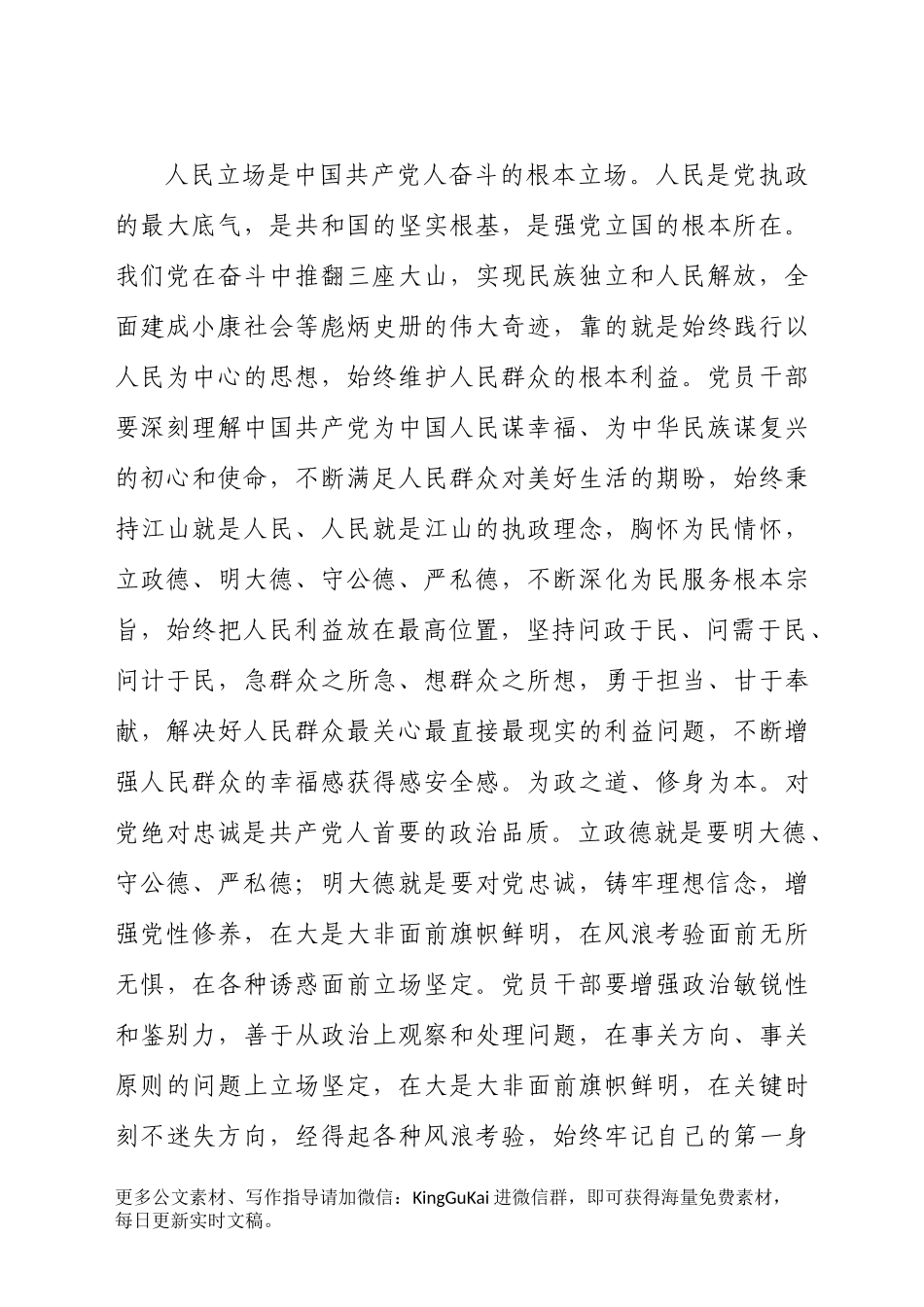 党课讲稿发言材料:用理想之光照亮奋进之路了解历史才能看得远,铭记历史才能行得远。我们党历来高度重视党史学习教育,注重用党的奋斗历程和伟大成就鼓舞斗志、明确方向,用党的光荣传统和优良作风坚定信念、凝聚力量,用党的实践创造和历史经验启迪智慧、砥砺品格。党的十八大以来,党中央先后部署开展了党的群众路线教育实践活动、“三严三实”专题教育、“两学一做”学习教育、“不忘初心牢记使命”主题教育,在庆祝建党百年华诞的重大时刻和“两个一百年”奋斗目标历史交汇的关键节点,党中央决定在全党集中开展党史学习教育,正当其时、十分必要。我们要按照中央的决策部署,胸怀两个大局、心系国之大者,把党的历史学习好、总结好,把党的成功经验传承好、发扬好,不断提高政治判断力、政治领悟力、政治执行力,用党史之光照亮奋进之路,用信仰之力开创美好未来。崇高的理想、坚定的信念,是中国共产党人的政治灵魂。学习党的历史,是坚持和发展中国特色社会主义,把党和国家事业继续推向前进的必修课,是党的政治生活中的一件大事。党员干部要深刻领会、融会贯通、躬身践行,学好党史这门必修课,在学习领悟中坚定理想信念,更多公文素材、写作指导请加微信:KingGuKai进微信群,即可获得海量免费素材,每日更新实时文稿。在奋发有为中践行初心使命,在实际工作中永葆政治本色,做到知史爱党、知史爱国。一要聚焦学史崇德,提升思想境界,补足精神之钙,增强党性修养。更多公文素材、写作指导请加微信:KingGuKai进微信群,即可获得海量免费素材,每日更新实时文稿。人民立场是中国共产党人奋斗的根本立场。人民是党执政的最大底气,是共和国的坚实根基,是强党立国的根本所在。我们党在奋斗中推翻三座大山,实现民族独立和人民解放,全面建成小康社会等彪炳史册的伟大奇迹,靠的就是始终践行以人民为中心的思想,始终维护人民群众的根本利益。党员干部要深刻理解中国共产党为中国人民谋幸福、为中华民族谋复兴的初心和使命,不断满足人民群众对美好生活的期盼,始终秉持江山就是人民、人民就是江山的执政理念,胸怀为民情怀,立政德、明大德、守公德、严私德,不断深化为民服务根本宗旨,始终把人民利益放在最高位置,坚持问政于民、问需于民、问计于民,急群众之所急、想群众之所想,勇于担当、甘于奉献,解决好人民群众最关心最直接最现实的利益问题,不断增强人民群众的幸福感获得感安全感。为政之道、修身为本。对党绝对忠诚是共产党人首要的政治品质。立政德就是要明大德、守公德、严私德;明大德就是要对党忠诚,铸牢理想信念,增强党性修养,在大是大非面前旗帜鲜明,在风浪考验面前无所无惧,在各种诱惑面前立场坚定。党员干部要增强政治敏锐性和鉴别力,善于从政治上观察和处理问题,在事关方向、事关原则的问题上立场坚定,在大是大非面前旗帜鲜明,在关键时刻不迷失方向,经得起各种风浪考验,始终牢记自己的第一身更多公文素材、写作指导请加微信:KingGuKai进微信群,即可获得海量免费素材,每日更新实时文稿。份是共产党员,第一职责是为党工作,在任何时候都与党同心同德同行,时刻不忘实现中华民族伟大复兴的初心使命,始终保持共产党人的政治本色。守公德就是要强化宗旨意识,全心全意为人民服务,恪守立党为公、执政为民理念,更多公文素材、写作指导请加微信:KingGuKai进微信群,即可获得海量免费素材,每日更新实时文稿。自觉践行人民对美好生活的向往就是我们的奋斗目标的承诺,做到心底无私天地宽,深怀爱民之心、恪守为民之责、善谋富民之策、多办利民之事,切实解决人民群众急难愁盼问题,真正把大事办成、小事办实、急事办妥、难事办好,把全心全意为人民服务作为根本宗旨和行为指向。严私德就是要严格约束自己的操守和行为。只有严私德才能守公德、明大德。党员干部要自觉践行社会主义核心价值观,带头恪守社会公德、遵从职业道德、培育家庭美德、修炼个人品德,严于律己,严格家教家风,不断提升自己的思想境界,做到慎独慎微,时刻筑牢防线、守住底线、不触红线,树立党员干部良好的作风和形象。二要聚焦学史明理,坚定理想信念,筑牢信仰之...
