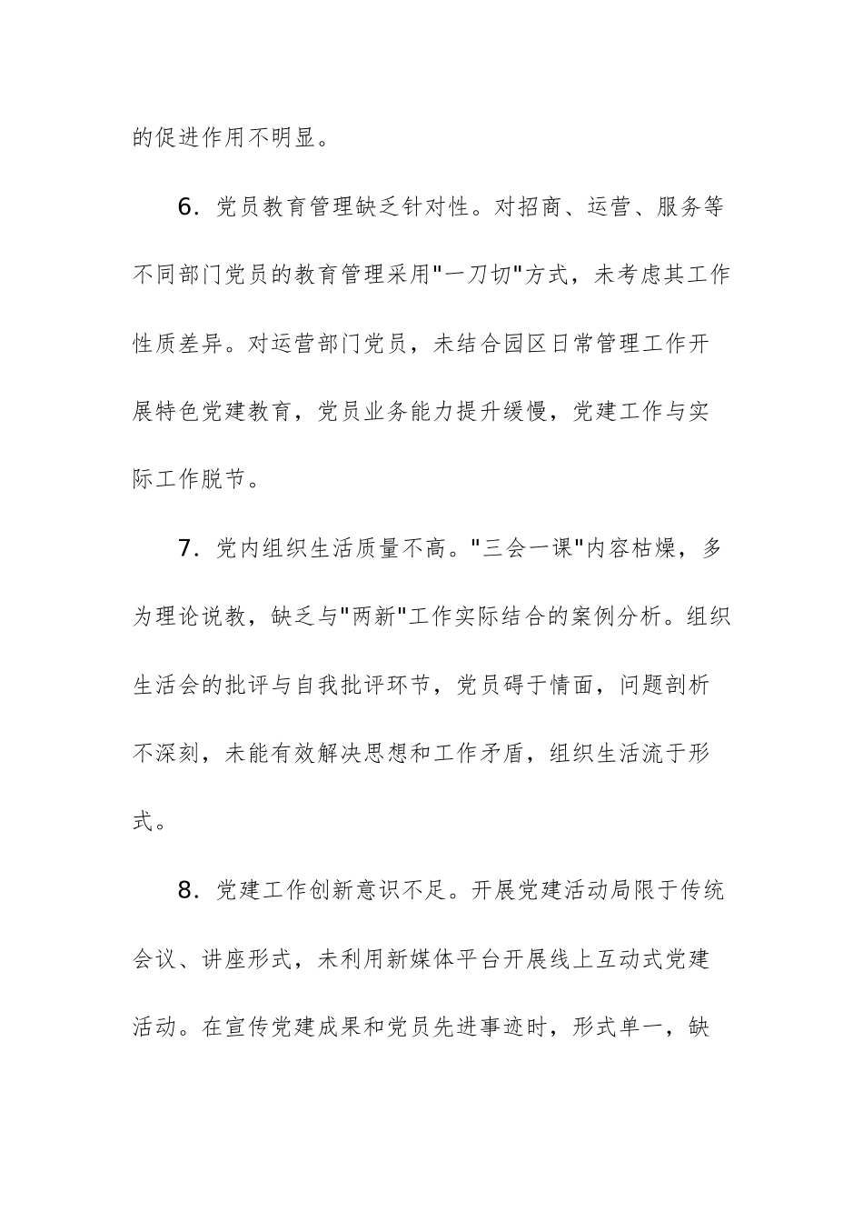 2024年组织生活会上对两新党工委党支部书记的批评意见供参考1.理论学习缺乏深度与转化。在组织党员学习国家关于支持"两新"发展政策时,仅简单宣读文件,未结合园区企业设备更新、消费品以旧换新业务实例深入剖析。导致党员对政策理解浮于表面,难以将理论转化为助力企业发展的实际行动,政策落地效果不佳。2.党建与业务融合规划缺失。对于党建如何融入招商部门吸引优质"两新"企业入驻、服务部门助力企业享受政策红利等核心业务,缺少系统性规划。开展党建活动时,未考虑各部门业务节奏,使党建与业务协同性差,无法有效发挥党建引领作用。3.工作作风浮躁影响项目推进。在推进园区"两新"政策试点项目时,急于求成,前期准备工作不充分。未全面考虑企业需求、市场反馈等因素,导致项目实施过程中问题频发,如补贴申请流程繁琐,企业参与积极性受挫,项目进度滞后。4.联系企业与员工不够深入。很少深入园区企业和员工群体,对企业在政策解读、业务指导方面的需求,以及员工薪资待遇、职业发展等诉求了解不全面。组织的服务活动针对性不强,未能切实解决企业和员工的实际困难,满意度较低。5.党建引领作用发挥不充分。在园区企业面临市场竞争、转型升级等挑战时,未能充分发挥党组织的引领作用,组织党员为企业出谋划策、解决难题。各部门党员缺乏协作,难以形成助力企业发展的强大合力,党建对企业发展的促进作用不明显。6.党员教育管理缺乏针对性。对招商、运营、服务等不同部门党员的教育管理采用"一刀切"方式,未考虑其工作性质差异。对运营部门党员,未结合园区日常管理工作开展特色党建教育,党员业务能力提升缓慢,党建工作与实际工作脱节。7.党内组织生活质量不高。"三会一课"内容枯燥,多为理论说教,缺乏与"两新"工作实际结合的案例分析。组织生活会的批评与自我批评环节,党员碍于情面,问题剖析不深刻,未能有效解决思想和工作矛盾,组织生活流于形式。8.党建工作创新意识不足。开展党建活动局限于传统会议、讲座形式,未利用新媒体平台开展线上互动式党建活动。在宣传党建成果和党员先进事迹时,形式单一,缺乏吸引力,难以激发园区企业和员工参与党建的热情,党建影响力有限。9.年轻党员培养体系不完善。没有针对年轻党员制定个性化培养计划,在园区重点项目推进、新政策落实等关键工作中,给年轻党员的锻炼机会较少。年轻党员成长路径不清晰,难以快速成长为业务骨干,影响园区人才队伍建设。10.党建宣传工作效果欠佳。党建宣传主要依赖园区公告栏,未充分利用官网、公众号等新媒体平台。宣传内容侧重理论政策,缺乏对园区"两新"工作中党建与企业发展融合的典型案例报道,无法有效吸引企业和员工关注,党建宣传作用未充分发挥。11.工作执行拖延影响政策落实。上级党组织要求开展的"党员助力企业政策落实"活动,未能及时制定方案并推进。拖延导致活动错过企业政策需求高峰期,党员参与度不高,政策落实效果大打折扣,企业对政策知晓和利用程度低。12.缺乏园区整体发展大局观。谋划党建工作时,仅从党支部自身出发,未将党建与园区整体"两新"发展战略紧密结合。与其他党支部在联合开展党建活动、推动园区企业协同发展方面沟通协作不足,难以形成园区党建工作的整体优势。13.党建活动载体单一。组织党建活动形式单一,除常规学习和文体活动外,缺乏结合园区产业特色和"两新"工作的活动。例如,未开展与设备更新技术创新、消费品以旧换新服务优化相关的党建竞赛活动,无法有效激发党员创新创造活力。14.民主决策落实不到位。讨论园区重大党建活动方案、党员发展等事项时,未广泛征求各部门党员意见。决策过程不透明,部分党员对决策结果不理解,执行积极性不高,影响党建工作推进效率。15.忽视党员思想动态关注。很少与党员谈心谈话,不了解党员在工作压力、职业发展、家庭生活等方面的困扰。党员出现思想波动时,不能及时发现和疏导,导致工作积极性下降,党组织凝聚力减弱。16.党风廉政建设工作薄弱。廉政教育形式单一,多为传达文件、观看警示片,缺乏针对性和实效性。对园区项目审批、资金补贴发放等关键环节的廉政风险防控不到位,存在制度漏洞,易滋...