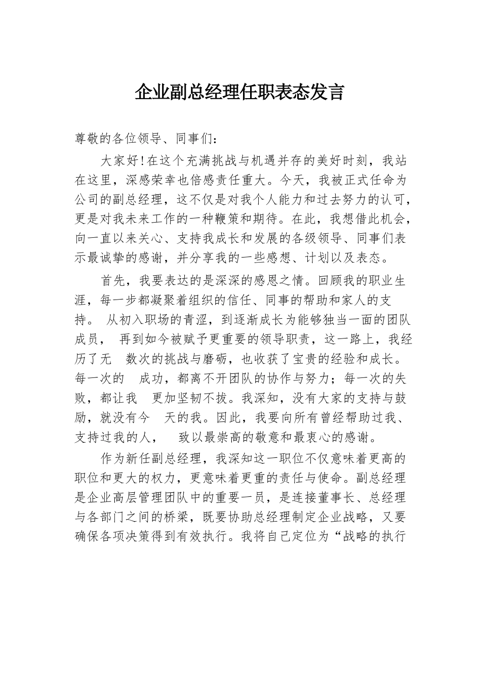 企业副总经理任职表态发言尊敬的各位领导、同事们:大家好!在这个充满挑战与机遇并存的美好时刻,我站在这里,深感荣幸也倍感责任重大。今天,我被正式任命为公司的副总经理,这不仅是对我个人能力和过去努力的认可,更是对我未来工作的一种鞭策和期待。在此,我想借此机会,向一直以来关心、支持我成长和发展的各级领导、同事们表示最诚挚的感谢,并分享我的一些感想、计划以及表态。首先,我要表达的是深深的感恩之情。回顾我的职业生涯,每一步都凝聚着组织的信任、同事的帮助和家人的支持。从初入职场的青涩,到逐渐成长为能够独当一面的团队成员,再到如今被赋予更重要的领导职责,这一路上,我经历了无数次的挑战与磨砺,也收获了宝贵的经验和成长。每一次的成功,都离不开团队的协作与努力;每一次的失败,都让我更加坚韧不拔。我深知,没有大家的支持与鼓励,就没有今天的我。因此,我要向所有曾经帮助过我、支持过我的人,致以最崇高的敬意和最衷心的感谢。作为新任副总经理,我深知这一职位不仅意味着更高的职位和更大的权力,更意味着更重的责任与使命。副总经理是企业高层管理团队中的重要一员,是连接董事长、总经理与各部门之间的桥梁,既要协助总经理制定企业战略,又要确保各项决策得到有效执行。我将自己定位为“战略的执行者、团队的协调者、创新的推动者”。我将全力以赴,确保企业战略目标的顺利实现,同时注重团队建设,激发团队潜能,营造积极向上、和谐共进的工作氛围。此外,我还将积极推动企业创新,不断探索新的业务模式和管理方法,以适应快速变化的市场环境。面对新的岗位,我已经做好了充分的准备,并制定了以下工作规划:1.深化学习,提升自我。我将继续加强学习,不断提升自己的专业素养和管理能力。加强学习,紧跟行业发展趋势,掌握先进的管理理念和技术手段。2.明确目标,细化策略。我将与总经理紧密合作,共同制定清晰的企业发展战略和目标,并细化分解为可操作的工作计划和任务分配。同时,建立有效的监控和评估机制,确保各项计划能够按时、按质、按量完成。3.强化团队,激发潜能。我将注重团队建设,通过培训、激励、沟通等方式,提升团队的整体素质和凝聚力。鼓励团队成员发挥各自的优势,敢于创新,勇于担当,共同为企业的发展贡献力量。4.优化流程,提升效率。我将推动企业内部流程的优化和再造,减少不必要的环节和浪费,提高工作效率和响应速度。同时,加强信息化建设,利用现代科技手段提升企业的管理水平和市场竞争力。5.注重文化,塑造品牌。我将积极参与企业文化的建设和传播,弘扬企业精神,塑造良好的企业形象和品牌形象。通过举办企业文化活动、加强与社会各界的交流与合作等方式,提升企业的知名度和美誉度。站在新的起点上,我深知前方的道路不会一帆风顺,但我将以全新的姿态、饱满的热情,迎接一切挑战和困难。我将始终保持谦虚谨慎的态度,虚心接受大家的意见和建议,不断改进自己的工作方法和作风。同时,我也将严格遵守企业的规章制度和职业道德规范,以身作则,廉洁奉公,为企业的发展贡献自己的力量。最后,我要说的是,企业的发展离不开每一位员工的共同努力和奉献。我相信,在大家的共同努力下,我们一定能够克服一切困难,实现企业的宏伟目标和愿景。让我们携手并进,共创辉煌!