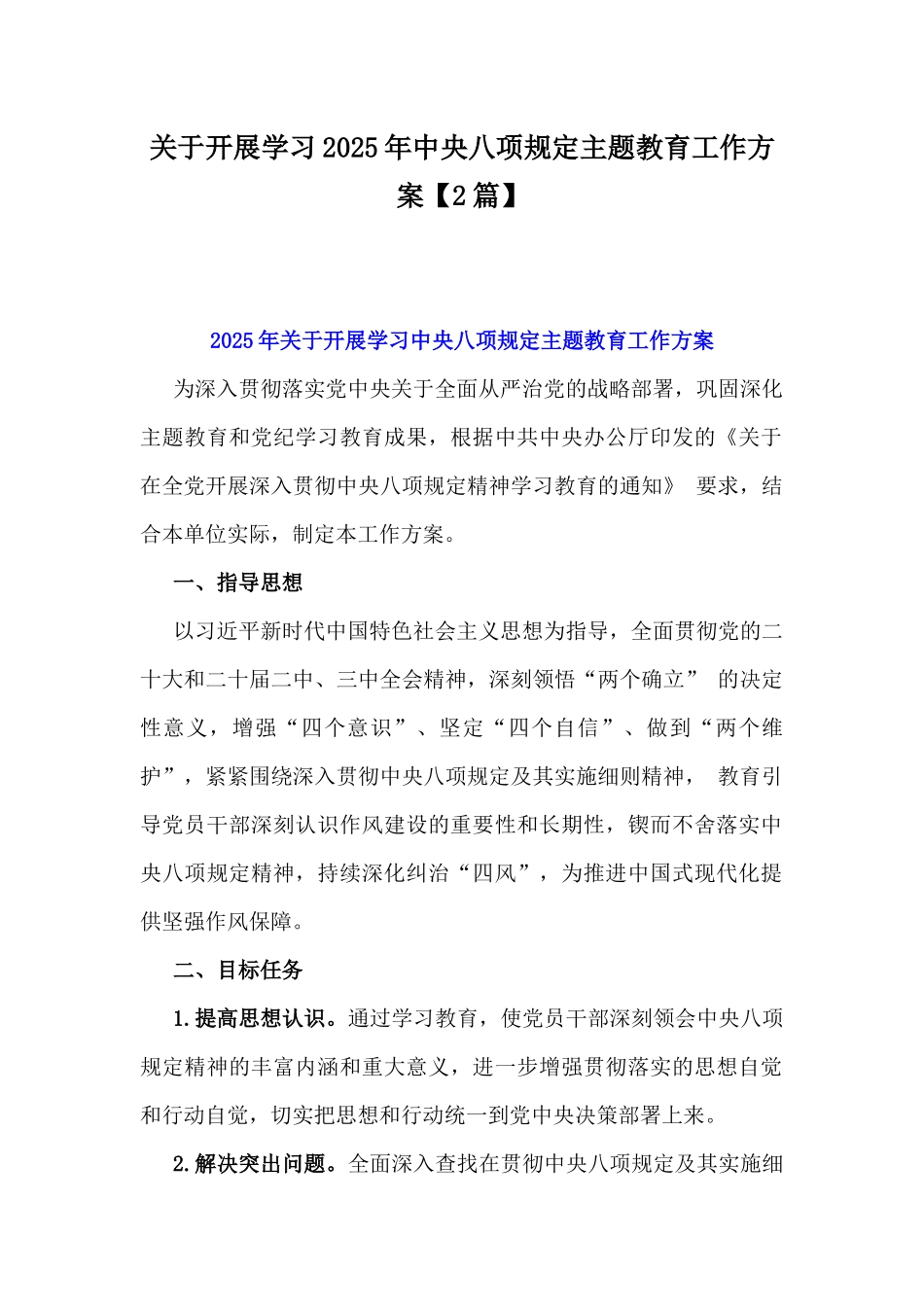 关于开展学习2025年xxx主题教育工作方案【2篇】2025年关于开展学习xxx主题教育工作方案为深入贯彻落实党中央关于全面从严治党的战略部署,巩固深化主题教育和党纪学习教育成果,根据中共中央办公厅印发的《关于在全党开展深入贯彻xxx精神学习教育的通知》要求,结合本单位实际,制定本工作方案。一、指导思想以习近平新时代中国特色社会主义思想为指导,全面贯彻党的二十大和二十届二中、三中全会精神,深刻领悟“两个确立”的决定性意义,增强“四个意识”、坚定“四个自信”、做到“两个维护”,紧紧围绕深入贯彻xxx及其实施细则精神,教育引导党员干部深刻认识作风建设的重要性和长期性,锲而不舍落实xxx精神,持续深化纠治“四风”,为推进中国式现代化提供坚强作风保障。二、目标任务1.提高思想认识。通过学习教育,使党员干部深刻领会xxx精神的丰富内涵和重大意义,进一步增强贯彻落实的思想自觉和行动自觉,切实把思想和行动统一到党中央决策部署上来。2.解决突出问题。全面深入查找在贯彻xxx及其实施细则精神方面存在的问题,特别是形式主义、官僚主义等“四风”问题,坚持即知即改、立行立改,切实解决群众反映强烈的突出问题,推动党风政风持续好转。3.完善制度机制。对现有相关制度规定进行全面梳理,结合实际情况,进一步修订完善,堵塞制度漏洞,强化制度执行,形成用制度管人、管事、管权的长效机制,确保xxx精神落地生根。4.促进工作发展。把学习教育与推动本单位中心工作紧密结合起来,以优良的作风促进工作落实,以工作成效检验学习教育成果,为完成全年目标任务提供有力支撑。三、学习教育对象全体党员干部。四、工作安排学习教育自2025年全国两会后开始,至7月结束,分为三个阶段进行。(一)学习动员阶段(2025年3月至X月)1.制定方案。结合本单位实际,研究制定深入贯彻xxx精神学习教育工作方案,明确目标任务、工作步骤和具体要求,确保学习教育有序开展。2.动员部署。召开动员大会,传达学习党中央关于开展深入贯彻xxx精神学习教育的有关要求,对本单位学习教育工作进行全面动员和部署,统一思想认识,明确工作任务。3.组织学习。组织党员干部深入学习习近平总书记关于加强党的作风建设的重要论述,学习xxx及其实施细则精神,学习党的十八大以来党中央关于作风建设的一系列重要文件和会议精神。采取集中学习、个人自学、专题研讨、专家辅导等多种形式,确保学习效果。同时,充分利用线上学习平台、微信公众号等载体,推送学习资料,方便党员干部随时学习。(二)对照检查阶段(2025年X月-X月)1.全面自查。党员干部对照xxx及其实施细则精神,对照形式主义、官僚主义等“四风”问题的具体表现,紧密结合自身思想和工作实际,深入查找存在的问题和不足,认真撰写自查报告,列出问题清单。2.征求意见。通过召开座谈会、发放征求意见表、设立意见箱、开展网上调查等方式,广泛征求服务对象、基层群众和社会各界对本单位及党员干部在作风建设方面的意见和建议。对征求到的意见建议进行认真梳理汇总,原汁原味反馈给党员干部。3.谈心谈话。领导班子成员之间、班子成员与分管部门负责人之间、部门负责人与普通党员干部之间要普遍开展谈心谈话,沟通思想、交换意见,相互提醒、共同提高。谈心谈话要坦诚相见,既谈自身存在的问题,也谈对方存在的问题,既谈工作问题,也谈思想问题,真正把问题谈开、把思想谈通。(三)整改落实阶段(2025年X月-7月底)1.制定整改措施。针对自查和征求意见中发现的问题,党员干部要认真制定整改措施,明确整改目标、整改时限和整改责任人,实行销号管理,确保问题整改到位。整改措施要具体实在、可操作性强,既要立足当前解决突出问题,又要着眼长远建立长效机制。2.集中整改。按照整改措施要求,集中时间、集中精力进行整改。对能够立即整改的问题,要立行立改,迅速见到成效;对需要一定时间整改的问题,要明确时间表和路线图,稳步推进整改;对需要长期坚持的问题,要建立健全长效机制,持续抓好整改。在整改过程中,要及时向...