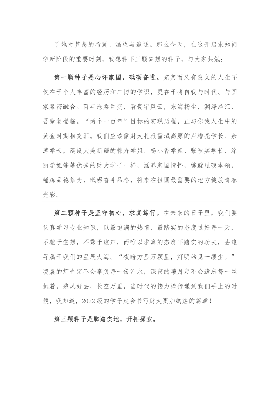 我想在财大种下三颗梦想的种子——在2022级新生座谈会上的发言尊敬的各位领导、各位老师,亲爱的同学们:大家好!我是来自工商管理学院的2022级新生*,今天非常荣幸能作为新生代表在这里发言!我与财大的故事,其实是从三年前开始的。2019年,我的姐姐考入了财大统计学专业,攻读硕士研究生。也正是这一年,我随姐姐报到,第一次来到了财大。那郁郁葱葱的弘毅山,繁花似锦的明湖、鉴湖,还有庄严耸立的图书馆,无一不彰显着财大是读书治学的理想园地。财大的一草一木、一砖一瓦都给我留下了深刻的印象。三年时光荏苒,今天我也通过自身的不懈努力,考入了我梦寐以求的学府——河南财经政法大学。三天前,我以2022级新生的身份,再入财大校园,时刻都有新的发现和感受:亲切的老师和热情的志愿者同学消解了初来乍到的紧张,便捷又好吃的食堂里确实有家乡的味道,图书馆、教室、湖畔的书声琅琅给了我无限的憧憬和向往……我满怀期待,迎着早秋的阳光行走在校园里,试图记住每一幢楼、每一条路,仿佛一个关于梦想、关于奋斗的未来画卷正徐徐展开。姐姐曾说过:财大是一个美好的地方,值得我们去憧憬,去探索,去留念。她在这里遇到了知识渊博又爱生如己的老师,也认识了很多志同道合的同学。财大,印证了她曾经的期盼、努力和坚持,更验证了她对梦想的希冀、渴望与追逐。那么今天,在这开启求知问学新阶段的重要时刻,我想种下三颗梦想的种子,与大家共勉:第一颗种子是心怀家国,砥砺奋进。充实而又有意义的人生不仅在于个人丰富的经历和广博的学识,更在于将自我与时代、与国家紧密融合。百年沧桑巨变,看寰宇风云,东海扬尘,渊渟泽汇,吾辈复登临。“两个一百年”目标的实现历程,正与你我人生中的黄金时期相交汇。我们应该像财大扎根雪域高原的卢增亮学长、余涛学长,建设大美新疆的韩卉学姐、杨小香学姐、张秋实学长、涂丽学姐等等优秀的财大学子一样,涵养家国情怀,练就过硬本领,锤炼品德修为,砥砺奋斗品格,将来在祖国最需要的地方绽放青春光彩。第二颗种子是坚守初心,求真笃行。在未来的日子里,我们要认真学习专业知识,以最饱满的热情、最踏实的态度过好每一天,不驰于空想,不骛于虚声,而唯以求真的态度下踏实的功夫,去追寻属于我们的星辰大海。“夜暗方显万颗星,灯明始见一缕尘。”凌晨的灯光定不会辜负每一份汗水,深夜的曦月定不会遗忘每一丝执着,乘风好去,长空万里,当时代的接力棒传递到我们手上的时候,我知道,2022级的学子定会书写财大更加绚烂的篇章!第三颗种子是脚踏实地,开拓探索。在财大,我们不但可以走进恢弘的图书馆,品味书香岁月,遨游学术海洋;我们也可以借助实验室平台与科研设备,将脑海中的灵机一动真刀真枪地转化为学术成果;我们还可以通过丰富多彩的校园文化活动,提升个人能力,努力成为德智体美劳全面发展的时代新人;我们更可以在寒暑假走进基层,通过形式多样的社会实践活动,努力把课堂上的学习成果转化为服务社会的实践行动。因此,从现在开始,我们一起期待,在财大收获更加多彩的生活,遇见更加优秀的自己。时代各不相同,青春一脉相承。亲爱的同学们,新的人生序幕已经拉开,让我们怀揣着自己的梦想,行胜于言、久久为功,铭记“博洽通达、弘毅致远”的校训,携手并肩,矢志奋斗。也请老师、同学们见证,未来的四年,我们将一起努力,为河南财经政法大学涂抹更加靓丽的色彩!