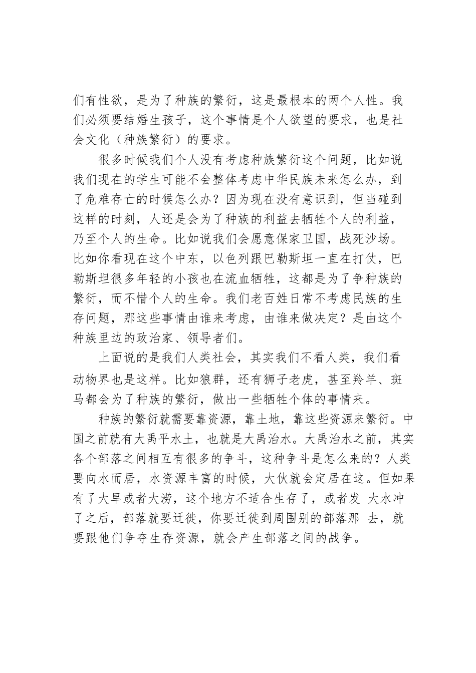 种族繁衍之争-中美贸易战的核心逻辑张可亮今天讲座我做的这个PPT比较简单,大家伙聊一聊,就是可能跟课本上讲的不一样。大家可能也感受到了,近几年这个世界发展变化的速度太快了,很多经济理论可能都落伍了。这个世界都在重构,经济理论其实也在重构,我不是经贸专业的,今天从我自己理解的一个角度跟大家伙聊一聊,可能用半个小时左右的时间介绍一下我的一些想法看法,剩下的时间大家有什么问题可以提一提。今天讲座的题目叫“从中美贸易战谈世界经济发展”。我手写的PPT,大家凑合看。第一张世界是和平的么?人类是友善的么?这是一个大问题。生活在国内这个环境,我们感觉不到战火,宣传都说这个世界总体是和平稳定的,人类是友善的,但是我简单找了几个数据,就是有人类历史记载以来,5560年,大的战争发生了14000多次,平均每年是2.6次;1740年到1974年,336次,每年1.6次;二战以后还有470多次,二战后其实就是离我们特别近的,但还有这么多的战争,死了一千多万人。这不是二战啊,二战死的人更多,就二战以后还死那么多人。界的主题,我们一直都这么讲,那人类是不是友善的?如果人类真的是友善的,为什么会有这么多的战争?为什么会通过战争死这么多人?这是一个大问题。第二张战争——为了种族繁衍那战争又是怎么来的?战争,这俩字怎么理解?从字面意思来理解就是以战斗来争夺。争夺什么?其实就是土地、资源、人口,这都是我自己想的,没去翻阅著作,没去找理论支撑,大伙觉得对的听听,觉得不对的,待会再反驳。我们学政治经济学也好,学西方经济理论也好,可能都没讲过。其实通过学习我们中国古代历史才能够理解,历史上发生过那么多的农民战争,还有跟匈奴的战争等等,这种战争争的大部分土地。土地是什么?土地是当时最主要的生产资料。在进入资本主义社会之前,土地是最重要的生产资料。只有争了土地,争了水资源,争了森林资源、矿产资源,这个种族才能继续繁衍生存。当然有的也会争人口,就是奴役人口,土地是财富之母,劳动是财富之父。个人的生死事小,但是民族的这个生存事大。怎么说呢,就是我们现在的个人当然是认为我们每个人的生命是价值最高的,但是就整个人类社会来讲,不论是上帝造人也好,或者说自然造人也好,实际上人类的基因密码里边是有一个对人性的设计,就是必须要保持种族的繁衍,种族的向下繁们有性欲,是为了种族的繁衍,这是最根本的两个人性。我们必须要结婚生孩子,这个事情是个人欲望的要求,也是社会文化(种族繁衍)的要求。很多时候我们个人没有考虑种族繁衍这个问题,比如说我们现在的学生可能不会整体考虑中华民族未来怎么办,到了危难存亡的时候怎么办?因为现在没有意识到,但当碰到这样的时刻,人还是会为了种族的利益去牺牲个人的利益,乃至个人的生命。比如说我们会愿意保家卫国,战死沙场。比如你看现在这个中东,以色列跟巴勒斯坦一直在打仗,巴勒斯坦很多年轻的小孩也在流血牺牲,这都是为了争种族的繁衍,而不惜个人的生命。我们老百姓日常不考虑民族的生存问题,那这些事情由谁来考虑,由谁来做决定?是由这个种族里边的政治家、领导者们。上面说的是我们人类社会,其实我们不看人类,我们看动物界也是这样。比如狼群,还有狮子老虎,甚至羚羊、斑马都会为了种族的繁衍,做出一些牺牲个体的事情来。种族的繁衍就需要靠资源,靠土地,靠这些资源来繁衍。中国之前就有大禹平水土,也就是大禹治水。大禹治水之前,其实各个部落之间相互有很多的争斗,这种争斗是怎么来的?人类要向水而居,水资源丰富的时候,大伙就会定居在这。但如果有了大旱或者大涝,这个地方不适合生存了,或者发大水冲了之后,部落就要迁徙,你要迁徙到周围别的部落那去,就要跟他们争夺生存资源,就会产生部落之间的战争。的生存繁衍所需要的这种自然条件。那为什么大禹治水以后可能就好了,他其实做了个平水土的事。一方面是建设水利工程,一方面大禹把各个种族联合起来,和平相处,让各个部落当你这有灾害的时候,就可以到别的部落去,大家一起来共享这些自然资源。这时候战争就少了,联合起来战争就少了。这是人类发展的一个阶段。第三张核平衡下...