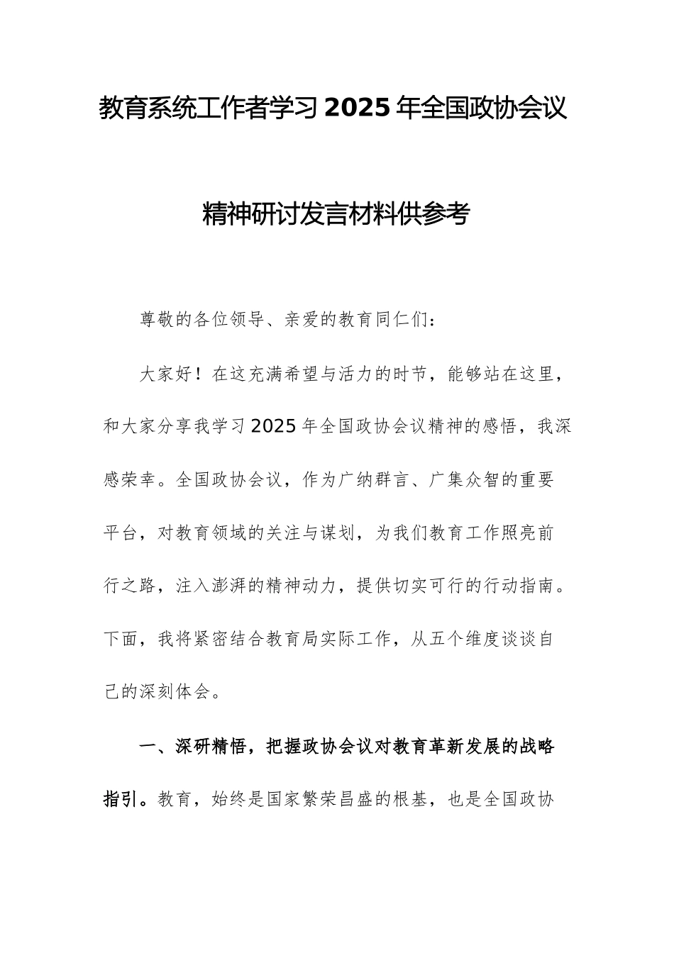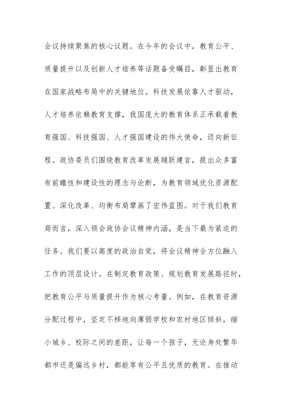 教育系统工作者学习2025年全国政协会议精神研讨发言材料供参考尊敬的各位领导、亲爱的教育同仁们:大家好!在这充满希望与活力的时节,能够站在这里,和大家分享我学习2025年全国政协会议精神的感悟,我深感荣幸。全国政协会议,作为广纳群言、广集众智的重要平台,对教育领域的关注与谋划,为我们教育工作照亮前行之路,注入澎湃的精神动力,提供切实可行的行动指南。下面,我将紧密结合教育局实际工作,从五个维度谈谈自己的深刻体会。一、深研精悟,把握政协会议对教育革新发展的战略指引。教育,始终是国家繁荣昌盛的根基,也是全国政协会议持续聚焦的核心议题。在今年的会议中,教育公平、质量提升以及创新人才培养等话题备受瞩目,彰显出教育在国家战略布局中的关键地位。科技发展依靠人才驱动,人才培养依赖教育支撑,我国庞大的教育体系正承载着教育强国、科技强国、人才强国建设的伟大使命,迈向新征程。政协委员们围绕教育改革发展踊跃建言,提出众多富有前瞻性和建设性的理念与论断,为教育领域优化资源配置、深化改革、均衡布局擘画了宏伟蓝图。对于我们教育局而言,深入领会政协会议精神内涵,是当下最为紧迫的任务。我们要以高度的政治自觉,将会议精神全方位融入工作的顶层设计。在制定教育政策、规划教育发展路径时,把教育公平与质量提升作为核心考量。例如,在教育资源分配过程中,坚定不移地向薄弱学校和农村地区倾斜,缩小城乡、校际之间的差距,让每一个孩子,无论身处繁华都市还是偏远乡村,都能享有公平且优质的教育。在推动教育创新方面,积极鼓励学校开展丰富多彩的教学实践活动,如项目式学习、探究性学习等,培养学生的创新思维和实践能力,为国家培育大批高素质创新人才,为教育强国建设筑牢人才根基。二、精准对标,锚定教育高质量发展的前行方向。对照政协会议中对教育高质量发展提出的明确要求,我们立足本地教育实际,科学谋划,确立了一系列切实可行的发展目标。在学前教育阶段,全力推进普及普惠工程,加大公办幼儿园建设力度,提高学前三年毛入园率,同时大力加强幼儿教师队伍建设,通过定期培训、技能竞赛等方式提升保教质量,让孩子们从人生的起点就沐浴在优质教育的阳光下。在义务教育阶段,聚焦优质均衡发展,持续推进学校标准化建设,优化师资配置,积极探索集团化办学、城乡学校共同体等模式,促进优质教育资源共享。比如,今年我们计划推动XX所城区优质学校与农村学校结对帮扶,开展常态化的教师交流、联合教学研讨等活动,将城区先进的教学理念和方法引入农村学校,切实提升农村学校的教育教学水平。高中教育要走特色多样化发展之路,鼓励学校深入挖掘自身优势,打造独具特色的课程体系和精品项目,满足学生个性化发展需求。与此同时,积极探索职普融通的有效途径,加强职业教育与普通教育的沟通与融合,为学生提供多元化的发展路径。在职业教育领域,紧密对接本地产业需求,动态调整专业设置,加强实训基地建设。我们计划与本地XX家龙头企业建立深度合作关系,共建XX个高标准实训基地,开展订单式人才培养,使职业教育培养的人才精准匹配市场需求,提高职业教育的针对性和实效性。为实现上述目标,我们精心制定了科学合理的教育发展规划和年度工作任务,从硬件设施升级、师资队伍锻造、课程体系优化等方面精准发力。加大教育投入力度,新建和改扩建一批现代化学校,配备先进的教学设备,为师生创造良好的教学环境;加强师资培训体系建设,通过线上线下相结合的方式,开展多层次、多形式的教师培训活动,如邀请教育专家讲学、组织教师赴名校交流学习等,全面提升教师专业素养;优化课程体系,严格按照国家课程标准开齐开足课程,同时鼓励学校结合自身特色和学生需求,开发丰富多彩的校本课程,如传统文化课程、科技创新课程等,丰富学生的学习体验。三、开拓创新,推动政协会议精神在教育领域落地生花。结合教育局职能,我们积极开拓创新工作方式方法,将政协会议精神转化为实实在在、行之有效的工作举措。在教育管理方面,大力探索数字化管理模式,构建功能完备的教育大数据平台,实现对学校教育教学、师资队伍建设、学生成长发展等情...