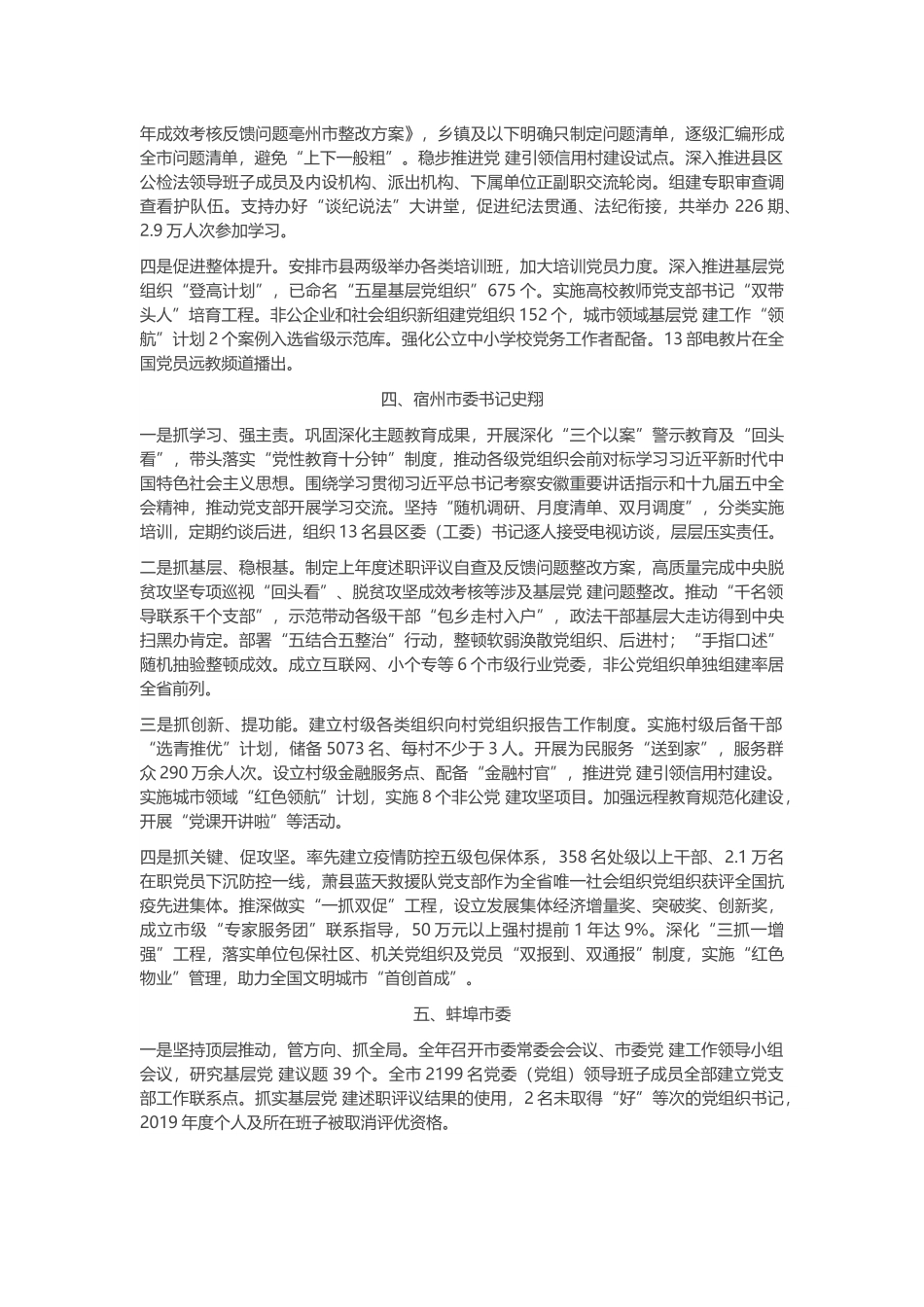 16个市委书记述职报告1月7日,安徽省委在合肥召开202x年度市委(工委)书记抓党的建设述职评议会议。会上,16个市市委书记就202x年度抓基层党建工作进行了述职。现作以选萃,供大家参考研习。一、省委常委、合肥市委书记虞爱华一是聚焦主责主业,扛起党建责任。常态化制度化开展大调研,深入城乡基层督查指导。推深做实党支部工作联系点制度,多次前往支部联系点离子医学中心党支部调研指导,推动844名县处级以上领导干部建立支部联系点。针对上年度有关反馈问题,建立“三个清单”,项目化推进问题整改。健全机关党建责任体系,中小学校党组织单独组建率达100%,落实国有企业党委研究讨论重大问题前置程序。严格落实党委(党组)书记抓基层党建工作述职评议考核办法,获“较好”等次的9位市属党委(党组)书记被取消综合考核评优资格。二是聚焦大战大考,发挥组织优势。面对突如其来的新冠疫情和百年不遇的严峻汛情,迅速动员各级党组织进入实战一线,成立一线临时党组织1028个,市县两级共12238名党员干部下沉社区值守,3821名市直机关干部参加抗洪抢险,为打赢疫情防控阻击战和巢湖保卫战作出贡献,涌现出施咏康、滨湖明珠社区党委等一批全国先进典型。加强保障激励各级党组织共划拨3295.6万元党费,用于慰问一线人员、支持灾后复建。市委累计表彰63名优秀共产党员、50个先进党组织。三是聚焦提质提效,抓实重点工作。不断深化农村基层党建“一抓双促”工程,出台9条意见激励村党组织带头人担当作为,《中国组织人事报》全文刊载我市做法并配发长篇评论向全国推介。从村“两委”正职定向考录公务员14人,着眼换届储备村干部人选2105人,集中整顿软弱涣散村党组织43个。持续推进城市基层党建“书记工程”,全面完成44个街道“大部门制”改革,指导城区使用下划编制招录街道公务员69名,7个社区获批省级示范,30个党组织入选省“领航计划”。扩大新兴领域“两个覆盖”,新设园区、楼宇、商圈、行业协会等党组织160个。全省城市基层党建工作推进会和全省园区非公党建工作现场会先后在我市召开。四是聚焦基层基础,强化保障支撑。做实“村党委—党支部—党小组—党员中心户”农村基层党建网络,完善城市“社区党委—网格党支部—楼院党小组”组织体系,持续推进党支部建设提升行动,先进党组织占比不断提升。排查解决农村发展党员违规违纪问题试点工作稳步推进,严把发展党员质量关,全年新发展党员6940名。开展基层党组织书记和普通党员集中轮训,完成社区工作者“四级十二档”岗位等级核定及薪酬兑现。大力发展壮大村级集体经济,全市50万元以上的村超额完成年度目标任务。二、淮北市委一是突出政治担当,把党建责任压实。坚持把政治建设摆在首要位置,依托开放式党校、“e学习”远教联播平台和“村书记大讲堂”,累计开展习近平新时代中国特色社会主义思想等宣传宣讲1200余场次,100余万名党员群众深受教育。坚持把抓好党建作为最大政绩,市委常委带头联系党支部,带动全市1103名领导干部建立支部联系点1312个,推动33项重点任务落地落实。坚持把破解难题作为重要抓手,创新推行“书记作业”模式,市—县—镇三级党组织书记领办基层党建创新项目44个,一批基层党建问题得到有力化解。二是突出抓主抓重,把基层基础建强。聚焦建好全国城市基层党建示范市,建立完善市、区、街道、社区“四级联动”体系,持续推动“一组一会”向城市延伸,建立670个社区网格党组织、583个居民议事会,《中国组织人事报》等专题刊发。全面推行街道体制改革,按照“6+N”模式调整街道内设机构,建立实体化综合执法中心,有效破解基层“看得见管不着”的难题。创新“领头羊”队伍建设,选派50名村、社区党组织书记赴浙江挂职,高质量承办全省集体经济扶持村党组织书记示范培训班。巩固党建引领信用村建设成果,为11个信用村7000多户授信2.4亿元,新华社《高管信息》等刊载报道。三是突出上下联动,把组织优势放大。积极推行领导干部、机关党组织和党员到社区“三报到”制度,引导全市4500多个基层党组织、9万余名党员全面参与疫情防控,400多个非公党组织捐款捐物4600余万元,央视新闻联播专题报道。创...