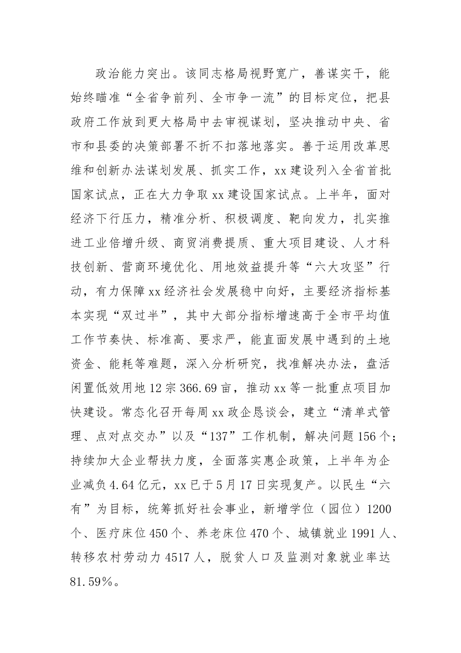 xx同志政治素质情况报告xx同志始终旗帜鲜明讲政治,有较强的政治鉴别力、政治领悟力和政治执行力,能够始终保持政治清醒、严守纪律规矩,提高政治站位谋大局、定措施、强落实,抓好班子、带好队伍、干好工作,确保各项事业沿着正确方向前进。政治立场坚定。该同志理想信念坚定,对党忠诚,在思想上、政治上、行动上始终同以习近平同志为核心的党中央保持高度一致,坚决捍卫“两个确立”、做到“两个维护”。能始终把学习放在首位,带头学习习近平总书记最新重要讲话、指示批示等精神,坚持落实县政府党组会议、常务会议第一议题学习和党组成员领学制度。时刻保持政治清醒和政治定力,坚决扛起政府系统意识形态“第一责任人”职责,定期召开县政府党组会议研究意识形态工作,严格按照要求对主要政府组成部门负责同志和乡镇开展政治谈话,果断高效处置苗头性、倾向性、敏感性问题,牢牢把握意识形态工作主动权。政治规矩意识强,时刻维护县委权威,如实向组织报告个人事项。政治能力突出。该同志格局视野宽广,善谋实干,能始终瞄准“全省争前列、全市争一流”的目标定位,把县政府工作放到更大格局中去审视谋划,坚决推动中央、省市和县委的决策部署不折不扣落地落实。善于运用改革思维和创新办法谋划发展、抓实工作,xx建设列入全省首批国家试点,正在大力争取xx建设国家试点。上半年,面对经济下行压力,精准分析、积极调度、靶向发力,扎实推进工业倍增升级、商贸消费提质、重大项目建设、人才科技创新、营商环境优化、用地效益提升等“六大攻坚”行动,有力保障xx经济社会发展稳中向好,主要经济指标基本实现“双过半”,其中大部分指标增速高于全市平均值工作节奏快、标准高、要求严,能直面发展中遇到的土地资金、能耗等难题,深入分析研究,找准解决办法,盘活闲置低效用地12宗366.69亩,推动xx等一批重点项目加快建设。常态化召开每周xx政企恳谈会,建立“清单式管理、点对点交办”以及“137”工作机制,解决问题156个;持续加大企业帮扶力度,全面落实惠企政策,上半年为企业减负4.64亿元,xx已于5月17日实现复产。以民生“六有”为目标,统筹抓好社会事业,新增学位(园位)1200个、医疗床位450个、养老床位470个、城镇就业1991人、转移农村劳动力4517人,脱贫人口及监测对象就业率达81.59%。政治担当过硬。该同志坚持以身作则、以上率下,认真履行“一岗双责”,始终做到“五个过硬”,严格落实新形势下党内政治生活的若干准则,严格执行“三会一课”、双重组织生活、谈心谈话、民主评议、述职述廉等制度。担当意识强烈,重大事项一线调度、靠前指挥,尤其是处理在长江经济带生态警示片披露问题整改、xx等事件当中,能够沉着冷静应对、科学统筹调度、高效妥善解决。工作作风扎实、勤勉务实,认真钻研政策、法律、法规等方面知识,对重点领域存在的短板弱项,经常深入基层一线调研,摸清基层真实情况,有针对性制定举措、靶向发力,及时破难点、通堵点,牢牢守住安全生产、生态环保、信访维稳等底线任务。政治自律严格。该同志严格遵守纪律规矩,时刻把法治思维和法治方式贯穿政府工作各领域、全过程,主持修订了县政府工作规则、督查督办、“三重一大”事项集体决策,以及相关部门、法律顾问、“五型”政府监督员固定列席县政府常务会等制度,严格履行决策程序;制定了财政专项资金监督管理办法和规范政府采购有关规定,严格项目招标、项目评审、资金拨付等相关环节,填堵漏洞筑牢防线。自我要求严格,坚持廉洁从政,处事公道正派对家属、下属和身边工作人员要求严格,尤其在家庭中积极涵养清廉家风,做到有规有矩、言传身教。对标上级要求和群众希望,还存在一些不足,主要是:一是理论学习还有待深化。对产业、金融等方面的专业知识钻研不够,学用结合上还有欠缺,运用新思想、新理论,指导解决县域经济发展中遇到的实际问题成效不明显。二是群众观念还有待强化。到基层深度调研还不经常,开展“解剖麻雀”式调研还有待深化。对于重要敏感的信访件和群众反映,能够做到第一时间交办并全程过问,但对一般的信访件的办理跟踪问效还有待加强。三是创新突破还有待提升。部...