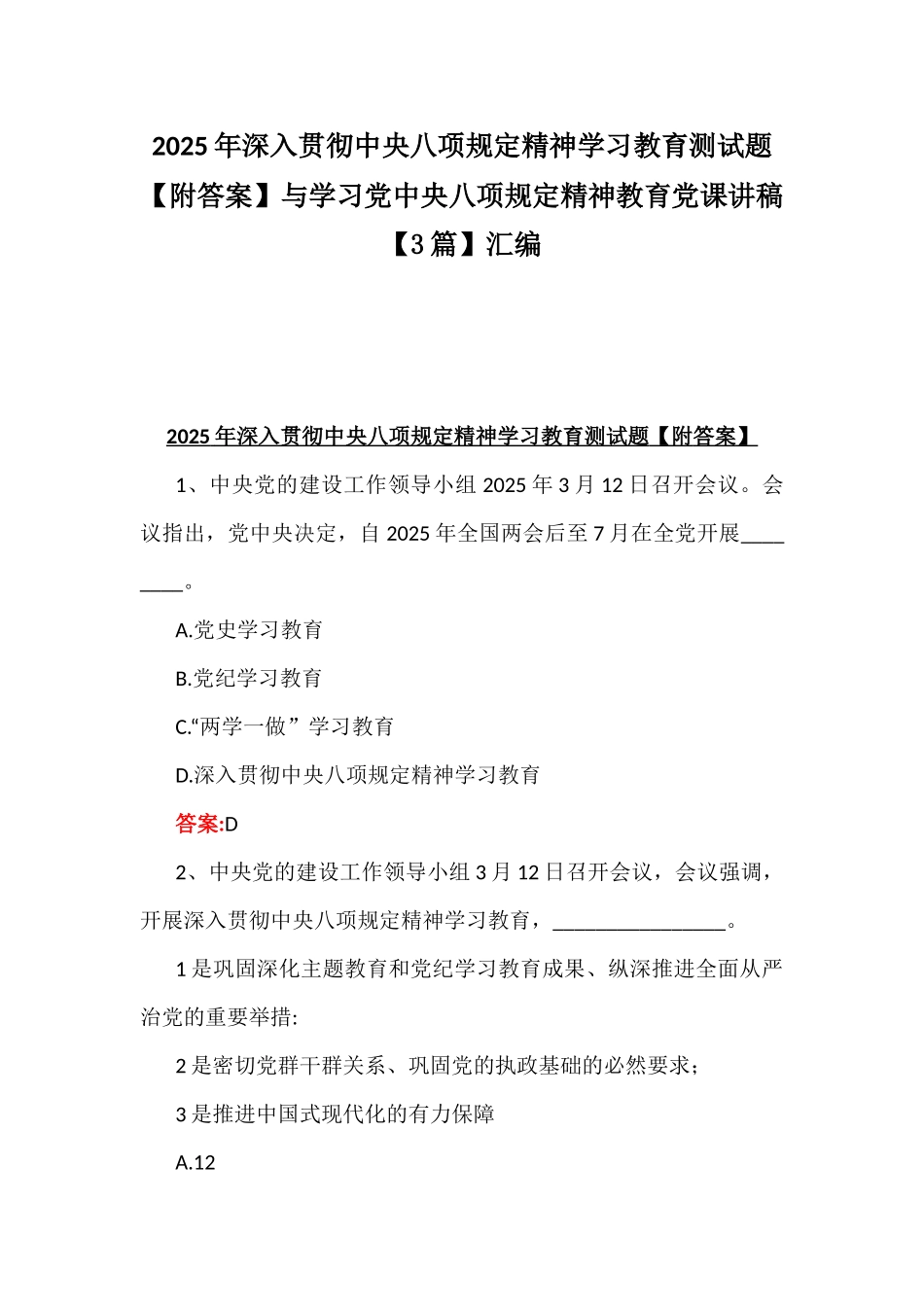 2025年深入贯彻xxx精神学习教育测试题【附答案】与学习党xxx精神教育党课讲稿【3篇】汇编2025年深入贯彻xxx精神学习教育测试题【附答案】1、中央党的建设工作领导小组2025年3月12日召开会议。会议指出,党中央决定,自2025年全国两会后至7月在全党开展________。A.党史学习教育B.党纪学习教育C.“两学一做”学习教育D.深入贯彻xxx精神学习教育答案:D2、中央党的建设工作领导小组3月12日召开会议,会议强调,开展深入贯彻xxx精神学习教育,________________。1是巩固深化主题教育和党纪学习教育成果、纵深推进全面从严治党的重要举措:2是密切党群干群关系、巩固党的执政基础的必然要求;3是推进中国式现代化的有力保障A.12B.13C.23D.123答案:D3、中央党的建设工作领导小组3月12日召开会议,学习贯彻习近平总书记关于深入贯彻________精神学习教育的重要讲话和重要指示精神,研究部署学习教育工作。A.xxxB.全面依法治国C.党的自我革命D.强化作风建设答案:A4、党中央决定,自2025年________至________月在全党开展深入贯彻xxx精神学习教育。习近平总书记高度重视,亲自谋划确定学习教育主题,发表重要讲话,作出重要指示,为开展学习教育指明了方向。A.全国两会前、7B.全国两会后、7C.七一前、12D.七一后、7答案:B5、中央党的建设工作领导小组3月12日召开会议,研究部署学习教育工作。会议指出,会议指出要聚焦主题,注重实效,一体推进________深入学习习近平总书记关于________的重要论述和xxx及其实施细则精神,系统总结党的十八大以来深入贯彻xxx精神的成效和经验,全面深入查找贯彻xxx及其实施细则精神方面存在的问题,A.三不腐、加强党的作风建设B.学查改、加强党的思想建设C.学查改、加强党的作风建设D.三不腐、加强党的纪律建设答案:C6、中央党的建设工作领导小组3月12日召开会议,研究部署学习教育工作。会议指出,结合实际加强________,扎实推进________,有针对性完善相关制度规定。A.警示教育、集中整治B.思想教育、集中整治C.警示教育、分层整治D.思想教育、个别整治答案:A7、中央党的建设工作领导小组3月12日召开会议,研究部署学习教育工作。会议强调,________要对学习教育负总责,既带头搞好自身学习教育,又切实打起________。A.各级政府、主体责任B.各级党委(党组)、主体责任C.各级党委(党组)、监督责任D.各级政府、监督责任答案:B8、中央党的建设工作领导小组3月12日召开会议,研究部署学习教育工作。会议强调,坚持________,推动问题的解决。突出抓好________学习教育。A.精准指导、新提拔干部、年轻干部、关键岗位干部B.精准指导、中青年干部C.分类指导、新提拔干部、年轻干部、关键岗位干部D.分类指导、中青年干部答案:C9、中央党的建设工作领导小组3月12日召开会议,研究部署学习教育工作。会议强调,充分发挥________党组(党委)对本行业本系统学习教育的指导作用。要力戒形式主义,坚决摒弃应付思想、过关心态,坚决防止“两张皮”,注重________,推动学习教育有序有效开展。A.上级管理部门、督导检查B.上级管理部门、宣传引导C.行业系统主管部门、督导检查D.行业系统主管部门、宣传引导答案:D10、中央总书记习近平2012年12月4日召开中共中央政治局会议,会议审议关于的________有关规定。A、改进文风、密切联系群众B、改进会风、党员干部直接联系群众C、改进工作作风、密切联系群众D、改进工作作风、党员干部直接联系群众正确答案:C11、制定改进工作作风、密切联系群众的八项规定,指导思想就是________,体现从严治党。A、加强党风建设B、以人为本C、执政为民D、从严要求正确答案:D12、要改进________,切忌走过场、搞形式主义;要轻车简从,减少陪同,简化接待。A、工作作风B、调查研究C、会风D、文风正确答案:A13、要下决心改进作风,切实解决________问题,始终保持同人民群众的血肉联系。A、社会突出B、群众反映强烈C、群众困难D、干部作风漂浮正确答案:B14、下列哪种行为不属于违反xxx精神的行为?()A、违规公款吃喝B、违规发放津补贴C、正...