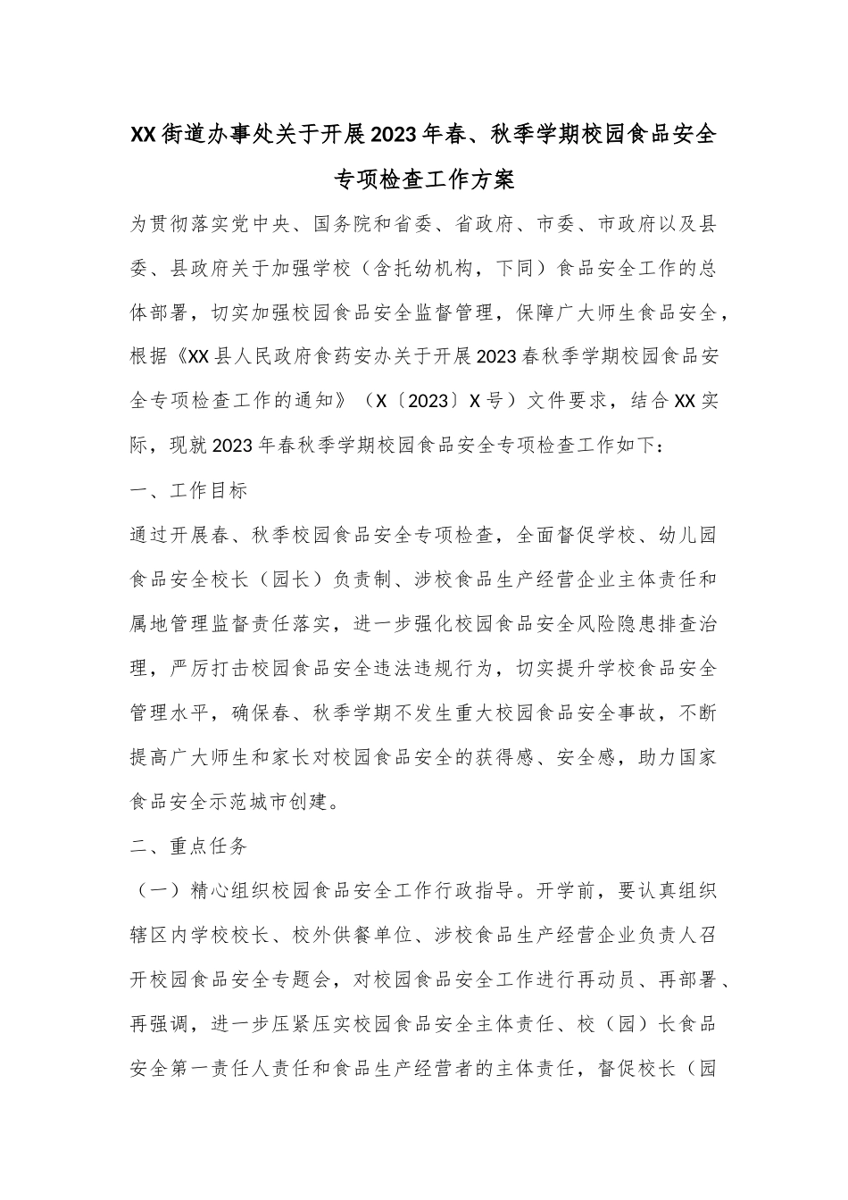 XX街道办事处关于开展2023年春、秋季学期校园食品安全专项检查工作方案为贯彻落实党中央、国务院和省委、省政府、市委、市政府以及县委、县政府关于加强学校(含托幼机构,下同)食品安全工作的总体部署,切实加强校园食品安全监督管理,保障广大师生食品安全,根据《XX县人民政府食药安办关于开展2023春秋季学期校园食品安全专项检查工作的通知》(X〔2023〕X号)文件要求,结合XX实际,现就2023年春秋季学期校园食品安全专项检查工作如下:一、工作目标通过开展春、秋季校园食品安全专项检查,全面督促学校、幼儿园食品安全校长(园长)负责制、涉校食品生产经营企业主体责任和属地管理监督责任落实,进一步强化校园食品安全风险隐患排查治理,严厉打击校园食品安全违法违规行为,切实提升学校食品安全管理水平,确保春、秋季学期不发生重大校园食品安全事故,不断提高广大师生和家长对校园食品安全的获得感、安全感,助力国家食品安全示范城市创建。二、重点任务(一)精心组织校园食品安全工作行政指导。开学前,要认真组织辖区内学校校长、校外供餐单位、涉校食品生产经营企业负责人召开校园食品安全专题会,对校园食品安全工作进行再动员、再部署、再强调,进一步压紧压实校园食品安全主体责任、校(园)长食品安全第一责任人责任和食品生产经营者的主体责任,督促校长(园长)切实重视并亲自研究、部署、检查校园食品安全工作,结合实际配备食品安全总监、食品安全员,严格落实食品安全“日管控、周排查、月调度”要求,不断完善并抓好校园食品安全管理制度落实。督促辖区学校、涉校集中配餐企业、涉校食品生产经营企业全面排查治理食品安全风险隐患,持续推进学校食堂、涉校集中配餐企业“互联网+明厨亮灶”升级改造工作,并及时将食堂及后厨监控数据接入市级、省级平台,实现校园食品安全“互联网+明厨亮灶”数据在省级平台汇聚、智能分析,提升校园食品安全监管效能,切实保障校园食品安全。重点解决校园食品安全主体责任、校(园)长食品安全第一责任人责任、食品生产经营者的主体责任不落实,食品安全管理制度落实不到位等问题。(责任单位:经济发展办公室、市场监管局XX分局、食安办、各学校包保责任人、各学校食品安全总监、学校所在地各村(社区))(二)全面开展食品安全风险隐患自查。开学前,要督促指导辖区学校、涉校集中配餐企业深入开展食品安全风险隐患自查,对库存食品、食品添加剂进行认真清理,对加工场所、设施设备、餐饮具等进行彻底清洁消毒和维护等,对自查中发现的食品安全隐患和问题,及时采取有效措施进行整改,并向当地教育、市场监管部门提交自查报告。重点解决学校食堂、校外供餐单位食品安全自查不到位、走过场,整改不落实等问题,防止开学后因使用过期食品、食品添加剂及腐败变质食品等引发安全事故。(责任单位:经济发展办公室、市场监管局XX分局、食安办、各学校包保责任人、各学校食品安全总监、学校所在地各村(社区))(三)开展校园食品安全全覆盖监督检查。以学校(幼儿园)食堂、涉校集中配餐企业、涉校食品生产经营企业、农村边远地区学校食堂、校园周边食品经营户及食品流动摊贩为重点,进一步深化“守底线、查隐患、保安全”专项行动,按照《餐饮服务监督检查要点表》《食品生产监督检查要点表》《食品销售监督检查要点表》确定的检查内容,对辖区学校食堂、校内小卖部、校外供餐单位等进行全要素、全覆盖监督检查。按照“四个最严”指示要求,严肃查处各类违法违规行为,对违反《食品安全法实施条例》第75条的行为坚决处罚到个人,对涉嫌犯罪的,依法移送司法机关追究刑事责任。重点解决无证经营、餐饮具清洗消毒不规范、索证索票、进货查验记录等制度不落实,加工场所卫生差及使用过期、腐败变质、感官性状异常食品等违法违规行为。(责任单位:市场监管局XX分局、食安办、XX综合执法中队、XX派出所、学校所在地各村(社区))(四)切实加强校园食品安全关键环节管控。督促指导学校严格落实集中用餐陪餐、食品安全每周自查制度,及时整改陪餐、自查中发现的食品风险隐患和问题;督促指导学校、校外供餐单位严格落实《省...