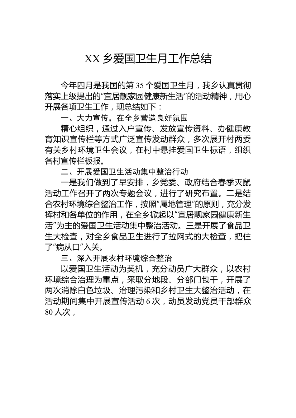 XX乡爱国卫生月工作总结今年四月是我国的第35个爱国卫生月,我乡认真贯彻落实上级提出的“宜居靓家园健康新生活”的活动精神,用心开展各项卫生工作,现总结如下:一、大力宣传,在全乡营造良好氛围精心组织,通过入户宣传、发放宣传资料、办健康教育知识宣传栏等方式广泛宣传发动群众,多次展开村两委有关乡村环境卫生会议,在村中悬挂爱国卫生标语,组织各村宣传栏板报。二、开展爱国卫生活动集中整治行动一是我们做到了早安排,乡党委、政府结合春季灭鼠活动工作召开了两次专题会议,进行了研究布置。二是结合农村环境综合整治工作,按照“属地管理”的原则,充分发挥村和各单位的作用,在全乡掀起以“宜居靓家园健康新生活”为主的爱国卫生活动集中整治活动。三是开展了食品卫生大检查,对全乡食品卫生进行了拉网式的大检查,把住了“病从口”入关。三、深入开展农村环境综合整治以爱国卫生活动为契机,充分动员广大群众,以农村环境综合治理为重点,采取分地段、分部门包干,开展了两次消除白色垃圾、治理污染和乡村卫生大整治活动,在活动期间集中开展宣传活动6次,动员发动党员干部群众80人次,集中清整活动2次,清理脏乱死角XX万处,清除垃圾堆物XX万吨、病媒生物孳生地XX万处。加大了整治管理力度,对交通、卫生、市场秩序进行进一步整治,通过整治,我乡环境质量、卫生质量进一步明显提高。在农村重点治理垃圾乱倒、粪土乱堆、污水乱泼、柴草乱堆、杂物乱摆的“五乱”现象,铲除病原体孳生场所,改变了村民居住环境,有力保护了广大人民群众的身心健康,促进了我乡爱卫工作持续健康发展。