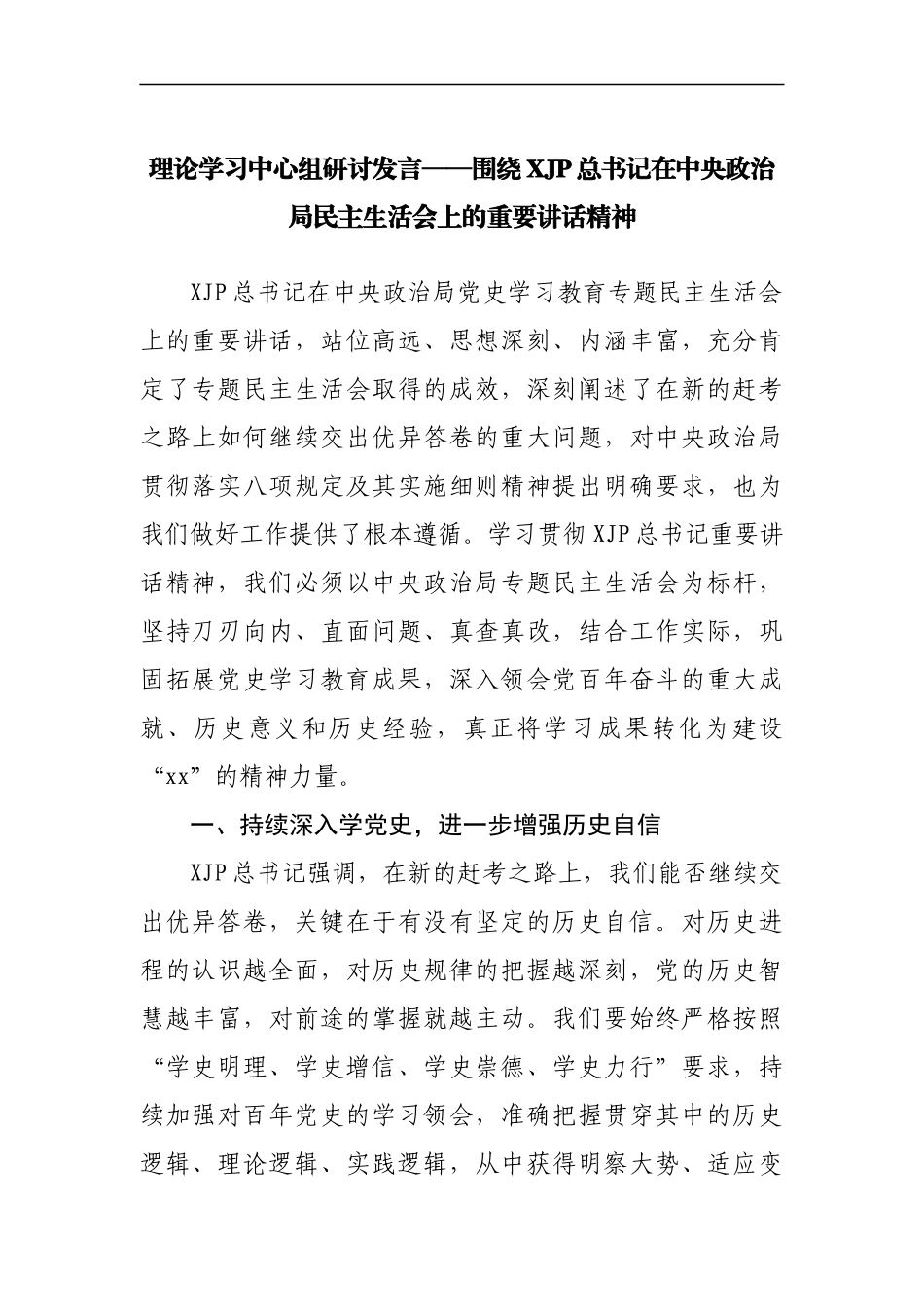 理论学习中心组研讨发言——围绕XJP总书记在中央政治局民主生活会上的重要讲话精神XJP总书记在中央政治局党史学习教育专题民主生活会上的重要讲话,站位高远、思想深刻、内涵丰富,充分肯定了专题民主生活会取得的成效,深刻阐述了在新的赶考之路上如何继续交出优异答卷的重大问题,对中央政治局贯彻落实八项规定及其实施细则精神提出明确要求,也为我们做好工作提供了根本遵循。学习贯彻XJP总书记重要讲话精神,我们必须以中央政治局专题民主生活会为标杆,坚持刀刃向内、直面问题、真查真改,结合工作实际,巩固拓展党史学习教育成果,深入领会党百年奋斗的重大成就、历史意义和历史经验,真正将学习成果转化为建设“xx”的精神力量。一、持续深入学党史,进一步增强历史自信XJP总书记强调,在新的赶考之路上,我们能否继续交出优异答卷,关键在于有没有坚定的历史自信。对历史进程的认识越全面,对历史规律的把握越深刻,党的历史智慧越丰富,对前途的掌握就越主动。我们要始终严格按照“学史明理、学史增信、学史崇德、学史力行”要求,持续加强对百年党史的学习领会,准确把握贯穿其中的历史逻辑、理论逻辑、实践逻辑,从中获得明察大势、适应变局的指路明灯,奋斗不止、精进不怠的动力源泉,坚定走好高质量发展新征程;要以党史学习教育专题民主生活会为契机,全面剖析党史学习教育中存在的问题和不足,全力抓好整改,推动理论学习往深里走、往实里走、往心里走。同时,要加强对广大干部群众的教育培训,健全面向基层、面向群众的理论普及工作体系,办好学校思想政治理论课,推动马克思主义中国化最新成果走进千家万户,让广大党员、干部和全体人民特别是广大青年坚定历史自信、筑牢历史记忆满怀信心地向前进。二、知行合一办实事,进一步站稳人民立场XJP总书记强调,我们党来自人民、植根人民、服务人民。我们党的百年历史,就是一部践行党的初心使命的历史,就是一部党与人民心连心、同呼吸、共命运的历史。从“大革命时期”号召人民一起“打倒列强、除军阀”,到土地革命时期的“打土豪、分田地”,再到抗日战争初期的“停止内战、www.gongwentang.com网整理一致对外”,以及解放战争后期的“打倒蒋介石、解放全中国”,这些口号都体现了依靠人民、为了人民的思想,都代表着人民的根本利益。我们要深入贯彻落实党的群众路线,始终坚持一切为了人民、一切依靠人民,改进和创新联系群众方法,不断密切党同人民群众的血肉联系更好倾听群众呼声、回应群众关切;要围绕发展大局、突出重点群体、聚焦民生领域,探索建立“我为群众办实事”长效机制,全力解决群众反映集中的共性需求和普遍性问题,不断提升为群众办实事的质量水平。同时,要针对农村人居环境整治、医疗卫生、城市基础设施建设、教育体育等群众最关心、最直接、最现实的利益问题,积极谋划一批民生工程,提升群众生活质量,让改革发展成果更多更公平惠及全县人民。三、与时俱进开新局,进一步提升能力水平XJP总书记指出,新的时代条件下,我们要总结运用好党积累的伟大斗争经验,坚持底线思维,增强忧患意识,发扬斗争精神,掌握斗争策略,练就斗争本领,保持越是艰险越向前的大无畏气概。在中国革命、建设、改革的各个时期,共产党人不畏艰险、不懈奋斗,为建立、捍卫、建设新中国英勇牺牲,为改革开放和社会主义现代化建设英勇献身,为民族独立和人民解放顽强奋斗,书写了可歌可泣的光辉事迹。我们要深刻把握我们党在内忧外患中诞生、在历经磨难中成长、在攻坚克难中壮大所锤炼出的风骨和品质,不惧风险、敢于斗争,有效应对重大挑战、抵御重大风险、克服重大阻力、解决重大矛盾,在闯关夺隘中不断夺取新的胜利。这就需要各级领导干部深刻领会学习党的十九届X中X会精神、中央经济工作会议精神,以及XJP总书记在专题民主生活会上的重要讲话精神,结合省市各级部署,按照县委十一届二次全会安排,进一步细化举措、主动担当、全面履责,营造全县上下合力攻坚、干事创业氛围,强力推进我县经济社会发展各项重点工作。党的历史是党、国家和民族的宝贵精神财富。我们要深入学习党史,准确把握党史内涵,不断从党史中汲...