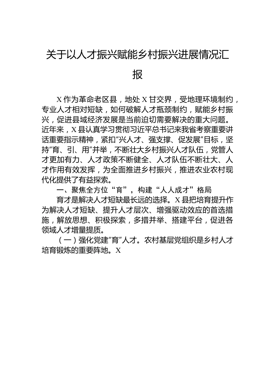 关于以人才振兴赋能乡村振兴进展情况汇报X作为革命老区县,地处X甘交界,受地理环境制约,专业人才相对短缺,如何破解人才瓶颈制约,赋能乡村振兴,促进县域经济发展是当前迫切需要解决的重大问题。近年来,X县认真学习贯彻习近平总书记来我省考察重要讲话重要指示精神,紧扣“兴人才、强支撑、促发展”目标,坚持“育、引、用”并举,不断壮大乡村振兴人才队伍,党管人才更加有力、人才政策不断健全、人才队伍不断壮大、人才作用有效发挥,为全面推进乡村振兴,推进农业农村现代化提供了有益探索。一、聚焦全方位“育”,构建“人人成才”格局育才是解决人才短缺最长远的选择。X县把培育提升作为解决人才短缺、提升人才层次、增强驱动效应的首选措施,解放思想、积极探索,多措并举、搭建平台,促进各领域人才增量提质。(一)强化党建“育”人才。农村基层党组织是乡村人才培育锻炼的重要阵地。X县发挥“马栏·党旗红”党建品牌效应,突出思想铸魂,持续实施“头雁竞飞”工程,以“把党员培养成骨干、把能人发展成党员”为抓手,坚持选育结合全面提升。一方面培养选拔有干劲、能干事、作风硬、效率高的农村党员充实进了村两委班子、基层网格员队伍,凝聚起共襄乡村振兴的“雁阵效应”;另一方面建立健全以“镇(办)包村领导—驻村队伍—村干部—村民小组长(中心户长、乡贤能人)”为主体的四级网格员工作体系,对全县X名网格员实行了层级管理,开展定期培训、业务考核,落实评优树模、表彰奖励,有力推动了乡村振兴一线队伍的建设规范化、管理标准化。(二)依托平台“育”人才。X县坚持大教育理念,以培育促提升,推动农村各类人才提素质、升层级。充分运用县委党校、县职教中心、农村党员干部远程教育终端站点县公共实训基地等平台,深入实施创新型企业家、乡村振兴人才、高技能人才、青年拔尖人才等培育工程,通过专业型培训,各类人才创新能力和业务水平不断提升。利用“云上智农”APP开展高素质农民技术培训,群众作业技能快速提升。搭建了咸阳市首家多功能创客空间—“三水古豳人创客沙龙”,开展创业论坛活动X场、创业实训观摩X场、跟踪创业指导X人次,放大了人才培训的“蒲公英效应”。依托县公共实训基地开展高质量职业技能培训,利用“线上+线下”培训模式,培训创业、保洁、中药材种植、果园管理、保育、电工、直播营销、木工等方面X人,通过技能评价和技能鉴定认定中级工X人、高级工X人、技师X人,培育了一大批职业农民。(三)用活资源“育”人才。作为省内X所高校和X个单位定点联系帮扶重点县,X县持续深化“校地合作”,与西北农林科技大学合作,实施“苹果园提质增效关键技术研究与示范”项目,邀请知名专家教授对农村实用技术人才现场进行集中培训,助力果业高质量发展。协调邀请省市专家举办“土专家”“田秀才”培训班,促进“土专家”理论水平和实践技能“双提升”。累计举办“土专家”培训X场次,培训土专家X人次,通过土专家培训果农X余场次、X.X万人。抢抓旬泰扶贫协作机遇,举办“旬泰”贫困村创业致富带头人培训班X期,培育创业致富带头人X人,辐射带动半数以上行政村。充分发挥德高望重、号召力强的“五老”作用,在农村探索推行“四会一帮带”活动机制,建立“书吧”X个、农户“小书角”X个,开展“家庭式”课业辅导X人次,既让“五老”老有所为,也有效解决了“留守儿童”家庭教育问题。(四)聚焦产业“育”人才。以主导产业苹果种植为依托,充分发挥乡土人才作用,坚持在产业一线育人才,让人才在产业一线更好地发挥作用。采取“政府购买服务”方式,组建X名“土专家”队伍,扎根乡村、直面农户,通过田间会诊、开展延伸培训、提供“田保姆”式服务等途径,指导群众提升作物产量;坚持“服务基层、送学上门”原则,采取“政治理论集中辅导、科技知识实物演示、实用技术现场示范”的方式,全面加强果农果园管理技术实操培训。截至目前共组织线上直播授课X场次,线下培训X期。同时,大力推广“互联网+创业技能提升”和“X县地摊经济从业人员创业技能提升”培训,催生个体经济迅猛发展。二、聚焦高质量“引”,构筑“聚才引智”高地引才是解决人...