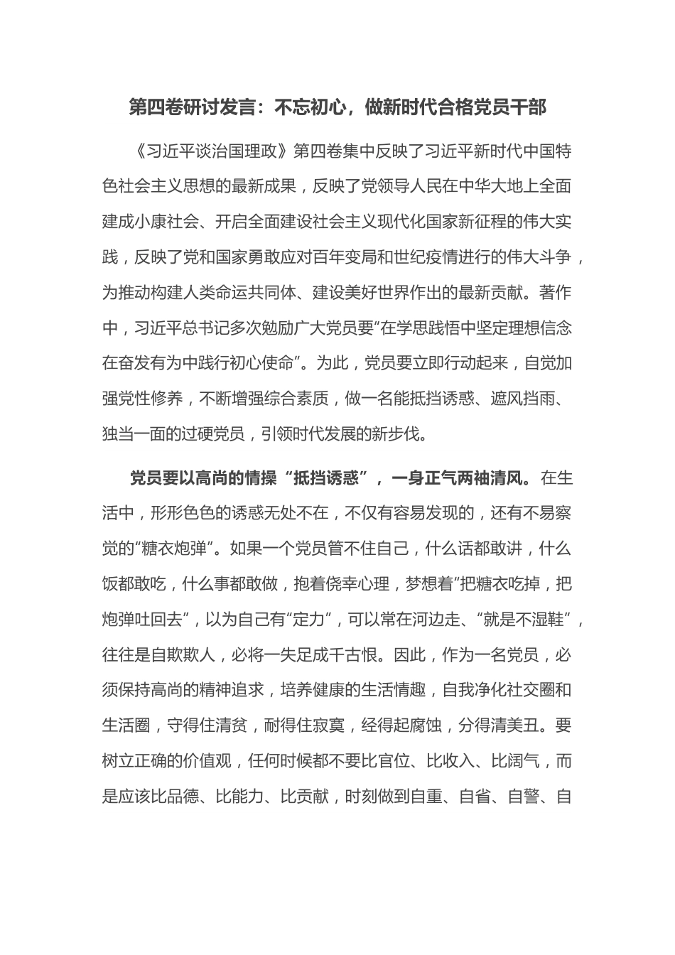 第四卷研讨发言:不忘初心,做新时代合格党员干部《习近平谈治国理政》第四卷集中反映了习近平新时代中国特色社会主义思想的最新成果,反映了党领导人民在中华大地上全面建成小康社会、开启全面建设社会主义现代化国家新征程的伟大实践,反映了党和国家勇敢应对百年变局和世纪疫情进行的伟大斗争,为推动构建人类命运共同体、建设美好世界作出的最新贡献。著作中,习近平总书记多次勉励广大党员要“在学思践悟中坚定理想信念在奋发有为中践行初心使命”。为此,党员要立即行动起来,自觉加强党性修养,不断增强综合素质,做一名能抵挡诱惑、遮风挡雨、独当一面的过硬党员,引领时代发展的新步伐。党员要以高尚的情操“抵挡诱惑”,一身正气两袖清风。在生活中,形形色色的诱惑无处不在,不仅有容易发现的,还有不易察觉的“糖衣炮弹”。如果一个党员管不住自己,什么话都敢讲,什么饭都敢吃,什么事都敢做,抱着侥幸心理,梦想着“把糖衣吃掉,把炮弹吐回去”,以为自己有“定力”,可以常在河边走、“就是不湿鞋”,往往是自欺欺人,必将一失足成千古恨。因此,作为一名党员,必须保持高尚的精神追求,培养健康的生活情趣,自我净化社交圈和生活圈,守得住清贫,耐得住寂寞,经得起腐蚀,分得清美丑。要树立正确的价值观,任何时候都不要比官位、比收入、比阔气,而是应该比品德、比能力、比贡献,时刻做到自重、自省、自警、自励,干干净净做事、清清白白做人,自觉抵挡住各种诱惑,做到“拒腐蚀、永不沾”,一身正气两袖清风。党员要以强烈的担当“遮风挡雨”,一心为民服务群众。作为一名党员,要善于从雨伞中悟出道理来。如果党员不能为群众遮风挡雨,群众凭什么把你高高举过头顶?党员就是一块砖,哪里需要哪里搬。在战争年代,党员是在枪林弹雨中掩护群众生命的;在危难关头,党员是冲在前面保护群众安全的;在平常时期,党员是站在前列维护群众利益的。如果一个党员遇到困难就退避三舍,面对责任就躲躲闪闪,看到危险就畏手畏脚,见到好处就争先恐后,这样的党员,损害的是党的形象,是党员队伍中的懦夫,是注定会被群众抛弃的。因此,党员必须挺起胸膛,以坚实的肩膀勇挑重担,以宽广的胸怀心系群众,时刻想群众所想、急群众所急、忧群众所忧,始终同人民想在一起、干在一起,始终与群众心连心、心贴心,勇敢面对前进道路上的风吹浪打和艰难险阻,为群众遮风挡雨,为民撑起一片天。党员要以过硬的素质“独当一面”,一腔热血奋发有为。没有金刚钻,揽不了瓷器活;没有过硬的能力素质,独当一面就无处谈起。因此,党员要深入学习习近平新时代中国特色社会主义思想,增强“四个意识”、坚定“四个自信”、做到“两个维护”,时刻在政治上、思想上、行动上同以习近平同志为核心的党中央保持高度一致,在学思践悟中进一步坚定理想信念。要树立“无功便是过、平庸就是错”的意识,坚决摒弃“干与不干一个样、干好干坏一个样”的错误思想,要强化工作作风,主动作为、实干托底,创新工作思路,改进工作方法,强化服务意识,提高服务水平。要提升专业素质,务求业务精湛,在重要工作推进、重大项目实施、重点工程建设中,勇于冲锋在前,敢于啃“硬骨头”,善于打“歼灭战”,在奋发有为中践行共产党员的初心使命。