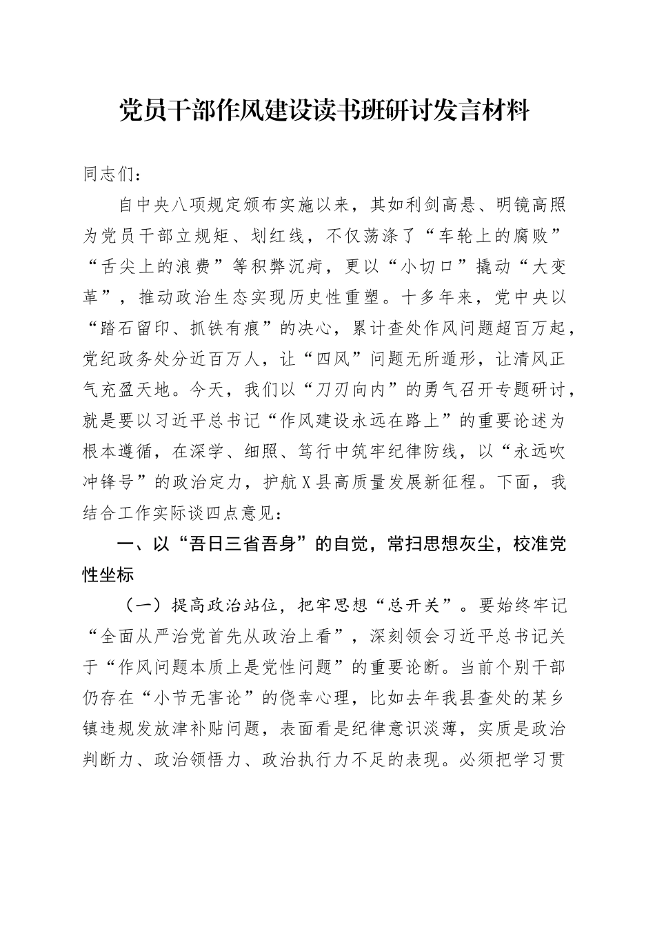 党员干部作风建设读书班研讨发言材料同志们:自中央八项规定颁布实施以来,其如利剑高悬、明镜高照为党员干部立规矩、划红线,不仅荡涤了“车轮上的腐败”“舌尖上的浪费”等积弊沉疴,更以“小切口”撬动“大变革”,推动政治生态实现历史性重塑。十多年来,党中央以“踏石留印、抓铁有痕”的决心,累计查处作风问题超百万起,党纪政务处分近百万人,让“四风”问题无所遁形,让清风正气充盈天地。今天,我们以“刀刃向内”的勇气召开专题研讨,就是要以习近平总书记“作风建设永远在路上”的重要论述为根本遵循,在深学、细照、笃行中筑牢纪律防线,以“永远吹冲锋号”的政治定力,护航X县高质量发展新征程。下面,我结合工作实际谈四点意见:一、以“吾日三省吾身”的自觉,常扫思想灰尘,校准党性坐标(一)提高政治站位,把牢思想“总开关”。要始终牢记“全面从严治党首先从政治上看”,深刻领会习近平总书记关于“作风问题本质上是党性问题”的重要论断。当前个别干部仍存在“小节无害论”的侥幸心理,比如去年我县查处的某乡镇违规发放津补贴问题,表面看是纪律意识淡薄,实质是政治判断力、政治领悟力、政治执行力不足的表现。必须把学习贯彻习近平新时代中国特色社会主义思想作为首要政治任务,以理论清醒确保政治坚定。(二)强化理论武装,筑牢信仰“压舱石”。坚持“第一议题”抓学习、“第一遵循”抓贯彻、“第一政治要件”抓落实,建立“党委中心组领学+支部专题研学+党员干部自学”三级联动机制。重点抓好“三会一课”质量提升工程,开展“纪律规矩大家谈”微党课竞赛,组织党员干部到廉政教育基地开展沉浸式教学,推动《中国共产党纪律处分条例》等党规党纪入脑入心。(三)深化自我革命,拧紧作风“螺丝扣”。严格执行新形势下党内政治生活的若干准则,建立“党性体检”常态化机制。近期将组织开展“四查四看”专项行动:查政治忠诚,看是否存在“七个有之”;查宗旨意识,看是否存在脱离群众倾向;查担当作为,看是否存在“躺平式”现象;查廉洁自律,看是否存在“微腐败”隐患。对苗头性问题及时约谈提醒,做到抓早抓小、防微杜渐。二、以“一篙不可放缓”的韧劲,紧盯顽瘴痼疾,深化标本兼治(一)持续纠治享乐奢靡之风。聚焦违规吃喝转入“私人会所”、电子礼品卡等隐形变异问题,开展“天网2024”专项整治。建立“公务消费智能监管平台”,实现公务用车、公务接待全流程电子留痕。今年将推动“三公”经费在去年压缩12%基础上再降5%,对超预算单位实行“一票否决”。(二)靶向整治形式主义官僚主义。坚决落实中央为基层减负25条措施,建立“红黄蓝”三色督办机制。重点整治“指尖上的形式主义”,清理冗余政务APP至15个以内;规范督查检查考核事项,实行“双随机、一公开”联合检查;改进调查研究,明确县领导下基层调研每年不少于60天,现场解决问题比例不低于70%。(三)坚决惩治群众身边腐败。开展乡村振兴领域不正之风专项治理,紧盯农村集体“三资”管理、征地拆迁、惠民补贴等关键领域。今年计划对全县278个行政村开展提级监督,建立“小微权力”清单45项,推行村级事务“阳光票决制”,让“微权力”在阳光下运行。三、以“咬定青山不放松”的定力,健全长效机制,扎紧制度笼子(一)完善责任传导机制。深化“四责协同”机制,制定全面从严治党主体责任清单3.0版。建立“书记点题、纪委破题、部门答题”工作机制,实施“履责纪实”APP线上留痕管理,对连续两个季度考核排名末位的党组织负责人进行诫勉谈话。(二)创新监督制约机制。推进纪检监察监督与审计监督、财会监督、统计监督贯通协同,打造“智慧监督”大数据平台。在工程招投标领域推行“黑名单”制度,对37家供应商实施联合惩戒;在行政审批领域建立“好差评”实时反馈系统,差评整改率达到100%。(三)建立正向激励机制。出台《容错纠错实施办法(试行)》,明确12种容错情形。开展“清风干部”评选,对连续三年获评者优先提拔使用。设立干部关心关爱基金,建立受处分干部“暖心回访”制度,让“跌倒”干部重新站起来、干起来。四、以“打铁还须自身硬”的担当,锻造过硬队伍,永葆...