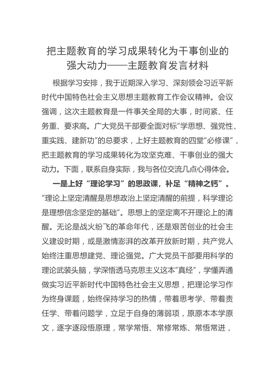 把主题教育的学习成果转化为干事创业的强大动力——主题教育发言材料根据学习安排,我于近期深入学习、深刻领会习近平新时代中国特色社会主义思想主题教育工作会议精神。会议强调,这次主题教育是一件事关全局的大事,时间紧、任务重、要求高。广大党员干部要全面对标“学思想、强党性、重实践、建新功”的总要求,上好主题教育的四堂“必修课”,把主题教育的学习成果转化为攻坚克难、干事创业的强大动力。下面,联系自身实际,我与各位交流几点心得体会。一是上好“理论学习”的思政课,补足“精神之钙”。“理论上坚定清醒是思想政治上坚定清醒的前提,科学理论是理想信念坚定的基础”。思想上的坚定离不开理论上的清醒。无论是战火纷飞的革命年代,还是艰苦创业的社会主义建设时期,或是激情澎湃的改革开放新时期,共产党人始终注重思想建党、理论强党。广大党员干部要用科学的理论武装头脑,学深悟透马克思主义这本“真经”,学懂弄通做实习近平新时代中国特色社会主义思想,把理论学习作为终身课题,始终保持学习的热情,带着思考学、带着责任学、带着问题学,立足于自身的薄弱项,原原本本学原文,逐字逐段悟原理,常学常悟、常修常炼、常悟常进,在理论滋养中补足精神之钙、铸牢思想之魂,练就“金刚不坏之身”。二是上好“党性修养”的基础课,筑牢“信仰之堤”。党性是党员干部立身、立业、立言、立德的基石。党性修养,既是永恒的主题,又是常抓常新的课题。翻开百年党史,不难发现中国共产党人的党性原则贯穿始终、熠熠生辉。广大党员干部要加强党性锻炼,提升党性教育,自觉用习近平新时代中国特色社会主义思想改造主观世界,时刻叩问“我是谁、为了谁、依靠谁”“入党为什么、在党干什么、为党做什么”,牢牢守住政治关、权力关、交往关、生活关、亲情关,知敬畏、存戒惧、守底线,始终保持“心不动于微利之诱,目不眩于五色之惑”的政治定力。牢记自己的身份,摆正自己的位置,一心一意听党话,矢志不渝跟党走,以“不畏浮云遮望眼”的坚定,在“乱云飞渡”中披荆斩棘、劈波斩浪,永葆对党忠诚的政治本色。三是上好“知行合一”的实践课,增强“干事之能”。“知是基础、是前提,行是重点、是关键”。学习的落脚点在于“致用”,以知促行,以行促知,知行合一,将理论与实践统一起来,指导实践,推动工作。只有主动投身一线在“大风大浪”中接受检验、经受磨炼,才能破解知行脱节的突出问题,真正实现“学以致用”。广大党员干部要坚持问题导向,深入调查研究,沉下身子,迈开步子,带着问题去找到原因回,带着课题去、形成思路回,用心用情用力解决好人民群众急难愁盼的问题。主动应对各种困难和挑战敢啃“硬骨头”、敢涉“深水区”、敢接“烫山芋”,不做“好好先生”、不当“甩手掌柜”,把责任扛在肩上,把困难摆在面前,知难而进、迎难而上,“逢山开路,遇水搭桥”,在经风雨、见世面中壮筋骨、增才干。四是上好“守正创新”的提升课,笃行“担当之志”。“我们从事的是前无古人的伟大事业,守正才能不迷失方向、不犯颠覆性错误,创新才能把握时代、引领时代。”守正创新,既是辩证法,更是方法论。广大党员干部要把握好“建新功”的要求,传承精华、创新发展,坚持变中求新、变中求进、变中突破,在求真务实中开拓创新、在大胆探索中实现担当,以“敢为天下先”的昂扬斗志和“任尔东西南北风”的磐石信念,争做习近平新时代中国特色社会主义思想的“践行者”和“领跑者”。把个人理想和人生价值融入到强国建设和民族复兴的共同理想中,务实功、出实招、求实效,真抓实干、埋头苦干,以时不我待的紧迫感和舍我其谁的使命感,一步一个脚印,一锤一个铆钉,奋力走好新时代的赶考路。以“真严实”推动主题教育“三步走”——主题教育发言材料近日,学习贯彻习近平新时代中国特色社会主义思想主题教育工作会议在北京召开。习近平总书记出席会议并强调,要牢牢把握“学思想、强党性、重实践、建新功”的总要求。坚持学思用贯通、知信行统一,努力在以学铸魂、以学增智、以学正风、以学促干方面取得实实在在的成效,真抓实干、务求实效,聚焦问题、知难而进,以时时...