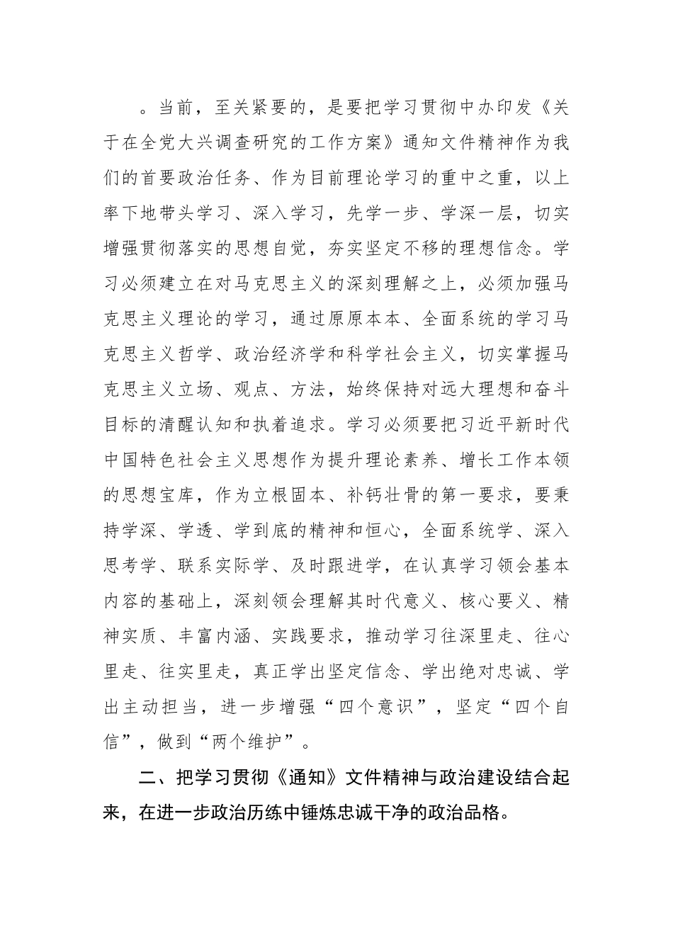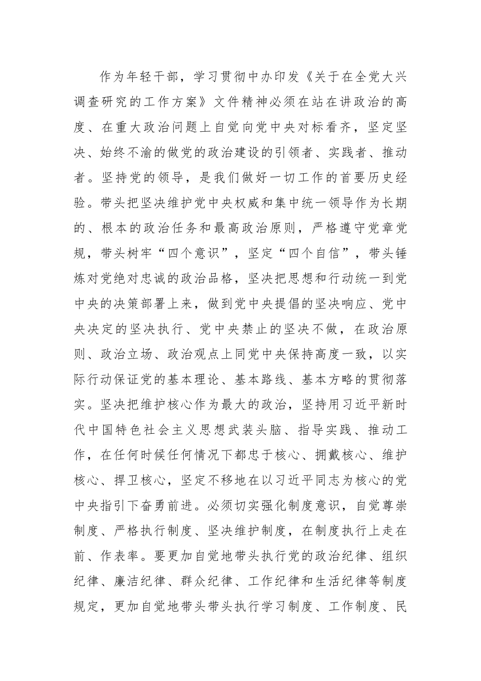 学习《关于在全党大兴调查研究的工作方案》心得体会:奔赴基层一线以实际行动大兴调查研究之风习近平总书记深刻指出“调查研究是谋事之基、成事之道”,多次强调“要在全党大兴调查研究之风”。近期我通过深入学习中办印发《关于在全党大兴调查研究的工作方案》文件精神。年轻干部作为党和国家事业发展的“生力军”,要积极响应党中央号召,勇于担当作为,奔赴基层一线,真正以实际行动大兴调查研究之风,持续强化调查研究基本功。一、把学习贯彻《通知》文件精神与理论武装结合起来,在进一步思想淬炼中夯实坚定不移的理想信念。当前,至关紧要的,是要把学习贯彻中办印发《关于在全党大兴调查研究的工作方案》通知文件精神作为我们的首要政治任务、作为目前理论学习的重中之重,以上率下地带头学习、深入学习,先学一步、学深一层,切实增强贯彻落实的思想自觉,夯实坚定不移的理想信念。学习必须建立在对马克思主义的深刻理解之上,必须加强马克思主义理论的学习,通过原原本本、全面系统的学习马克思主义哲学、政治经济学和科学社会主义,切实掌握马克思主义立场、观点、方法,始终保持对远大理想和奋斗目标的清醒认知和执着追求。学习必须要把习近平新时代中国特色社会主义思想作为提升理论素养、增长工作本领的思想宝库,作为立根固本、补钙壮骨的第一要求,要秉持学深、学透、学到底的精神和恒心,全面系统学、深入思考学、联系实际学、及时跟进学,在认真学习领会基本内容的基础上,深刻领会理解其时代意义、核心要义、精神实质、丰富内涵、实践要求,推动学习往深里走、往心里走、往实里走,真正学出坚定信念、学出绝对忠诚、学出主动担当,进一步增强“四个意识”,坚定“四个自信”,做到“两个维护”。二、把学习贯彻《通知》文件精神与政治建设结合起来,在进一步政治历练中锤炼忠诚干净的政治品格。作为年轻干部,学习贯彻中办印发《关于在全党大兴调查研究的工作方案》文件精神必须在站在讲政治的高度、在重大政治问题上自觉向党中央对标看齐,坚定坚决、始终不渝的做党的政治建设的引领者、实践者、推动者。坚持党的领导,是我们做好一切工作的首要历史经验。带头把坚决维护党中央权威和集中统一领导作为长期的、根本的政治任务和最高政治原则,严格遵守党章党规,带头树牢“四个意识”,坚定“四个自信”,带头锤炼对党绝对忠诚的政治品格,坚决把思想和行动统一到党中央的决策部署上来,做到党中央提倡的坚决响应、党中央决定的坚决执行、党中央禁止的坚决不做,在政治原则、政治立场、政治观点上同党中央保持高度一致,以实际行动保证党的基本理论、基本路线、基本方略的贯彻落实。坚决把维护核心作为最大的政治,坚持用习近平新时代中国特色社会主义思想武装头脑、指导实践、推动工作,在任何时候任何情况下都忠于核心、拥戴核心、维护核心、捍卫核心,坚定不移地在以习近平同志为核心的党中央指引下奋勇前进。必须切实强化制度意识,自觉尊崇制度、严格执行制度、坚决维护制度,在制度执行上走在前、作表率。要更加自觉地带头执行党的政治纪律、组织纪律、廉洁纪律、群众纪律、工作纪律和生活纪律等制度规定,更加自觉地带头带头执行学习制度、工作制度、民主集中制、党内生活准则、“三重一大”集体决策、重大事项请示报告、批评和自我批评、“三会一课”、民主生活会、组织生活会、谈心谈话等制度,以严格的制度落实,锤炼忠诚干净的政治品格,推动全面从严治党向纵深发展,推动各项工作沿着正确的政治方向贯彻落实。三、把学习贯彻《通知》文件精神与当前工作结合起来,在进一步实践锻炼中强化贯彻落实的使命担当。学习贯彻中办印发《关于在全党大兴调查研究的工作方案》文件精神,我们必须深入学习贯彻习近平总书记关于调查研究的重要论述精神,清醒认识到正确的决策离不开调查研究,正确的贯彻落实同样也离不开调查研究;调查研究是获得真知灼见的源头活水,是做好工作的基本功。作为年轻干部要坚持以党性立身做事,把说老实话、办老实事、做老实人作为调查研究的重要内容,要善于独立思考,坚持求真务实,要在全党大兴调查研究之风。在工作实际中,只有...