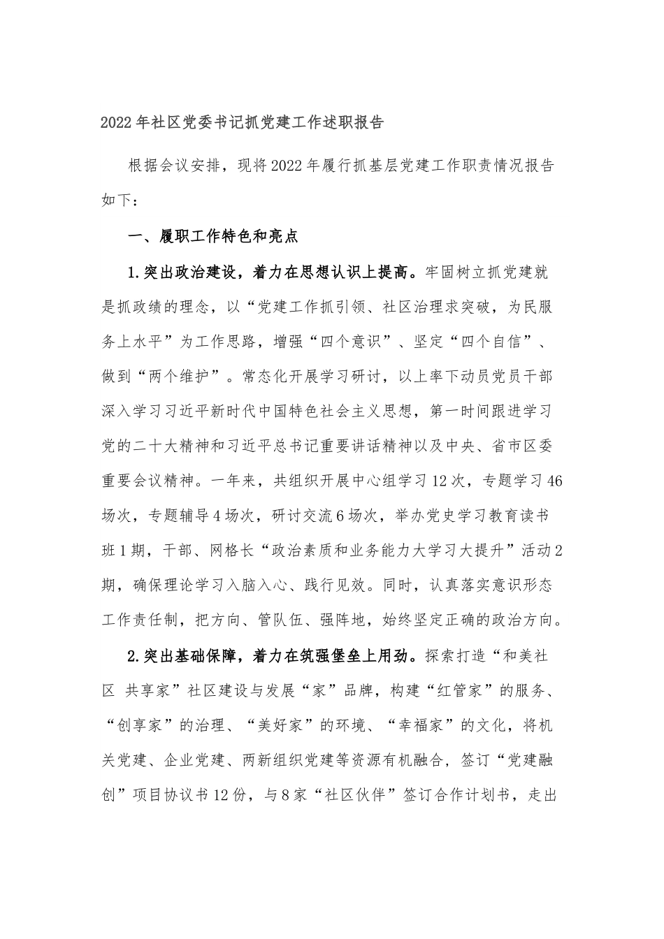 2022年社区党委书记抓党建工作述职报告根据会议安排,现将2022年履行抓基层党建工作职责情况报告如下:一、履职工作特色和亮点1.突出政治建设,着力在思想认识上提高。牢固树立抓党建就是抓政绩的理念,以“党建工作抓引领、社区治理求突破,为民服务上水平”为工作思路,增强“四个意识”、坚定“四个自信”、做到“两个维护”。常态化开展学习研讨,以上率下动员党员干部深入学习习近平新时代中国特色社会主义思想,第一时间跟进学习党的二十大精神和习近平总书记重要讲话精神以及中央、省市区委重要会议精神。一年来,共组织开展中心组学习12次,专题学习46场次,专题辅导4场次,研讨交流6场次,举办党史学习教育读书班1期,干部、网格长“政治素质和业务能力大学习大提升”活动2期,确保理论学习入脑入心、践行见效。同时,认真落实意识形态工作责任制,把方向、管队伍、强阵地,始终坚定正确的政治方向。2.突出基础保障,着力在筑强堡垒上用劲。探索打造“和美社区共享家”社区建设与发展“家”品牌,构建“红管家”的服务、“创享家”的治理、“美好家”的环境、“幸福家”的文化,将机关党建、企业党建、两新组织党建等资源有机融合,签订“党建融创”项目协议书12份,与8家“社区伙伴”签订合作计划书,走出了一条撬动社会力量、社会组织参与社区建设与发展的新路子。争取投入资金30余万元,打造社区社会治理创享中心、社会治安综合治理中心,创建省级综合减灾示范社区、市级人防工作站、“红石榴家园”等场所阵地,完成社区便民服务大厅升级改造。充分利用现有阵地资源,广泛开展以宣传党的政策、学习科学理论、培育主流价值、丰富文化生活等为内容的居民精神文明提升行动,坚持唱响主旋律,弘扬正能量。3.突出功能发挥,着力在工作重点上聚焦。推行“红管家”服务体系建设,常态化开展党员关爱345行动、困难群众帮扶五个到位、未成年人成长六大保护、老年人照料五大服务、企业商户开展三送服务,让居民群众拥有更强幸福感和更多获得感。组建党员管家、网格长管家、物业管家、红石榴管家等网格服务力量,帮扶服务居民群众200多人次。利用党员主导的“红色物业”服务行动,搭建网格党支部、业委会、物业公司“红色铁三角”议事平台,解决群众下水堵塞、太阳能漏水、家中老人小孩无人照看、小区车辆停放难等烦心事30多件。组织动员200余名志愿者参与疫情防控,“六个起来”硬核机制扎实织密疫情防控防护网。纵深推进“片区长制”,定期开展“清污消土”行动、各类专项整治48次,协调化解国泰家园小区物业矛盾纠纷问题,整治辖区3个城市空地乱堆乱倒问题,昔日“垃圾场”变为居民休闲娱乐“后花园”。4.突出融创共享,着力在社会治理上创新。推进社会治理“一核多元、融创共享”体系建设,构建“社区党委+网格党支部+楼栋党小组”三级组织链条,常态化开展民情速递、走访关爱、政策宣传等服务,建立“微服务”治理机制,实施“网格书记工作室”“红色物业”“蒋大姐志愿队”“伙伴联盟”等网格微服务品牌。围绕解决社会治理的堵点痛点难点,用实“一书三单”,通过“大党委”委员作用发挥,解决涉及群众期盼的实事45件、社区发展难题3个,服务党员、居民900余人次,使辖区单位、居民群众在思想上认同社区、在工作上支持社区、在力量上配合社区,实现党建工作共享共建共融发展。二、存在的主要问题及原因主要问题:一是党建工作创品牌意识有待加强。在抓党建、强基础上做了不少工作,探索了一些行之有效的方法,但做的多,总结得不够,在品牌的锻造、宣传和延伸上还有欠缺;二是抓党建统筹力度不够。作为社区党委书记,在有效整合各类服务资源上缺乏有效的举措和办法,在党建工作抓常抓细上用力不均衡,安排部署的多,跟踪落实的少;三是谋划创新能力不强。对社区党建工作深入思考谋划还不够,在挖掘党建特色亮点上还不充分,发挥社区统筹作用、形成城市大治理模式还缺乏强有力的工作抓手。存在问题原因分析:一是思想认识不够到位。党建工作统筹平衡发展观念还不强,树立城市党建“一盘棋”和“大党建”的理念,以基层党建带动基层治理创新理解把握的还不够透彻;二是调查研究...
