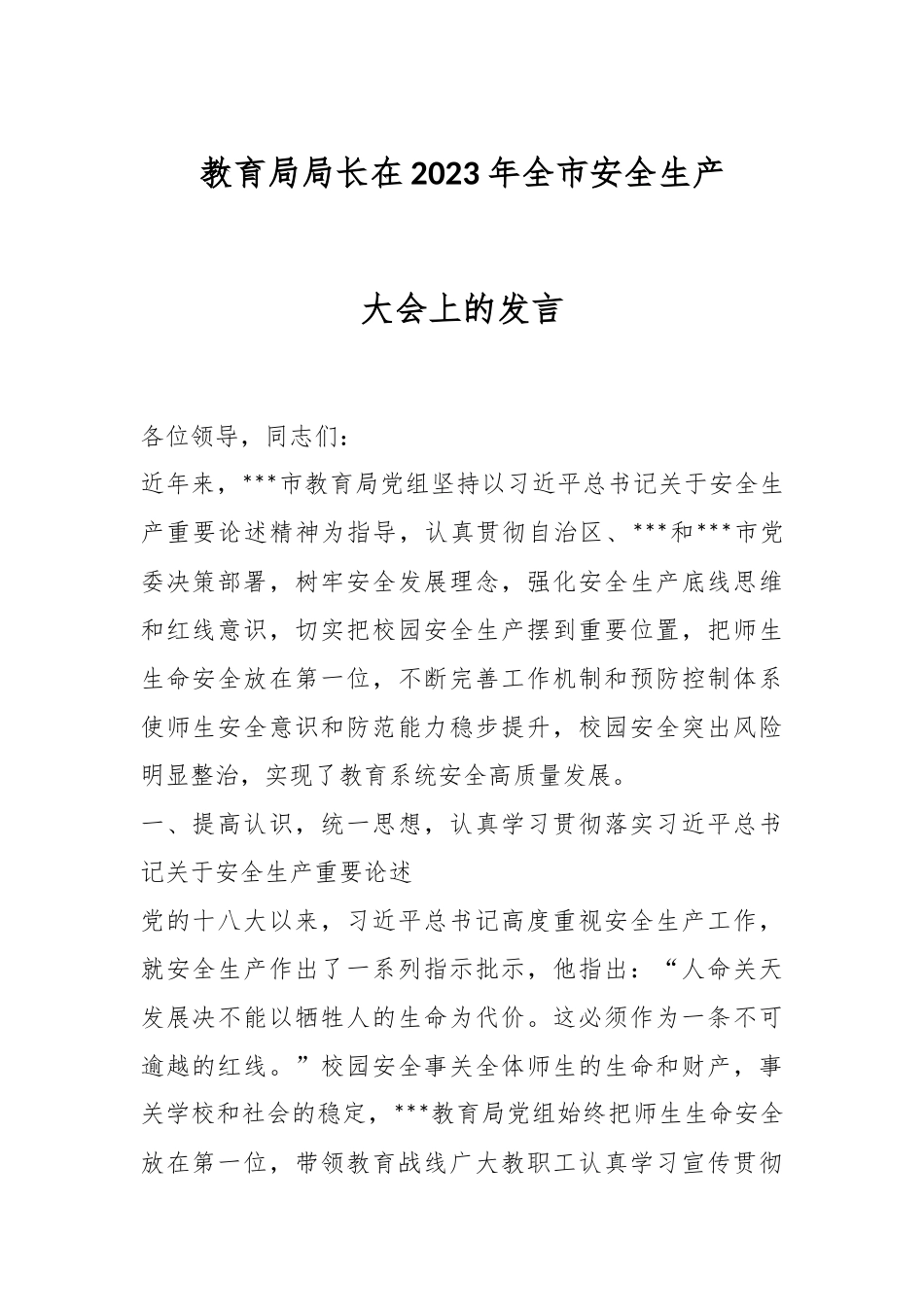 教育局局长在2023年全市安全生产大会上的发言各位领导,同志们:近年来,***市教育局党组坚持以习近平总书记关于安全生产重要论述精神为指导,认真贯彻自治区、***和***市党委决策部署,树牢安全发展理念,强化安全生产底线思维和红线意识,切实把校园安全生产摆到重要位置,把师生生命安全放在第一位,不断完善工作机制和预防控制体系使师生安全意识和防范能力稳步提升,校园安全突出风险明显整治,实现了教育系统安全高质量发展。一、提高认识,统一思想,认真学习贯彻落实习近平总书记关于安全生产重要论述党的十八大以来,习近平总书记高度重视安全生产工作,就安全生产作出了一系列指示批示,他指出:“人命关天发展决不能以牺牲人的生命为代价。这必须作为一条不可逾越的红线。”校园安全事关全体师生的生命和财产,事关学校和社会的稳定,***教育局党组始终把师生生命安全放在第一位,带领教育战线广大教职工认真学习宣传贯彻习近平总书记关于安全生产重要论述,切实提高思想认识织密校园安全网络。(一)营造良好学习宣传氛围。每年将宣传贯彻习近平总书记关于安全生产重要论述纳入教育系统年度学习宣传工作重点,以党组会、教育系统视频会议及时传达学习习近平总书记关于安全生产的最新指示要求。同时,结合“安全生产月”“安全生产万里行”“3.28全国中小学安全教育日”“119消防宣传月”等活动,精心制定宣传工作方案,将***市教育系统典型做法及时向***网进行推送,在***微信平台开设安全专题专栏,加强政策宣传、解读,不断提升师生知晓率、参与度,扩大受众面和影响力。(二)扎实推进***市教育系统安全生产专项整治三年行动。局党组班子成员分片挂钩,针对***市***多所中小学幼儿园常态化开展每学期开学安全工作检查,从源头上防范和遏制事故的发生。主动联合市场监管局对所有学校食堂进行检查验收,联合卫健委对学校“疫情防控”情况进行验收,联合交警***大队对校车进行检查,联合区消防大队对部分学校进行消防检查,要求各校全面排查安全隐患并上报安全工作“三清单”。在齐抓共管、共同治理的良好局面下,紧紧围绕学校三防建设、食品安全、交通安全、校园周边环境治理等重点工作,以明察暗访经常性地开展专项检查工作,把安全责任体系严格落实到位,确保学校平稳有序。(三)落实“五进”的要求做好安全进校园。通过加强校园安全生产宣传教育,面向广大学生普及安全知识技能,强化安全意识素质,做到从早抓起、从小抓起。***市教育局党组始终保持如履薄冰的高度警觉,认真履行岗位安全职责层层落实到基层一线,坚决反对形式主义、官僚主义。对在安全生产上不负责任、玩忽职守出问题的,严查严处、严肃追责。二、落实制度,完善机制,确保校园安全工作要求落在实处(一)构建教育系统安全责任体系。落实教育系统干部领导责任,坚持党政同责、一岗双责、齐抓共管、失职追责坚决扛起防范化解重大安全风险的政治责任;落实教育部门监管责任,指导督促学校加强安全管理,建立规范化标准化监管机制;与学校、幼儿园层层签订安全责任书,落实学校幼儿园安全主体责任,健全“明责、知责、履责、问责”的安全责任运行机制,做到人人有责、层层负责、各负其责,着力消除学校安全盲区漏洞。(二)夯实学校安防基础建设。严格落实《转发公安部、教育部<加快推动全国中小学幼儿园安全防范建设三年行动计划>的通知》要求,确保中小学幼儿园专职保安员配备率、校园封闭式管理、一键式紧急报警和视频监控系统达标率以及“护学岗”设置率达到4个100%。校园重点部位、重点区域、重点场所安装入侵报警、视频监控、紧急报警等技防设施,并接入公安机关的监控或报警平台,切实提升校园安全防范水平。(三)强化学校应急处置能力。督促学校制定完善突发事件应急预案,严格值班和信息报告制度,推动与学校周边重点救援力量建立应急联动机制,加强学校应急保障队伍建设及应急物资储备,完善应急管理分级响应制度和程序定期开展应急演练,确保出现险情第一时间有效应对,有效提升教育系统安全风险防范能力。三、坚持导向,狠抓落实,持续开展重点领域安全专项整治***市教育系统坚持问题...