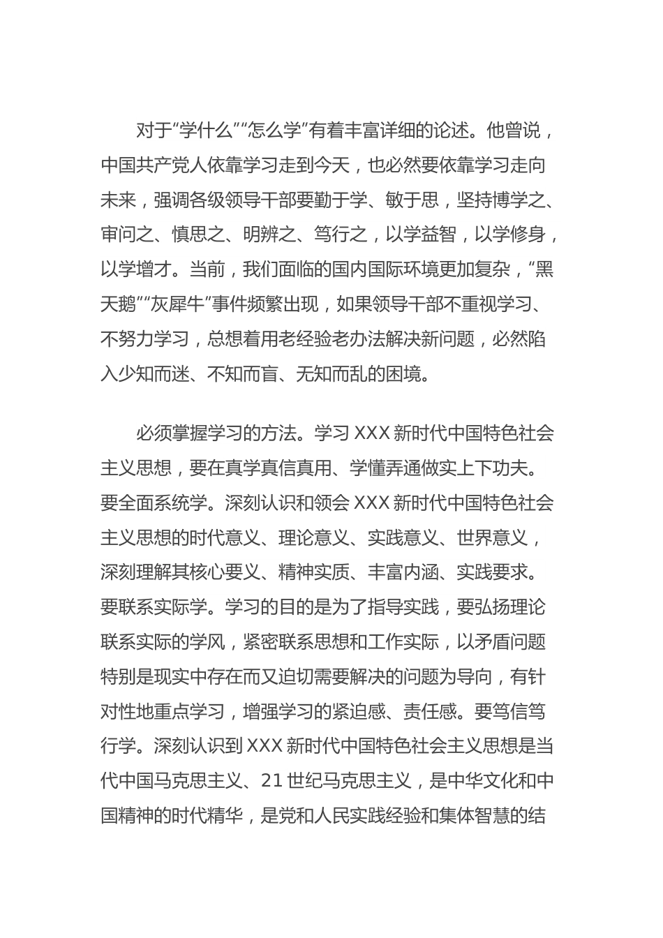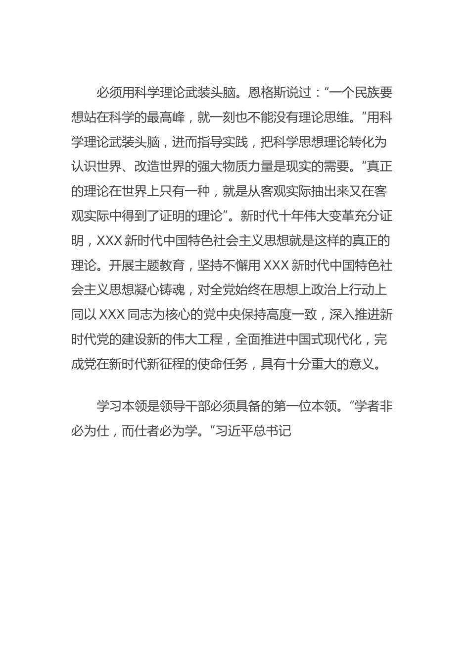 在理论学习中心组集体学习暨主题教育专题读书班上的研讨交流材料同志们:增强党员、干部的思想自觉性和行动自觉性,要在知和行两方面同时努力,既以知促行,又以行促知。这次主题教育的总要求是“学思想、强党性、重实践、建新功”,体现了我们党认识与实践相结合、理论与实际相联系、改造主观世界与改造客观世界相统一的一贯要求,是一个紧密联系、相互贯通、内在统一的整体,我们要把习近平总书记明确提出的这一总要求贯穿整个主题教育的全过程。下面,我谈几点体会,与同志们共同交流。第一,知者行之始,理论学习是前提党的理论创新每前进一步,理论武装就要跟进一步。“知之愈明,则行之愈笃”,学习贯彻XXX新时代中国特色社会主义思想是新时代新征程开创新事业、发展新局面的根本要求,广大党员干部特别是县处级以上领导干部要利用此次主题教育学习,进一步锻造精神、武装头脑。必须用科学理论武装头脑。恩格斯说过:“一个民族要想站在科学的最高峰,就一刻也不能没有理论思维。”用科学理论武装头脑,进而指导实践,把科学思想理论转化为认识世界、改造世界的强大物质力量是现实的需要。“真正的理论在世界上只有一种,就是从客观实际抽出来又在客观实际中得到了证明的理论”。新时代十年伟大变革充分证明,XXX新时代中国特色社会主义思想就是这样的真正的理论。开展主题教育,坚持不懈用XXX新时代中国特色社会主义思想凝心铸魂,对全党始终在思想上政治上行动上同以XXX同志为核心的党中央保持高度一致,深入推进新时代党的建设新的伟大工程,全面推进中国式现代化,完成党在新时代新征程的使命任务,具有十分重大的意义。学习本领是领导干部必须具备的第一位本领。“学者非必为仕,而仕者必为学。”习近平总书记对于“学什么”“怎么学”有着丰富详细的论述。他曾说,中国共产党人依靠学习走到今天,也必然要依靠学习走向未来,强调各级领导干部要勤于学、敏于思,坚持博学之、审问之、慎思之、明辨之、笃行之,以学益智,以学修身,以学增才。当前,我们面临的国内国际环境更加复杂,“黑天鹅”“灰犀牛”事件频繁出现,如果领导干部不重视学习、不努力学习,总想着用老经验老办法解决新问题,必然陷入少知而迷、不知而盲、无知而乱的困境。必须掌握学习的方法。学习XXX新时代中国特色社会主义思想,要在真学真信真用、学懂弄通做实上下功夫。要全面系统学。深刻认识和领会XXX新时代中国特色社会主义思想的时代意义、理论意义、实践意义、世界意义,深刻理解其核心要义、精神实质、丰富内涵、实践要求。要联系实际学。学习的目的是为了指导实践,要弘扬理论联系实际的学风,紧密联系思想和工作实际,以矛盾问题特别是现实中存在而又迫切需要解决的问题为导向,有针对性地重点学习,增强学习的紧迫感、责任感。要笃信笃行学。深刻认识到XXX新时代中国特色社会主义思想是当代中国马克思主义、21世纪马克思主义,是中华文化和中国精神的时代精华,是党和人民实践经验和集体智慧的结晶,是中国特色社会主义理论体系的重要组成部分,是全党全国各族人民为实现中华民族伟大复兴而奋斗的行动指南,必须长期坚持并不断发展。学习这一理论,要切实掌握这一理论的立场观点方法,最终将学习成效转化为解决问题的实际能力。第二,行者知之成,实践运用是目的实践性是马克思主义的显著特征,学习XXX新时代中国特色社会主义思想的目的在于运用,在于把这一思想变成改造主观世界和客观世界的强大思想武器。学习掌握XXX新时代中国特色社会主义思想的立场观点方法,更好领会这一思想的精髓要义,才能正确指导实践,推动发展。匡正干的导向。空谈误国,实干兴邦,我们取得的一切成就都是实实在在干出来的。习近平总书记指出,领导干部要发扬“功成不必在我、功成必定有我”的精神,坚持一张蓝图绘到底,一茬接着一茬干。要树牢为民造福的政绩观,坚持人民至上,一切为了人民、一切依靠人民,牢固树立以人民为中心的发展思想,切实解民忧、纾民难,聚焦就业、医疗、教育、养老等群众急难愁盼的具体问题出实招求实效,不断增强人民群众的获得感、幸福感、安全感。增强干的动力。船到中流浪更...