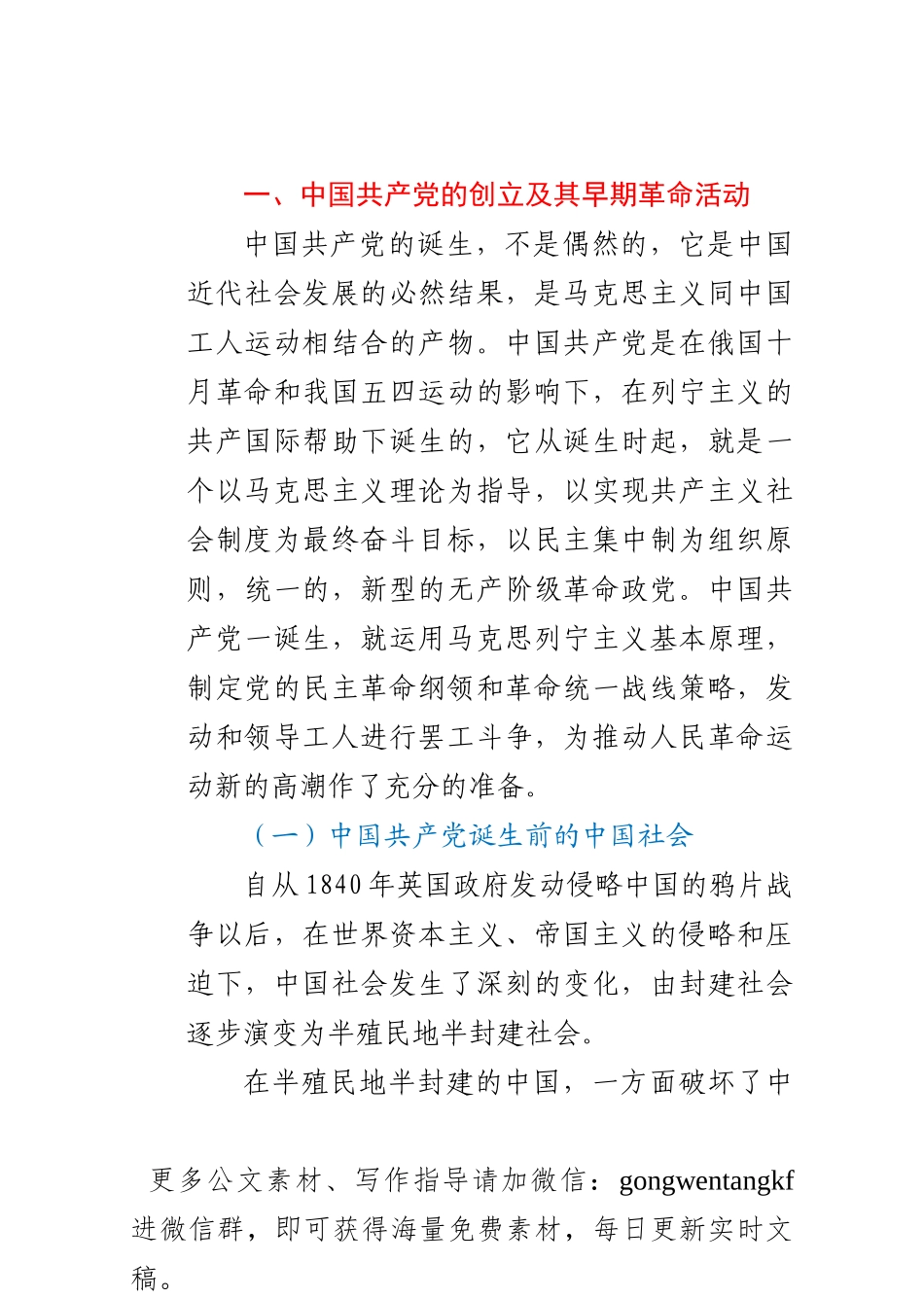 建党100周年党史党课讲稿一部中国共产党的历史,是中国共产党人用100年的汗水和鲜血谱写的篇章,今天我只能提纲性地概说从中国共产党的诞生到十一届三中全会拨乱反正的历史过程。我把讲的内容分为二个部分,第一部分是建国前的党史。第二部分是建国后的党史。建国前的党史可分为五个阶段:①中国共产党的创立及早年革命活动时期(1919.5—1923.12);②第一次国内革命战争时期,也就是北伐战争时期(1924.1--1927.7)③第二次国内革命战争时期(1927.8—1937.7);④抗日战争时期(1937.7—1948.8);⑤第三次国内革命战争时期(即解放战争时期)(1945.8—1949.9)。建国后的党史也分为四个阶段:①基本完成社会主义改造时期;②开始全面建设社会主义时期;③WHDGM时期;④历史的伟大转折时期。更多公文素材、写作指导请加微信:gongwentangkf进微信群,即可获得海量免费素材,每日更新实时文稿。一、中国共产党的创立及其早期革命活动中国共产党的诞生,不是偶然的,它是中国近代社会发展的必然结果,是马克思主义同中国工人运动相结合的产物。中国共产党是在俄国十月革命和我国五四运动的影响下,在列宁主义的共产国际帮助下诞生的,它从诞生时起,就是一个以马克思主义理论为指导,以实现共产主义社会制度为最终奋斗目标,以民主集中制为组织原则,统一的,新型的无产阶级革命政党。中国共产党一诞生,就运用马克思列宁主义基本原理,制定党的民主革命纲领和革命统一战线策略,发动和领导工人进行罢工斗争,为推动人民革命运动新的高潮作了充分的准备。(一)中国共产党诞生前的中国社会自从1840年英国政府发动侵略中国的鸦片战争以后,在世界资本主义、帝国主义的侵略和压迫下,中国社会发生了深刻的变化,由封建社会逐步演变为半殖民地半封建社会。在半殖民地半封建的中国,一方面破坏了中更多公文素材、写作指导请加微信:gongwentangkf进微信群,即可获得海量免费素材,每日更新实时文稿。国自给自足的自然经济基础,破坏了城市的和农民的家庭手工业,为中国资本主义发展创造了商品市场和劳动力市场,促进了中国城乡商品经济和民族资本主义的发展;另一方面,又阻碍了中国资本主义的发展,因为世界资本主义,帝国主义侵略中国的目的,是要把中国变为它们的殖民地,它们不但运用政治的、军事的和经济的手段,对中国民族工业进行直接的压迫,还极力保持中国封建的剥削形式及其的上层建筑,把中国地主阶级作为它们的统治工具和支柱,阻碍和破坏中国生产力的发展。从此以后,中国人民受尽了帝国主义,封建资本主义和封建地主阶级的三重压迫和剥削,处于危难之中。中国的出路在哪里?中国广大人民如何才能当家作主,发展中国的社会生产力?一大批有志气的中国人在呐喊,在寻求救国之路……一九一一年,资产阶级革命家孙中山先生领导了资产阶级旧民主主义的辛亥革命,推翻了清代皇朝,结束了中国长达二千多年的封建帝制,更多公文素材、写作指导请加微信:gongwentangkf进微信群,即可获得海量免费素材,每日更新实时文稿。建立了中华民国。但好景不长,辛亥革命的成果被北洋军阀头子袁世凯所窃取。袁世凯为了帝制,积极投靠帝国主义,野蛮地镇压革命人民,血腥地屠杀革命人士。从此,各地军阀纷纷割据,中国完全沦入了四分五裂的境地。这就是建党前的中国社会现状。(二)五四运动,马克思主义在中国的传播在辛亥革命的影响下,一大批有识之士在寻求救国之路,中国出现了新文化运动。主要代表有陈独秀、李大钊、鲁迅、还有资产阶级的民族主义者胡适等大批人士,他们倡导民主、和平、自由,抨击封建礼教,传播西方文化。特别是一九一七年,俄国十月革命胜利对中国的影响最大,它送来了马克思列宁主义,从此,中国的先进分子开始接受和宣传马克思列宁主义,并用无产阶级的世界观作为观察国家命运的工具,重新考虑自己的问题。一九一九年中国爆发了五四爱国运动。他们高呼“外争国权,内惩国贼”的口号,得到全国各地工人、学生的热烈响应和支持,使更多公文素材、写作指导请加微信:gongwentangkf进微信群,即可获得海量免费素材,每日更新实时文稿。工人运动迅速掀起,五四运动...