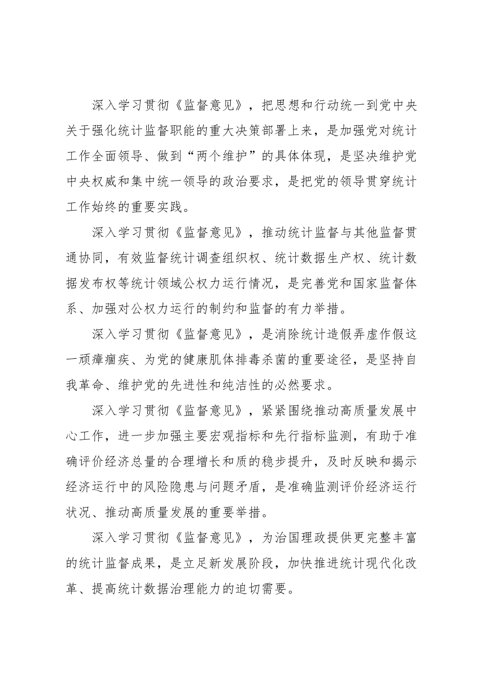 在区统计局党组理论中心组专题学习研讨《监督意见》上的交流发言根据会议安排,下面由我就围绕中共中央办公厅、国务院办公厅《关于更加有效发挥统计监督职能作用的意见》(以下简称《监督意见》)的学习,进行交流发言,谈谈自己的感悟。一、深化思想认识,提高政治站位党的十八大以来,以习近平同志为核心的党中央高度重视统计工作。党中央先后印发《关于深化统计管理体制改革提高统计数据真实性的意见》《统计违纪违法责任人处分处理建议办法》《防范和惩治统计造假、弄虚作假督察工作规定》(以下简称《意见》《办法》《规定》)等重要文件,实施一系列重要改革举措,统计监督取得明显成效。党的十九届四中全会要求发挥“统计监督职能作用”。党的十九届六中全会要求“构建以党内监督为主导、各类监督贯通协调的机制,加强对权力运行的制约和监督”。2021年8月30日,习近平总书记主持召开中央深改委会议,审议通过了《监督意见》,这是中央深改委通过的第4个关于统计工作的重要文件。深入学习贯彻《监督意见》,把思想和行动统一到党中央关于强化统计监督职能的重大决策部署上来,是加强党对统计工作全面领导、做到“两个维护”的具体体现,是坚决维护党中央权威和集中统一领导的政治要求,是把党的领导贯穿统计工作始终的重要实践。深入学习贯彻《监督意见》,推动统计监督与其他监督贯通协同,有效监督统计调查组织权、统计数据生产权、统计数据发布权等统计领域公权力运行情况,是完善党和国家监督体系、加强对公权力运行的制约和监督的有力举措。深入学习贯彻《监督意见》,是消除统计造假弄虚作假这一顽瘴痼疾、为党的健康肌体排毒杀菌的重要途径,是坚持自我革命、维护党的先进性和纯洁性的必然要求。深入学习贯彻《监督意见》,紧紧围绕推动高质量发展中心工作,进一步加强主要宏观指标和先行指标监测,有助于准确评价经济总量的合理增长和质的稳步提升,及时反映和揭示经济运行中的风险隐患与问题矛盾,是准确监测评价经济运行状况、推动高质量发展的重要举措。深入学习贯彻《监督意见》,为治国理政提供更完整丰富的统计监督成果,是立足新发展阶段,加快推进统计现代化改革、提高统计数据治理能力的迫切需要。二、把握主要内容,领会精神要义《监督意见》主要分为三大主体内容,主要包括总体要求、主要任务和加强组织领导三大部分。第一部分总体要求提出要坚持方法科学、遵循规律、及时准确、真实可靠、防止虚假,坚决遏制“数字上的腐败”,提升统计监督有效性,使监督结果经得起实践和历史检验,为全面建设社会主义现代化国家提供统计保障。第二部分提出了五个主要任务。一是着力提升统计督查效能。统筹开展常规统计督查、专项统计督查和统计督查“回头看”,原则上每五年对各省、自治区、直辖市和国务院有关部门开展统计督查,健全督查整改落实体制机制,进一步压实整改责任。建立下级向上级报告年度防范和惩治统计造假、弄虚作假工作制度,构建起从上到下、层层负责的领导责任体系。二是持续加大统计执法力度。依规依纪依法严肃查处各类统计违纪违法行为。建立常态化统计执法机制,完善“双随机”抽查制度,建立统计违纪违法责任倒查机制,通报重大违纪违法案件,曝光典型案例,同时强化统计领域信用建设。对各地区清理和纠正违反统计法律法规的文件和做法情况进行全面检查。三是依法独立履行监测评价职能。将各地区各部门对党中央、国务院关于经济社会发展重大决策部署贯彻落实情况作为统计监督的重要内容,重点监测评价国家重大发展战略实施情况、重大风险挑战应对成效、人民群众反映突出问题解决情况等。重点监督领导干部在推动经济社会发展方面是否认真贯彻落实党中央、国务院决策部署,是否存在履职不力、担当作为不够甚至弄虚作假、欺上瞒下等问题。四是加强对推动高质量发展情况的统计监督。统计部门会同有关部门开展高质量发展综合绩效评价,加强对相关部门统计工作的组织协调和业务指导。重点评价各地区推动高质量发展工作的总体情况,有效反映高质量发展进程中的优势、成效和短板,以高效能统计监督服务高质量发展。五是建立健全统计监督协同配合机制。...