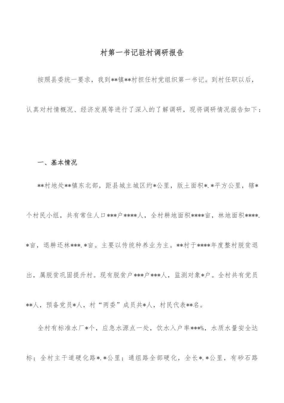村第一书记驻村调研报告按照县委统一要求,我到**镇**村担任村党组织第一书记。到村任职以后,认真对村情概况、经济发展等进行了深入的了解调研,现将调研情况报告如下:一、基本情况**村地处**镇东北部,距县城主城区约*公里,版土面积*.*平方公里,辖*个村民小组,共有常住人口***户****人,全村耕地面积****亩,林地面积****.*亩,退耕还林***.*亩。主要以传统种养业为主。**村于****年度整村脱贫退出,属脱贫巩固提升村。现有脱贫户***户***人,监测对象*户。全村共有党员**人,预备党员*人,村“两委”成员共*人,村民代表**名。全村有标准水厂*个,应急水源点一处,饮水入户率***%,水质水量安全达标;全村主干道硬化路*.*公里;通组路全部硬化,全长*.*公里,有砂石路(产业路)**公里;电力网改**千米。动力用电配送到各个生产小组,**千伏高压电配送到村,用电入户率***%,家庭农场动力电配送到户;通讯网络全覆盖。第一产业:主要以种植油菜、玉米、花生、薯类、蔬菜为主。养殖业以养牛、鸡为主。村内二、三产业几乎为零。农民收入主要靠外出务工。村集体经济收入匮乏,脱贫攻坚期间,村集体成立了种植合作社,发展拐枣****亩,目前还处于前期管护中,没有收益产生。村内有养牛、养鸡大户*家,受市场影响,经济效益不高。二、**村发展的优势一是民情优势。民风淳朴,村民法制观念较好,政治意识较浓;村民求富心切,各自都在寻找门路,力求在解决温饱的基础上,过上更好的生活,因而易于引导;通过近几年的脱贫攻坚,基础设施条件极大改善,群众的生产、生活观念发生了转变,容易接受新生事物,创新意识明显提高。二是区位、资源优势。**村距离县城只有*公里,交通便捷;生态环境优美,林木茂盛,有利于发展山林经济。三是产业发展有群众基础。近几年,村两委陆续发展了种植、养殖大户。也有群众自发的发展林果、养蜂产业。三、发展中面临的问题(一)经济基础薄弱。全村属于浅山丘陵地貌,地势狭窄,落差较大。土地多为旱地,水田很少。客观上制约了农业规模化生产经营;农业生产总体上还是粗放生产,且多以零散种养为主,尚未形成规模效应和集约效应;农产品多停留在初级生产上,且产量底,没有特色;村级集体经济薄弱,村民增收缓慢。(二)产业发展还未形成规模,还未产生收益,后期管护还须投入大量资金,基础设施条件需要大力改善。(三)有用人才资源较为匮乏,农业产业留不住人;二、三产业受人口、地理位置、自然条件等方面的影响,发展受限,几乎为空白。四、下一步工作计划(一)针对集体经济薄弱,几乎无收入的问题。一方面是稳定发展现有产业,加强后期管护,力争早日产生收益;另一方面是大力争取各级项目资金和企业等社会各界对村集体的帮扶力度,同时大力挖掘现有资源进行增收。(二)针对农民增收和生活问题。一是引导农民发展有特色、附加值高的种植、养殖业;二是鼓励村民外出务工,动员在外务工的能人带动村民到经济效益好的企业、单位务工;三是加强职业技能培训;四是积极协助落实就业、创业政策和现行普惠政策;五是大力改善基础设施条件,对村内道路进行整修,美化绿化环境。(三)强化招商引资的意识和力度,对有在本村投资创业意愿的人士,做好跟进服务,创造拴心留人的外部环境。