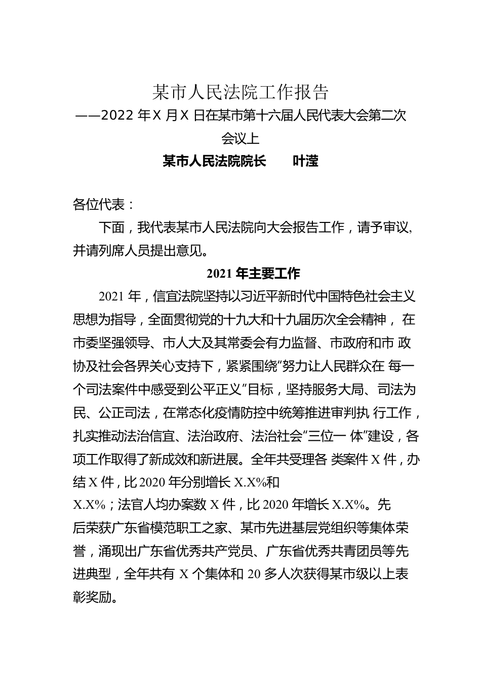 某市人民法院工作报告——2022年X月X日在某市第十六届人民代表大会第二次会议上某市人民法院院长叶滢各位代表:下面,我代表某市人民法院向大会报告工作,请予审议,并请列席人员提出意见。2021年主要工作2021年,信宜法院坚持以习近平新时代中国特色社会主义思想为指导,全面贯彻党的十九大和十九届历次全会精神,在市委坚强领导、市人大及其常委会有力监督、市政府和市政协及社会各界关心支持下,紧紧围绕“努力让人民群众在每一个司法案件中感受到公平正义”目标,坚持服务大局、司法为民、公正司法,在常态化疫情防控中统筹推进审判执行工作,扎实推动法治信宜、法治政府、法治社会“三位一体”建设,各项工作取得了新成效和新进展。全年共受理各类案件X件,办结X件,比2020年分别增长X.X%和X.X%;法官人均办案数X件,比2020年增长X.X%。先后荣获广东省模范职工之家、某市先进基层党组织等集体荣誉,涌现出广东省优秀共产党员、广东省优秀共青团员等先进典型,全年共有X个集体和20多人次获得某市级以上表彰奖励。一、推进平安信宜建设取得新成效依法严惩刑事犯罪。共受理刑事案件X件,审结X件X人。严厉打击危害公共安全犯罪,审结危险驾驶等犯罪案件X件,有力维护社会安定。严惩危害群众生命财产安全犯罪,审结故意伤害、故意杀人、强奸等暴力犯罪案件52件;审结“两抢一盗”、诈骗等多发性侵犯财产权益案件X件,切实提升群众安全感。严厉打击毒品犯罪,审结涉毒品案件X件,依法审理罗某庆等X人X件贩卖、运输毒品案,全力打赢禁毒人民战争。严惩电信网络诈骗犯罪,审结廖某信息网络犯罪活动案等电信网络诈骗及关联案件19件X人,决不让网络空间成为法外之地。常态化开展扫黑除恶斗争。依法审结公诉机关以涉黑恶起诉的案件X件X人。对李某等X人恶势力集团犯罪案件依法判处四年二个月至一年七个月不等的刑罚。坚持“打财断血”,依法判处财产刑并追缴、没收违法所得,实际执行到位金额X多万元。我院司法警察大队和X名干警获得茂名、信宜两级扫黑除恶斗争领导小组表彰。加强人权司法保障。坚持惩罚犯罪和保障人权相结合,严格执行罪刑法定、疑罪从无、证据裁判,对X名罪行较轻、主观恶性和社会危害性不大的被告人适用缓刑。落实刑事辩护全覆盖,指定辩护律师X人次。认真做好青少年犯罪预防、回访帮教、X区矫正等工作,未成年人犯罪案件呈下降趋势。二、服务信宜高质量发展打开新局面服务经济健康发展。共受理民商事案件X件,审结X件,助力构建“开放创新”的产业体系和营商环境。出台保护民营企业合法权益工作意见,全方位依法保护民营企业合法权益。落实疫情常态化防控,妥善审理合同违约、企业债务、房屋租赁等涉疫情民事案件X件,降低疫情影响。持续推进民营经济领域纠纷诉调对接工作,化解涉民营企业纠纷X件,为民营企业挽回经济损失X多万元。服务XX乡村振兴。依法审(执)结各类涉农案件X件。制定XX乡村振兴实施意见,引导乡村矛盾依法治理、依法维权。联合市政协构建“法院+协商”诉前联调机制,充分发挥村务协商议事会“有事好商量,众人的事情由众人商量”的民主协商作用,成功化解涉及排水、通行等相邻关系矛盾纠纷X件。融入基层社会治理综合网格,由X个人民法庭X名法官、X名法官助理深入法X区内XXX镇X个村居建立对接关系,推行“网格化管理”,通过“线下走访”和“线上服务”等多种形式,开展法治宣传X场次,诉前化解矛盾纠纷X起,提高村民尊法、守法、学法、懂法、信法、用法意识。服务生态文明建设。服务生态保护和绿色发展,审结涉及土地、矿产等生态环境保护相关物权、合同和侵权案件X件。执行最严格生态环境保护制度,审结等涉环境资源犯罪案件X件,对曾某平、陈某添等X人非法采矿案件判处五年六个月至一年五个月不等的刑罚,并依法判处相应的罚金,最大限度减少环境损害,全力提升信宜“绿色秀美”的生态优势和宜居质量。三、保障民生权益工作迈上新台阶完善诉讼服务体系。完善诉讼服务中心、网上诉讼服务平台、“X”热线“三位一体”诉讼服务体系建设,为当事人提供“一站通办、一网通办、一号通办、一次通办”诉讼服务。依托“智慧法院”互联网司法技术,全年网上...