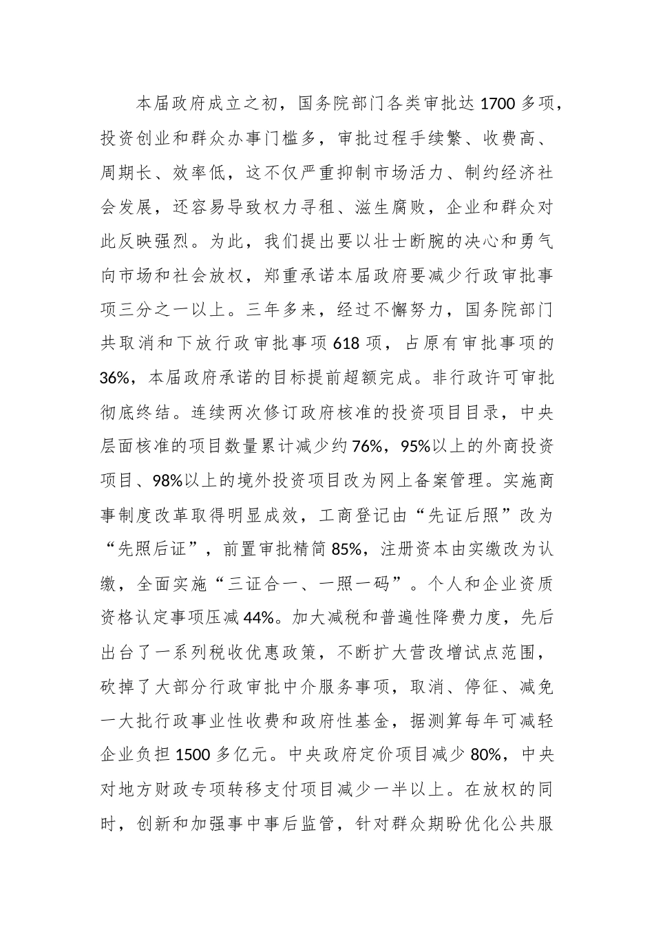 深化简政放权放管结合优化服务推进行政体制改革转职能提效能这次会议的主要任务是,总结回顾三年多来简政放权放管结合、优化服务改革情况,部署下一阶段重点工作,以更有力举措深化“放管服”,推进行政体制改革、转职能、提效能。下面,我讲几点意见。一、深化简政放权放管结合优化服务改革,是推动经济社会持续健康发展的战略举措推进行政体制改革,是全面深化改革、完善社会主义市场经济体制的重要内容,也是提高政府现代治理能力的关键举措,是政府的自身改革。党的十八大以来,以习近平同志为总书记的党中央高度重视有关工作,提出明确要求。十八届二中全会指出,转变政府职能是深化行政体制改革的核心。十八届三中全会强调,经济体制改革的核心问题是处理好政府和市场的关系,使市场在资源配置中起决定性作用和更好发挥政府作用,其关键就是转变政府职能。本届政府成立以来,我们牢牢扭住转变政府职能这个“牛鼻子”,先是着力推进简政放权、放管结合,去年又将优化服务纳入其中,“放管服”三管齐下、协同推进,中央和地方上下联动、合力攻坚,不断将改革推向深入。本届政府成立之初,国务院部门各类审批达1700多项,投资创业和群众办事门槛多,审批过程手续繁、收费高、周期长、效率低,这不仅严重抑制市场活力、制约经济社会发展,还容易导致权力寻租、滋生腐败,企业和群众对此反映强烈。为此,我们提出要以壮士断腕的决心和勇气向市场和社会放权,郑重承诺本届政府要减少行政审批事项三分之一以上。三年多来,经过不懈努力,国务院部门共取消和下放行政审批事项618项,占原有审批事项的36%,本届政府承诺的目标提前超额完成。非行政许可审批彻底终结。连续两次修订政府核准的投资项目目录,中央层面核准的项目数量累计减少约76%,95%以上的外商投资项目、98%以上的境外投资项目改为网上备案管理。实施商事制度改革取得明显成效,工商登记由“先证后照”改为“先照后证”,前置审批精简85%,注册资本由实缴改为认缴,全面实施“三证合一、一照一码”。个人和企业资质资格认定事项压减44%。加大减税和普遍性降费力度,先后出台了一系列税收优惠政策,不断扩大营改增试点范围,砍掉了大部分行政审批中介服务事项,取消、停征、减免一大批行政事业性收费和政府性基金,据测算每年可减轻企业负担1500多亿元。中央政府定价项目减少80%,中央对地方财政专项转移支付项目减少一半以上。在放权的同时,创新和加强事中事后监管,针对群众期盼优化公共服务。各地在承接上级下放权限的同时,积极推进本层级的“放管服”改革,多数省份行政审批事项减少50%左右,有的达到70%。这一系列改革,很大程度上为企业“松了绑”、为群众“解了绊”、为市场“腾了位”,也为廉政“强了身”极大激发了市场活力和社会创造力。特别是推动了新动能加快成长,大众创业万众创新热情空前高涨,新增市场主体持续快速增长,去年至今全国平均每天新增4万户,其中新登记企业平均每天新增1.2万户,企业活跃度保持在70%左右。我国营商环境明显改善,市场准入和运行的制度成本大幅降低,全要素生产率稳步提升。世界银行发布报告近两年中国内地的营商便利度在全球的排名每年提升6个位次。这几年,在国内外经济形势严峻复杂、国内传统动能减弱的情况下和“三期叠加”的背景下,我们没有搞强刺激,而是坚持把深化“放管服”改革作为“先手棋”和“当头炮”,着力推进结构性改革尤其是供给侧结构性改革,释放市场的潜力和活力。我国经济运行之所以保持在合理区间,增长速度在世界主要经济体中位居前列,城镇新增就业连续三年超过1300万人,居民收入不断增长,社会保持和谐稳定,“放管服”改革发挥了关键性作用。在充分肯定成绩的同时,也要清醒地看到,政府仍然管了很多不该管的事,一些该管的却没有管或没有管住、管好,转职能、提效能还有很大空间。从简政放权方面看该放的权有些还没有放,一些已出台的放权措施还没有完全落地。比如,投资领域审批虽经压缩,但各种审批“要件”、程序、环节等还是繁多,审批时间还是比较长,有的审批只是由“万里长征”变成了“千里长征”。各种证照包括职业资格认定和行业准...