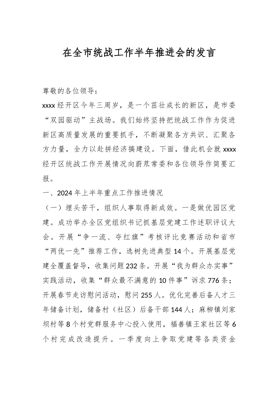 在全市统战工作半年推进会的发言尊敬的各位领导:xxxx经开区今年三周岁,是一个茁壮成长的新区,是市委“双园驱动”主战场。我们始终坚持把统战工作作为促进新区高质量发展的重要抓手,不断凝聚各方共识、汇聚各方力量,全力以赴拼经济搞建设。下面,借此机会就xxxx经开区统战工作开展情况向蔚荩常委和各位领导作简要汇报。一、2024年上半年重点工作推进情况(一)埋头苦干,组织人事取得新成效。一是做优园区党建。成功举办全区党组织书记抓基层党建工作述职评议大会。开展“争一流、夺红旗”考核评比竞赛活动和省市“两优一先”推荐工作,选树先进典型14个。开展基层党建全覆盖督导,收集问题232条。开展“我为群众办实事”实践活动,收集“群众最不满意的10件事”诉求776条;开展春节走访慰问活动,慰问255人。优化完善后备人才三年储备计划,储备村(社区)后备干部144人;麻柳镇刘家坝村等8个村党群服务中心投入使用,福善镇王家社区等6个村完成改造提升。一季度向上争取党建等各类资金66.036万元,完成率居全区第二。二是抓好党员教育。开展7期“经开大讲堂”,共计培训全区干部550余人次;开通“智慧党建”云平台站点70个,实现党员教育全覆盖。三是建强干部队伍。完成对全区各部门(单位)、乡镇领导班子运行调研,有序做好干部选任和职级晋升工作,提拔重用科级干部9名,公务员职级晋升33人,事业单位职员等级晋升17名,向市委推荐副县级干部1名。择优调入公务员2名、事业单位人员4名。完成全区公务员、事业人员2022年年度考核工作,嘉奖205人,记三等功10人。四是招引八方之才。完成2024年上半年公务员招录4人,事业单位招聘2人。通过“xx英才计划”成功引进硕士研究生2名,麻柳中学人才引进9个岗位共计69人已进入资格复审环节。五是调整机构编制。撤并整合16所中小学为13所,所有教职工划转到位。初步完成乡镇机构改革方案,分设乡镇林业站和自然资源所。六是扎实推动主题教育。组织召开区党工委党建领导小组(扩大)会议,举办区级领导干部专题读书班,开展专题研讨2次。征订《中国共产党纪律处分条例》930余册,推送《中国共产党纪律处分条例》权威解读25期,印发《答复意见》3期、《工作提示》6期,推动党纪学习教育不断走深走实。(二)精益求精,宣传文化得到新提升。一是持续强化思想引领。严格落实“第一议题”制度,组织召开区党工委理论学习中心组学习会6次,举办区级读书班2次、党纪学习教育专题研讨1次。扎实开展基层理论宣讲100余场,精心策划《每日一学》71期。二是持续夯实宣传阵地。监测处置网上涉政信息100余条、不良过激信息60余条,受理网民诉求53件,回复率100%,约谈教育网络谣言传播人员1名,切实走好网上群众路线。持续强化对外宣传,向人民网、新华社、四川日报、xx日报等中央、省、市主流媒体推送稿件300余篇,精心制作《传奇·梦想》宣传片,代表全市参加川东北研学盛典。开展实践活动200余场,发放创文、网络安全等惠民手册8000余份,获评四川省学雷锋先进个人1人,xx市岗位学雷锋标兵1人。三是压实责任主体。累计开展意识形态专项检查3次,发现整改问题20余条。(三)用心用情,统战群团实现新突破。一是全力确保宗教领域和谐稳定。开展宗教场所安全督查5次、《宗教事务条例》贯彻落实情况专项检查3次,发现问题4个。二是群团工作有序推进。举办“逐梦经开同创未来”主题工会活动、三八妇女节活动、庆六一慰问活动,结合“安全宣传月”活动,开展线上线下安全宣传12000余人次。三是为群众排忧解难。扎实开展两癌筛查500人,救助16人,购买两癌保险495人,妥善处理工会信访问题1件。(四)担当实干,人大政协迈上新台阶。首次独立承办市五届人大五次会议、市政协五届四次会议和区三届人大四次会议、区政协三届四次会议,圆满完成达川二团各项会议议程,有序推进34件人大代表建议、7件政协委员提案办理工作和区乡两级政协工作联络委员会设立工作,统筹完成人大政协院校调研活动14次。二、下半年工作谋划(一)组织人事方面。一是结合巡查反馈问题,全面开展基层党建大排查专项行动,靶向制定整改措施。二是推动党纪学习教育各项工作,引导广...