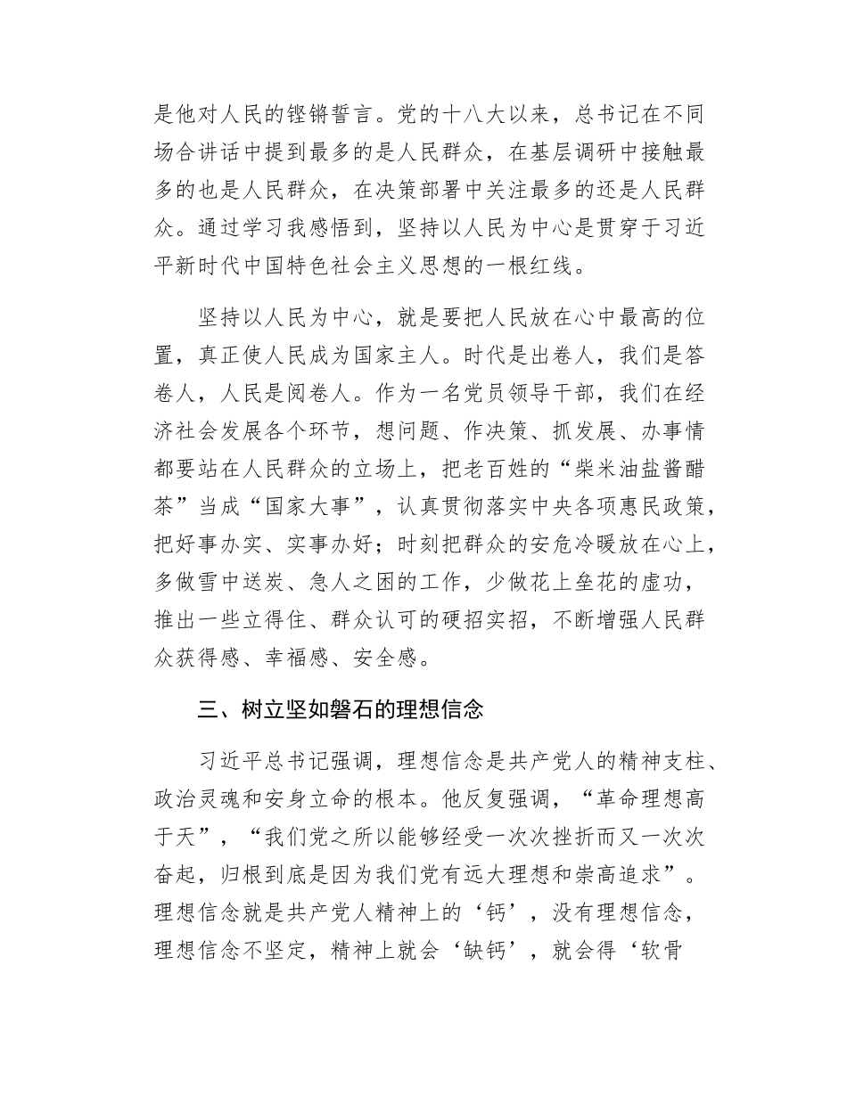 在乡镇理论中心组暨2024-2025年度生活会学习研讨会上的发言本人聚焦党纪学习教育,严格按照工作要求,在以学正纪、以学促干上下功夫,通过读原文、悟原理,认真学习了党的XX大报告、二十届三中全会《决议》、《中国共产党纪律处分条例》等内容,更加深刻认识到新思想的真理力量和实践伟力。现结合个人所学所思所感所悟,跟大家谈几点心得体会。习近平新时代中国特色社会主义思想是当代中国马克思主义,是党和国家必须长期坚持的指导思想。学懂弄通做实习近平新时代中国特色社会主义思想是党员干部的基本功、必修课。这次专题读书班,我深入学习领会其基本内容、理论体系、实践要求,同时对其基本立场观点方法认真思索。结合自己的学习体会,就贯穿于这一科学理论的基本立场观点方法谈谈认识。一、坚持党的领导不动摇习近平总书记在《坚持党的政治建设,始终保持党的团结统一》一文中深刻指出:“治理好我们这个世界上最大的政党和人口最多的国家,必须坚持党的集中统一领导,维护党中央权威,确保党始终总揽全局、协调各方。”他深刻总结中国的历史经验和规律,创造性提出,“中国共产党领导是中国特色社会主义最本质的特征,是中国特色社会主义制度的最大优势”。过去的新冠疫情,对世界各国的政治制度和治理模式提出了一场大考。可以说,中国特色社会主义取得了完胜。中国xx的成功和西方xx的溃败,最主要的原因就在于党的统一领导,使党的大政方针和党中央决策部署及时地、不折不扣地贯彻落实。“抗疫斗争伟大实践再次证明,中国共产党所具有的无比坚强的领导力,是风雨来袭时中国人民最可靠的主心骨”。身为党员干部,要自觉维护党中央权威和集中统一领导,在思想上政治上行动上全方位向习近平总书记看齐、向党中央看齐,表里如一、知行合一。要不折不扣贯彻落实习近平总书记重要讲话、重要指示批示精神和党中央决策部署。要做到党中央提倡的坚决响应,党中央决定的坚决照办,党中央禁止的坚决杜绝。要在日常履职尽责、做好本职工作时多打大算盘、算大账,不讲条件、不搞变通,不掉队、不走偏,心往一块想、劲往一处使,在党的旗帜下团结成“一块坚硬的钢铁”,步调一致向前进。二、站稳以人民为中心的根本政治立场习近平新时代中国特色社会主义思想之所以受到广大人民群众的广泛认同和坚决拥护,就因为始终坚持以人民为中心的根本政治立场。习近平总书记是在人民中成长起来的,“我是人民的勤务员”、“我将无我,不负人民”,是他对人民的铿锵誓言。党的十八大以来,总书记在不同场合讲话中提到最多的是人民群众,在基层调研中接触最多的也是人民群众,在决策部署中关注最多的还是人民群众。通过学习我感悟到,坚持以人民为中心是贯穿于习近平新时代中国特色社会主义思想的一根红线。坚持以人民为中心,就是要把人民放在心中最高的位置,真正使人民成为国家主人。时代是出卷人,我们是答卷人,人民是阅卷人。作为一名党员领导干部,我们在经济社会发展各个环节,想问题、作决策、抓发展、办事情都要站在人民群众的立场上,把老百姓的“柴米油盐酱醋茶”当成“国家大事”,认真贯彻落实中央各项惠民政策,把好事办实、实事办好;时刻把群众的安危冷暖放在心上,多做雪中送炭、急人之困的工作,少做花上垒花的虚功,推出一些立得住、群众认可的硬招实招,不断增强人民群众获得感、幸福感、安全感。三、树立坚如磐石的理想信念习近平总书记强调,理想信念是共产党人的精神支柱、政治灵魂和安身立命的根本。他反复强调,“革命理想高于天”,“我们党之所以能够经受一次次挫折而又一次次奋起,归根到底是因为我们党有远大理想和崇高追求”。理想信念就是共产党人精神上的‘钙’,没有理想信念,理想信念不坚定,精神上就会‘缺钙’,就会得‘软骨病’,就必然导致政治上变质、经济上贪婪、道德上堕落、生活上腐化。这次学习,我感觉学懂弄通习近平新时代中国特色社会主义思想,最根本的一条,就是要深刻把握熔铸其中的坚定理想信念,筑牢信仰之基、补足精神之钙、把稳思想之舵,把理想信念建立在对科学真理的深刻理解上,建立在为人民谋利益的价值追求上,自觉做共产主义远大理想...