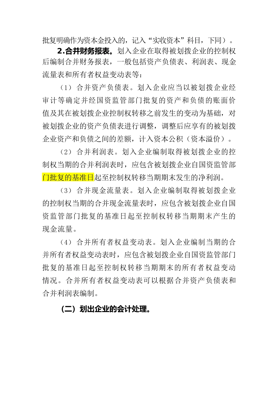附件:规范“三去一降一补”有关业务的会计处理规定一、关于国有独资或全资企业之间无偿划拨子公司的会计处理在“三去一降一补”工作中,有关企业集团出于深化国企改革或去产能、调结构等原因,按照国有资产监管部门(以下简称国资监管部门)有关规定,对所属的子公司的股权进行集团之间的无偿划拨。本规定所称的国有独资或全资企业,包括国有独资公司、非公司制国有独资企业、国有全资企业、事业单位投资设立的一人有限责任公司及其再投资设立的一人有限责任公司。国有独资或全资企业之间按有关规定无偿划拨子公司,导致对被划拨企业的控制权从划出企业转移到划入企业的,应当进行以下会计处理:(一)划入企业的会计处理。1.个别财务报表。被划拨企业按照国有产权无偿划拨的有关规定开展审计等,上报国资监管部门作为无偿划拨依据的,划入企业在取得被划拨企业的控制权之日,编制个别财务报表时,应当根据国资监管部门批复的有关金额,借记“长期股权投资”科目,贷记“资本公积(资本溢价)”科目(若批复明确作为资本金投入的,记入“实收资本”科目,下同)。2.合并财务报表。划入企业在取得被划拨企业的控制权后编制合并财务报表,一般包括资产负债表、利润表、现金流量表和所有者权益变动表等:(1)合并资产负债表。划入企业应当以被划拨企业经审计等确定并经国资监管部门批复的资产和负债的账面价值及其在被划拨企业控制权转移之前发生的变动为基础,对被划拨企业的资产负债表进行调整,调整后应享有的被划拨企业资产和负债之间的差额,计入资本公积(资本溢价)。(2)合并利润表。划入企业编制取得被划拨企业的控制权当期的合并利润表时,应包含被划拨企业自国资监管部门批复的基准日起至控制权转移当期期末发生的净利润。(3)合并现金流量表。划入企业编制取得被划拨企业的控制权当期的合并现金流量表时,应包含被划拨企业自国资监管部门批复的基准日起至控制权转移当期期末产生的现金流量。(4)合并所有者权益变动表。划入企业编制当期的合并所有者权益变动表时,应包含被划拨企业自国资监管部门批复的基准日起至控制权转移当期期末的所有者权益变动情况。合并所有者权益变动表可以根据合并资产负债表和合并利润表编制。(二)划出企业的会计处理。1.个别财务报表。划出企业在丧失对被划拨企业的控制权之日,编制个别财务报表时,应当按照对被划拨企业的长期股权投资的账面价值,借记“资本公积(资本溢价)”科目(若批复明确冲减资本金的,应借记“实收资本”科目,下同),贷记“长期股权投资(被划拨企业)”科目;资本公积(资本溢价)不足冲减的,依次冲减盈余公积和未分配利润。2.合并财务报表。划出企业在丧失对被划拨企业的控制权之日,编制合并财务报表时,不应再将被划拨企业纳入合并财务报表范围,终止确认原在合并财务报表中反映的被划拨企业相关资产、负债、少数股东权益以及其他权益项目,相关差额冲减资本公积(资本溢价),资本公积(资本溢价)不足冲减的,依次冲减盈余公积和未分配利润。同时,划出企业与被划拨企业之间在控制权转移之前发生的未实现内部损益,应转入资本公积(资本溢价),资本公积(资本溢价)不足冲减的,依次冲减盈余公积和未分配利润。二、关于即将关闭出清的“僵尸企业”的会计处理(一)即将关闭出清的“僵尸企业”自身的会计处理。根据《国务院关于钢铁行业化解过剩产能实现脱困发展的意见》(国发﹝2016﹞6号)和《国务院关于煤炭行业化解过剩产能实现脱困发展的意见》(国发﹝2016﹞7号)等文件规定,地方可以综合运用兼并重组、债务重组和破产清算等方式,加快处置“僵尸企业”,实现市场出清。企业按照政府推动化解过剩产能的有关规定界定为“僵尸企业”且列入即将关闭出清的“僵尸企业”名单的(以下简称此类“僵尸企业”),应自被列为此类“僵尸企业”的当期期初开始,对资产改按清算价值计量、负债改按预计的结算金额计量,有关差额计入营业外支出(收入)。此类“僵尸企业”不应再对固定资产和无形资产计提折旧或摊销。此类“僵尸企业”应在附注中披露财务报表的编制基础及其原因、财务报表上有关资产和负债的...