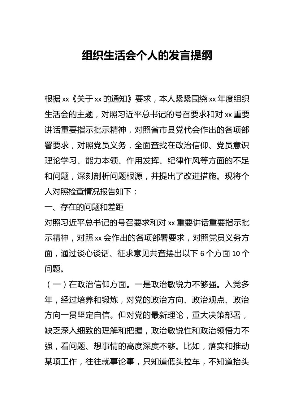 组织生活会个人的发言提纲根据xx《关于xx的通知》要求,本人紧紧围绕xx年度组织生活会的主题,对照习近平总书记的号召要求和对xx重要讲话重要指示批示精神,对照省市县党代会作出的各项部署要求,对照党员义务,全面查找在政治信仰、党员意识理论学习、能力本领、作用发挥、纪律作风等方面的不足和问题,深刻剖析问题根源,并提出了改进措施。现将个人对照检查情况报告如下:一、存在的问题和差距对照习近平总书记的号召要求和对xx重要讲话重要指示批示精神,对照xx会作出的各项部署要求,对照党员义务方面,通过谈心谈话、征求意见共查摆出以下6个方面10个问题。(一)在政治信仰方面。一是政治敏锐力不够强。入党多年,经过培养和锻炼,对党的政治方向、政治观点、政治方向一贯坚定自信。但对党的最新理论,重大决策部署,缺乏深入细致的理解和把握,政治敏锐性和政治领悟力不强,看问题、想事情的高度深度不够。比如,落实和推动某项工作,往往就事论事,只知道低头拉车,不知道抬头看路,还不能从政治上观察思考、从全局来分析研判。二是对“老百姓的幸福就是共产党的事业”理解不够融会贯通。总书记视察后,指出老百姓的幸福就是共产党的事业,本人从大的方面,认为这主要是指,坚持以人民为中心的发展理念,牢记为人民服务的宗旨。但与自己的工作实践相对照,感觉自己没有把握精髓要义,找不准工作落脚点和结合点。比如,助力乡村振兴方面缺乏创新,服务职工方面普惠性不强。(二)在党员意识方面,一是党性原则有所弱化。随着年龄增大,心态日益平和,注重求稳怕乱,对单位上的各项事务,要求不高,标准不严,如,平时对党员的教育管理不够严格,思想教育没有及时跟进,对党员的一些苗头性问题制止不力,坚持原则,敢于斗争的精气神不足。二是服务大局的意识有所减退。自认为在群众团体工作,单位小、人员少,优势资源缺,只要抓好本职工作,种好一亩三分地就可,过于维系xx小圈子,对涉及全县性的重点工作、中心工作,参与少,配合的少,抓主抓重服务大局的意识不够强。如,慰问困难企业摸排不准,覆盖面不广。助力小微企业发展不够,小微企业xx经费没有及时返还。(三)在理论学习方面。一是理论学习的深度和广度不够往往通过中心组学习、单位集体学习和个人网上学习,习惯于完成规定篇目和重点理论的学习,学的不深,学的不精,学的不广。比如,学习往往看看目录,读读标题,蜻蜓点水,浅尝辄止。二是理论联系实际指导工作能力不强平时也积累了一定的理论和业务知识,但在实际工作当中常常学用脱节,没有将最新理论成果转化为自己的行动指南,存在理论和实践两张皮的现象。如,对如何传承和弘扬劳模精神发挥劳模的示范引领作用方面,缺乏深入思考。(四)能力本领方面。一是适应新形势新要求的能力不强随着社会的快速发展,信息网络日新月异,自己所学的知识老化,观念陈旧,跟不上形势发展的快节奏,赶不上时代变迁的新要求,还需要进一步更新观念,提升能力。如对“xx”行动理解不够,推进缓慢。二是敢创敢干的创新能力薄弱。经历过的事情越多,思想上越发求稳怕乱,步调上按部就班,瞻前顾后、徘徊观望的状态时有发生。如,推进新就业形态建会入会方面,缺乏创新,畏难不前,进展缓慢。经常性开展作风教育、纪律教育、廉洁教育、警示教育不够,用典型案例教育党员干部切实做到拒腐防变的思想自觉和行动自觉还有差距。(五)作用发挥方面。主要存在示范引领、争先创优的意识减弱。受自身传统思想约束,平稳低调个性养成,工作上往往四平八稳、按部就班,局限于完成上级部署的规定任务,对如何发挥党员的先锋模范作用,一把手的示范引领作用考虑不够,措施薄弱,导致一些工作处于一般化水平,缺乏亮点特色。如户外站点建设,标准不高、管理松散,使用率不高。(六)在纪律作风方面。主要存在对党员干部的教育管理不够严格。谈心谈话不够经常、集体约谈多、个别面谈少特别是在抓早抓小、防微杜渐方面还不够到位,精准落实“咬耳朵、扯袖子、敲警钟”方面还有差距。对“四风”问题的顽固性、反复性认识不足,工作中还不同程度存在形式主义的现象。比如,廉政约谈针对性不...