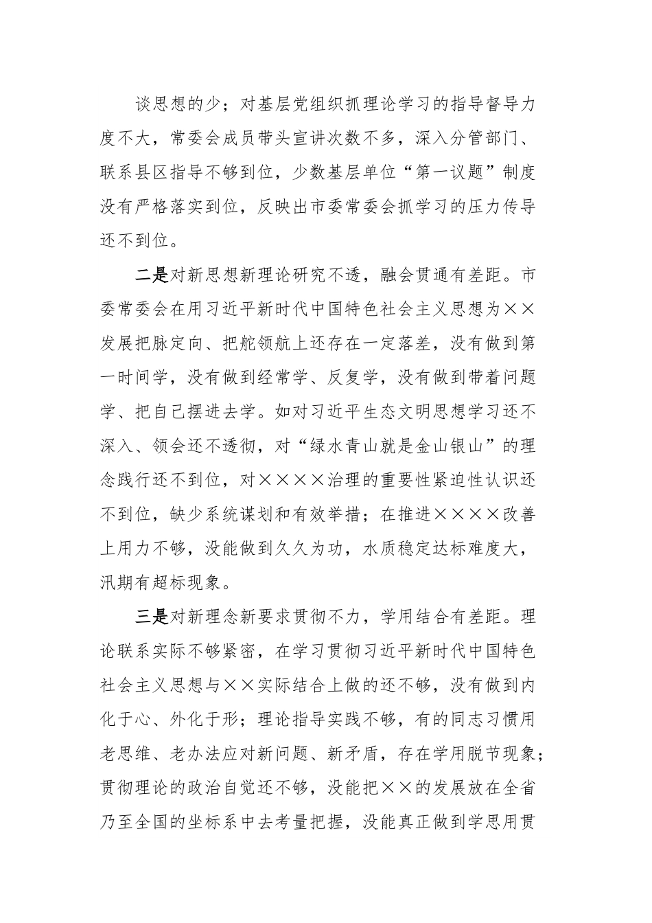 市委班子民主生活会对照检查材料(六个方面)根据中央及省委、市委部署,市委常委会扎实开展学习贯彻习近平新时代中国特色社会主义思想主题教育,牢牢把握“学思想、强党性、重实践、建新功”总要求,教育引导全县党员干部树立正确的政绩观,不断增强推动高质量发展、服务群众和防范化解风险的能力本领,切实做到以学铸魂、以学增智、以学正风、以学促干。会前,市委常委会聚焦会议主题,精心组织学习,深入谈心谈话,深刻剖析原因,确保站位高、画像准、辣味足,为开好主题教育专题民主生活会打牢基础。现将对照检查情况报告如下。一、存在问题(一)对照“六个方面”自查情况。1、学习贯彻习近平新时代中国特色社会主义思想方面。一是对学理论强党性抓得不紧,学懂弄通有差距。市委理论学习中心组学习每次安排的内容过多,只做简单的传达,没有深度解读,没有做到学原文悟原理;学习形式单一,满足于完成规定动作,针对短板弱项,结合自身实际,有针对性的专题学习开展较少,开展主题教育读书班等集中学习较多,以会议学习、领导传达为主,现场教学、异地学习、专家授课次数较少;组织班子成员专题研讨交流较少,交流研讨深度不够,有的同志发言质量不高,谈业务的多,讲体会、谈思想的少;对基层党组织抓理论学习的指导督导力度不大,常委会成员带头宣讲次数不多,深入分管部门、联系县区指导不够到位,少数基层单位“第一议题”制度没有严格落实到位,反映出市委常委会抓学习的压力传导还不到位。二是对新思想新理论研究不透,融会贯通有差距。市委常委会在用习近平新时代中国特色社会主义思想为××发展把脉定向、把舵领航上还存在一定落差,没有做到第一时间学,没有做到经常学、反复学,没有做到带着问题学、把自己摆进去学。如对习近平生态文明思想学习还不深入、领会还不透彻,对“绿水青山就是金山银山”的理念践行还不到位,对××××治理的重要性紧迫性认识还不到位,缺少系统谋划和有效举措;在推进××××改善上用力不够,没能做到久久为功,水质稳定达标难度大,汛期有超标现象。三是对新理念新要求贯彻不力,学用结合有差距。理论联系实际不够紧密,在学习贯彻习近平新时代中国特色社会主义思想与××实际结合上做的还不够,没有做到内化于心、外化于形;理论指导实践不够,有的同志习惯用老思维、老办法应对新问题、新矛盾,存在学用脱节现象;贯彻理论的政治自觉还不够,没能把××的发展放在全省乃至全国的坐标系中去考量把握,没能真正做到学思用贯通、知信行统一。如在推进长三角一体化发展上,存在等、靠思想,主动靠上去、精准接上去、全力融进去的谋划还不深、推进还不快、招数还不多,主动到沪苏浙等先发地区高位推进、高层对接次数较少,在项目谋划、产业承接、平台搭建、优势互补上,缺乏前瞻性思考和实质性突破。2、维护党中央权威和集中统一领导方面。一是贯彻中央决策部署的行动自觉还不强。对标对表有差距,中央要求不做的、能够做到坚决不做,中央要求做到的、落实上还有差距,如在向中央看齐上,市委换届后,没有及时出台关于加强新一届市委班子政治建设、加强市委常委会自身建设等相关文件;紧跟紧随有差距,对中央决策部署没有做到第一时间传达贯彻、第一时间拿出方案、第一时间推动落实,市委常委会未系统学习中央关于推动长三角一体化发展的决策部署,没有及时研究制定对标学习沪苏浙政策举措总体方案;落细落实有差距,贯彻执行有照搬照抄、机械执行现象,对意识形态领域斗争的严峻性、复杂性认识还有不足,抓意识形态工作的力度还不够,成效还不明显,市委落实意识形态工作责任制还有短板,隐患排查、风险防范责任体系还不完善,督促检查、考核通报还不严格,少数单位新闻“三审”制度落实不到位、信息发布审核不严格,网络意识形态安全有待进一步加强;保密管理制度执行不够严实,还发生了网络泄密事件。二是贯彻中央决策部署的推进力度还不大。市委常委会在完整、准确、全面贯彻新发展理念上,谋划不够深,推动不够快,还存在“本位主义”思想,遇事没有做到先算大账、再算小账,先算长远账、再算眼前账,有时选择性执行,有时执行中打...