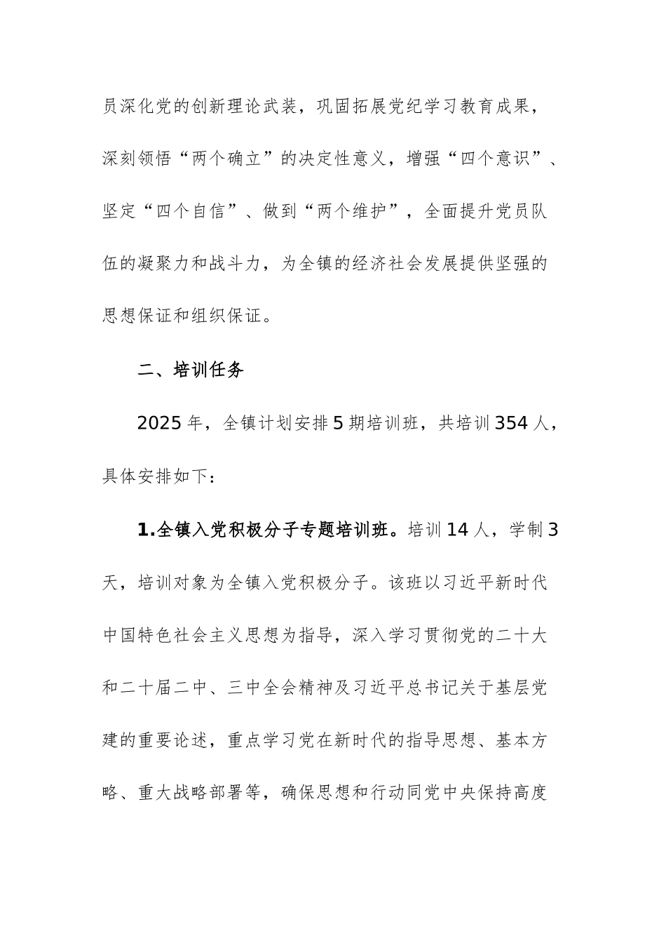 2025年度党员教育全员培训计划例文为深入学习贯彻习近平新时代中国特色社会主义思想,深刻领会习近平总书记关于党的建设的重要思想和党的二十届三中全会精神,进一步加强乡镇党员队伍的思想建设和组织建设,提升党员的政治素质、业务能力和党性修养,对照《全国党员教育培训工作规划(2024-2028年)》各项目标任务,紧紧围绕X镇中心工作和基层党建重点任务,结合本乡镇实际,制定2025年度X镇党员教育全员培训计划。一、总体要求2025年度全镇党员教育重点培训工作坚持以习近平新时代中国特色社会主义思想为指导,把党性教育和理想信念教育贯穿始终,旨在通过系统、全面的培训,使全体党员深化党的创新理论武装,巩固拓展党纪学习教育成果,深刻领悟“两个确立”的决定性意义,增强“四个意识”、坚定“四个自信”、做到“两个维护”,全面提升党员队伍的凝聚力和战斗力,为全镇的经济社会发展提供坚强的思想保证和组织保证。二、培训任务2025年,全镇计划安排5期培训班,共培训354人,具体安排如下:1.全镇入党积极分子专题培训班。培训14人,学制3天,培训对象为全镇入党积极分子。该班以习近平新时代中国特色社会主义思想为指导,深入学习贯彻党的二十大和二十届二中、三中全会精神及习近平总书记关于基层党建的重要论述,重点学习党在新时代的指导思想、基本方略、重大战略部署等,确保思想和行动同党中央保持高度一致;学习党的章程与制度,了解党的性质、宗旨、纲领、组织原则、纪律要求等,明确党员的基本条件、义务和权利;学习党的光辉历程,回顾党的奋斗历程和伟大成就,增强对党的认同感和归属感。通过理论学习、案例分析、小组讨论等形式,增强党性观念和组织纪律性,培养正确的世界观、人生观和价值观。2.全镇后备村干部培训班。培训58人,学制3天,培训对象为2025年村“两委”换届村干部后备力量。该班坚持把培养村级后备力量作为农村基层组织建设的重要工作,培训内容主要包括深入学习党的最新理论成果和方针政策,确保后备村干部能够准确把握国家发展方向和政策导向;学习法律法规知识,讲解与农村工作密切相关的法律法规,提高后备村干部的法律意识和依法办事能力;学习现代农业与经济发展,介绍现代农业技术、农业产业化和农产品市场营销知识,引导后备村干部推动农村经济发展;学习基层治理与矛盾调解,强化后备村干部在村级事务中的决策、执行和监督能力,学习矛盾纠纷排查化解的方法和技巧,全面提升后备村干部的综合素质和履职能力。3.全镇社区党员培训班。培训40人,学制3天,培训对象为X社区和X社区党员。该班旨在学习贯彻习近平总书记关于基层治理的重要论述,提升基层党建引领基层治理效能等,引导社区党员提高参与基层治理、为民办事服务等方面能力。重点学习社区治理与服务,结合社区实际,学习社区治理、服务群众、矛盾调解等方面的知识和技能,提升党员在社区工作中的履职能力;学习先进典型,组织学习优秀党员的先进事迹,发挥榜样引领作用,激发党员的干事创业热情。通过培训全面提升乡镇社区党员的综合素质和履职能力,更好地服务社区居民。4.全镇农村党员培训班。培训190人,学制3天,培训对象为全镇60岁以内长期在家党员,该班旨在学习贯彻习近平总书记关于“三农”工作的重要论述。重点学习政策法规解读,包括党建引领信用村建设、医保和养老保险收缴等惠农政策;开展党性教育,通过红色文物故事、警示教育片等形式,坚定党员的理想信念,提升党性修养。通过培训旨在打造一支政治坚定、素质过硬、作用突出的农村党员队伍。结合学习运用“千万工程”经验、推动乡村全面振兴等,注重实战技能培训,引导农村党员在服务群众中作表率、在承担急难险重任务时打头阵。5.全镇机关党员培训班。培训49人,学制3天,培训对象为全镇机关党员干部。该班重点学习贯彻习近平总书记关于机关党建的重要讲话和重要指示批示精神,结合以深化党的建设制度改革推动机关党建高质量发展,建设让党中央放心、让人民群众满意的模范机关等,注重加强党纪党规教育,组织学习《中国共产党纪律处分条例》《中国共产党廉洁自律准则》等重要党纪法规,通过观看警示教育片等形式...